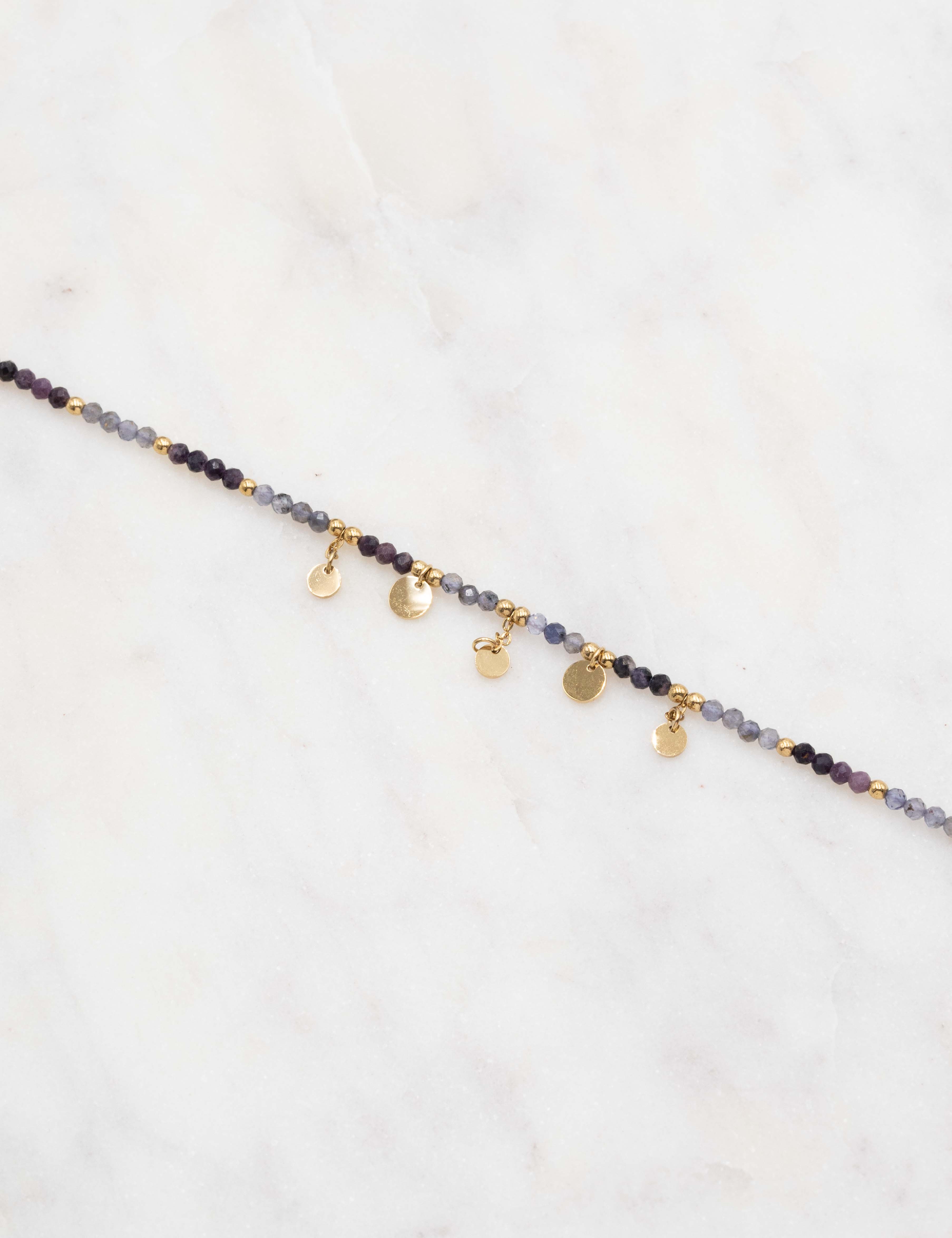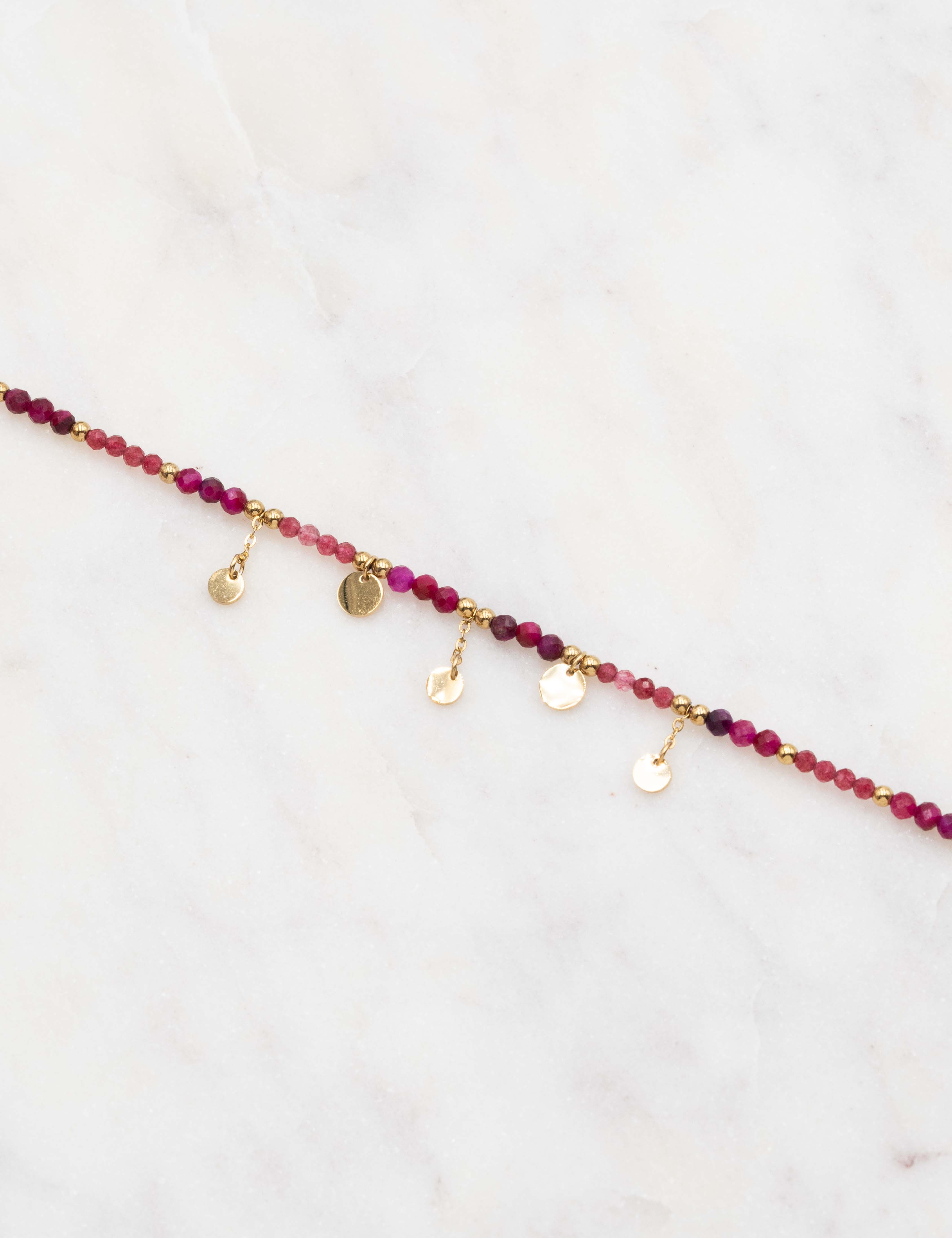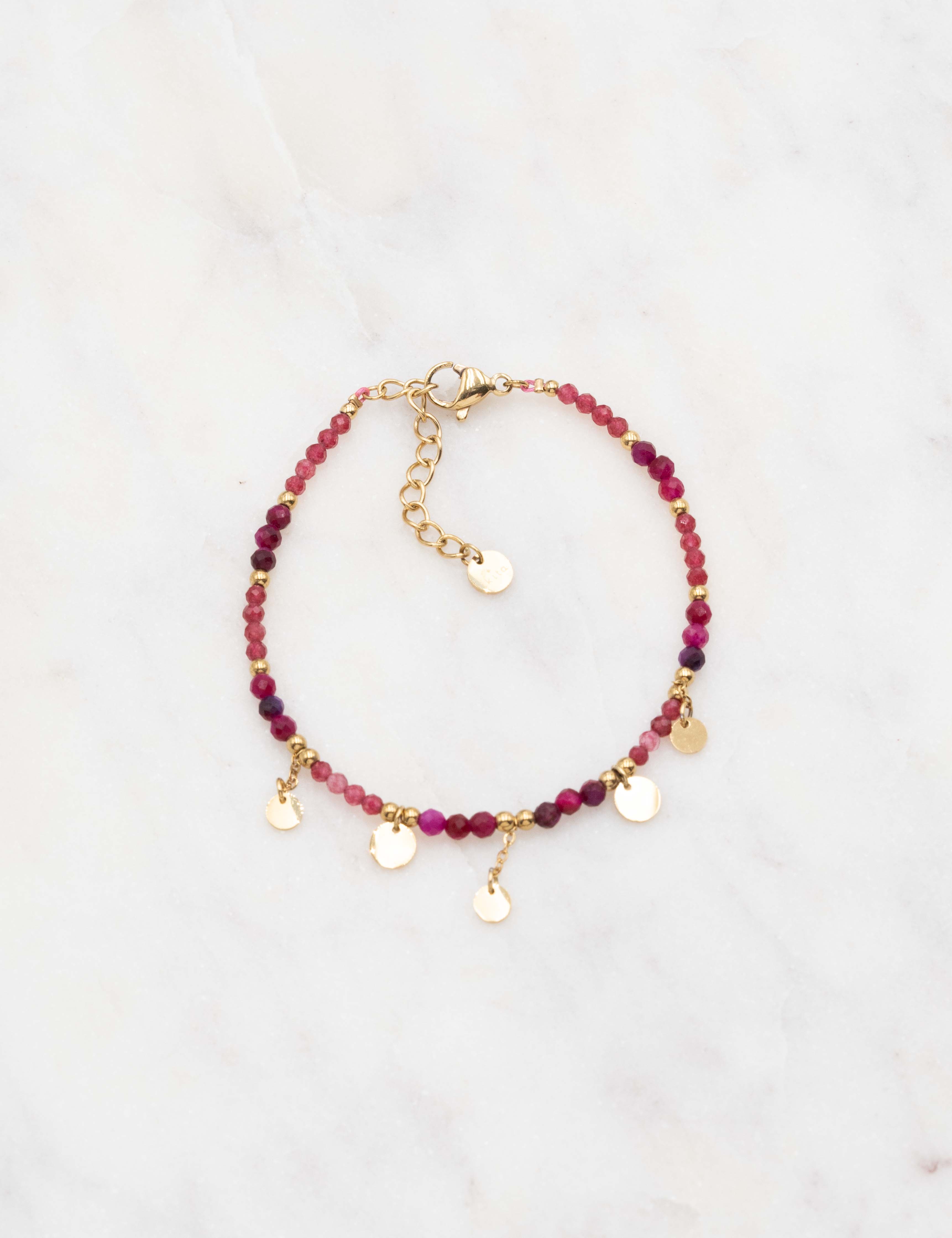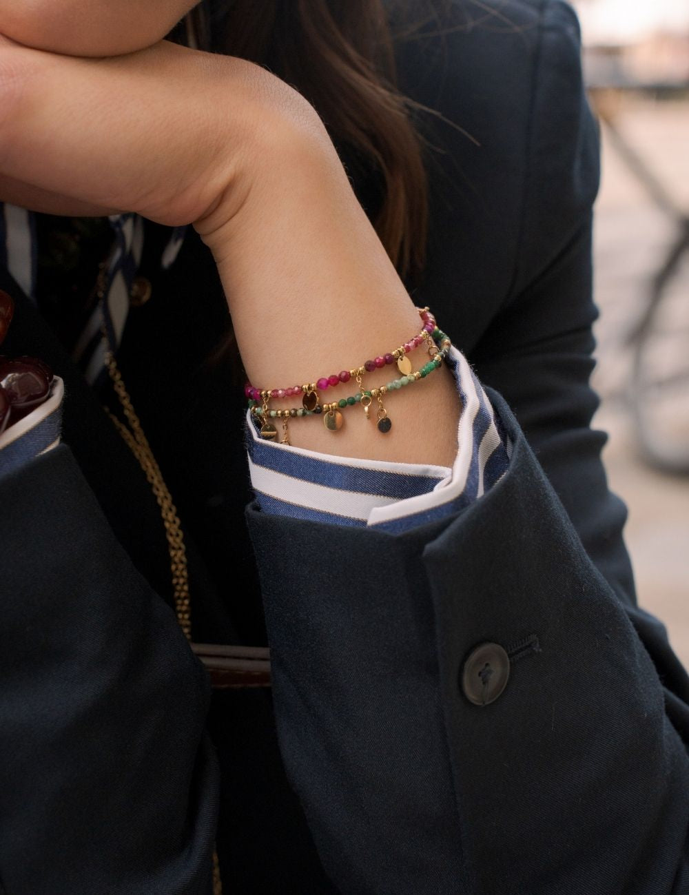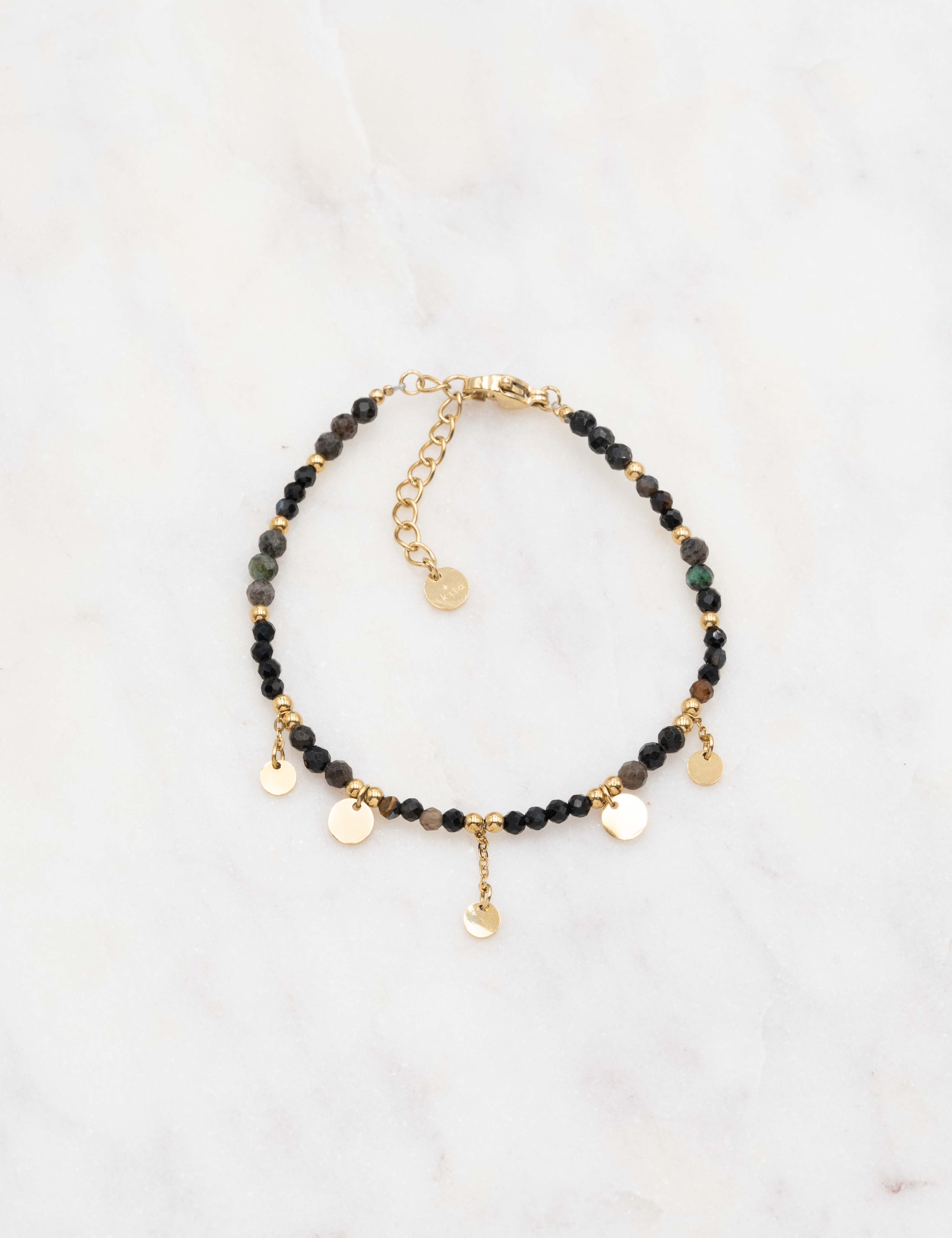 Bracelet réglable composé d'un joli enfilage de perles en pierres naturelles, de chaines ornées de pampilles rondes dorées.