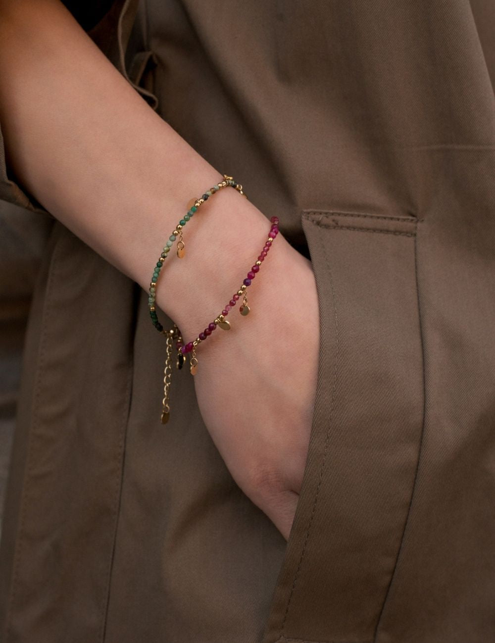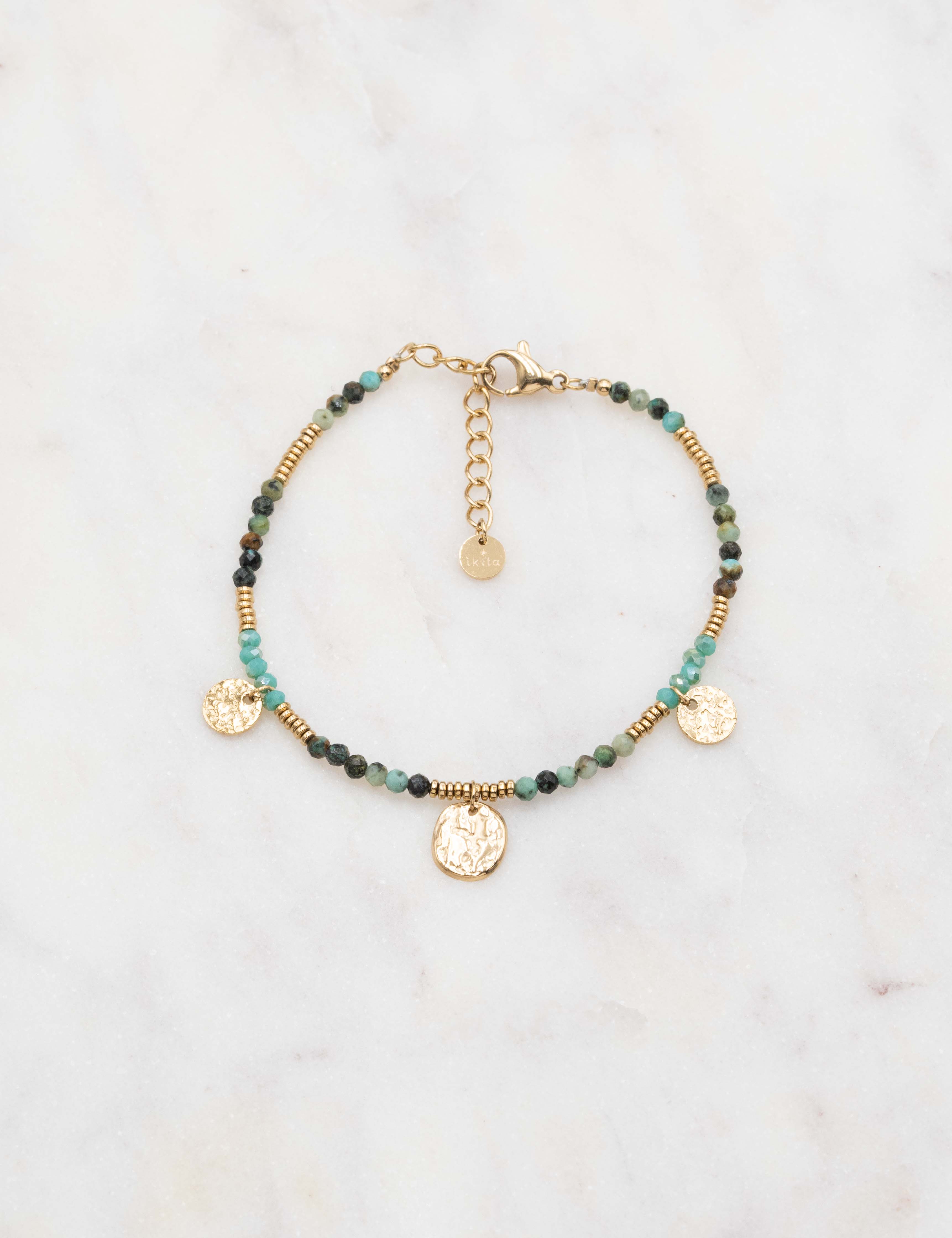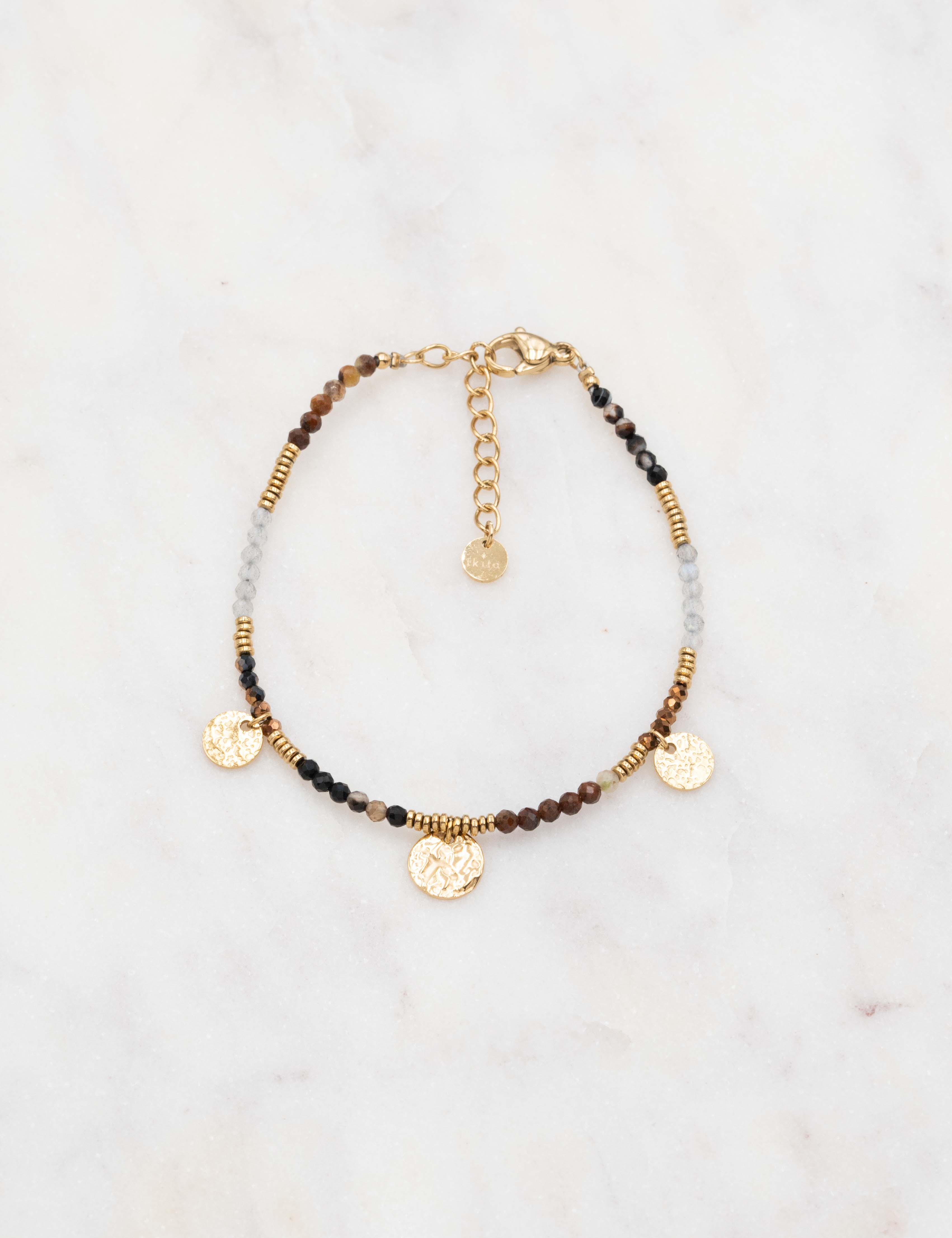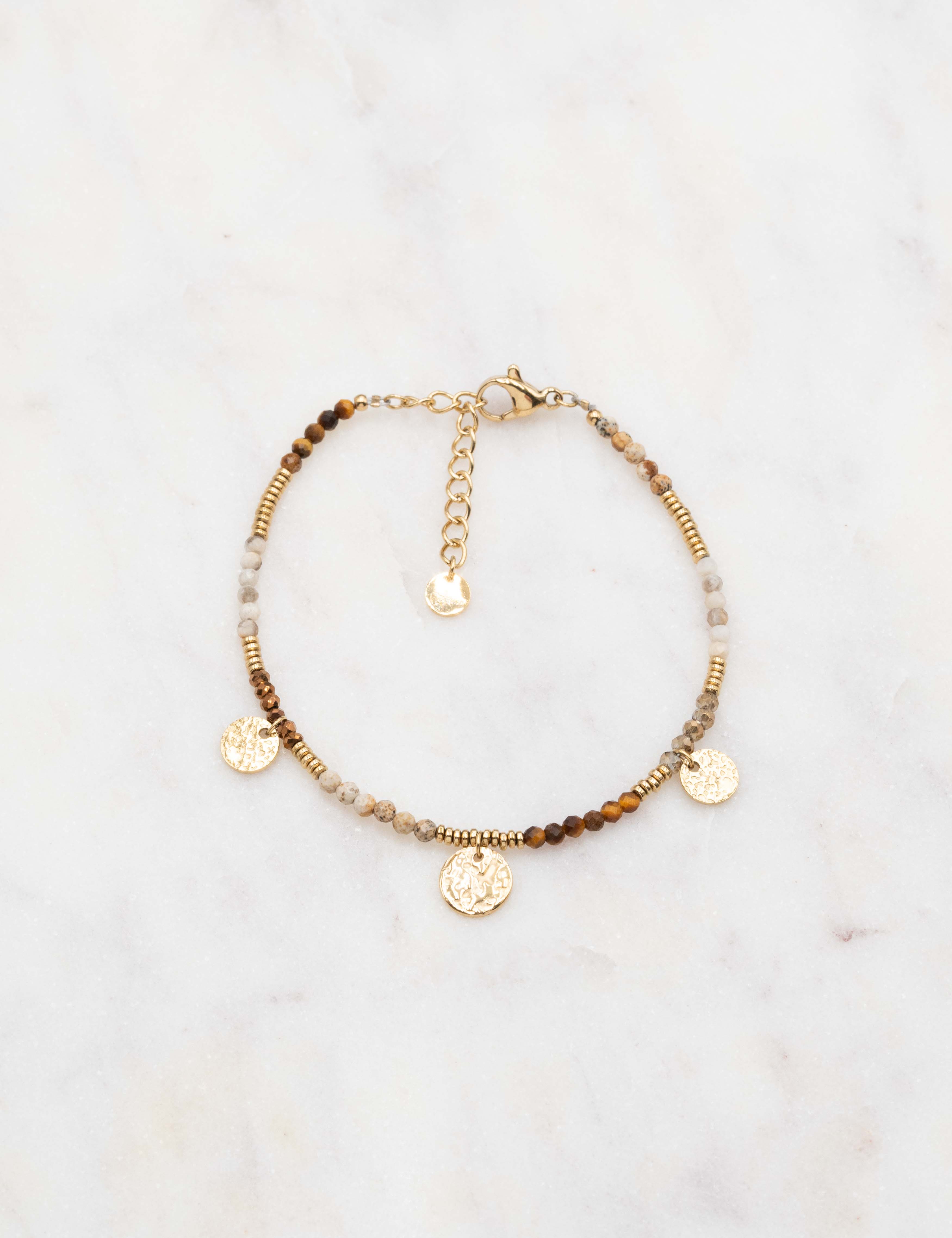 Bracelet réglable composé d'un joli enfilage de perles en pierres naturelles et de pampilles rondes dorées martelées.