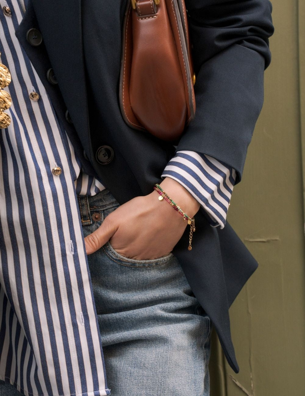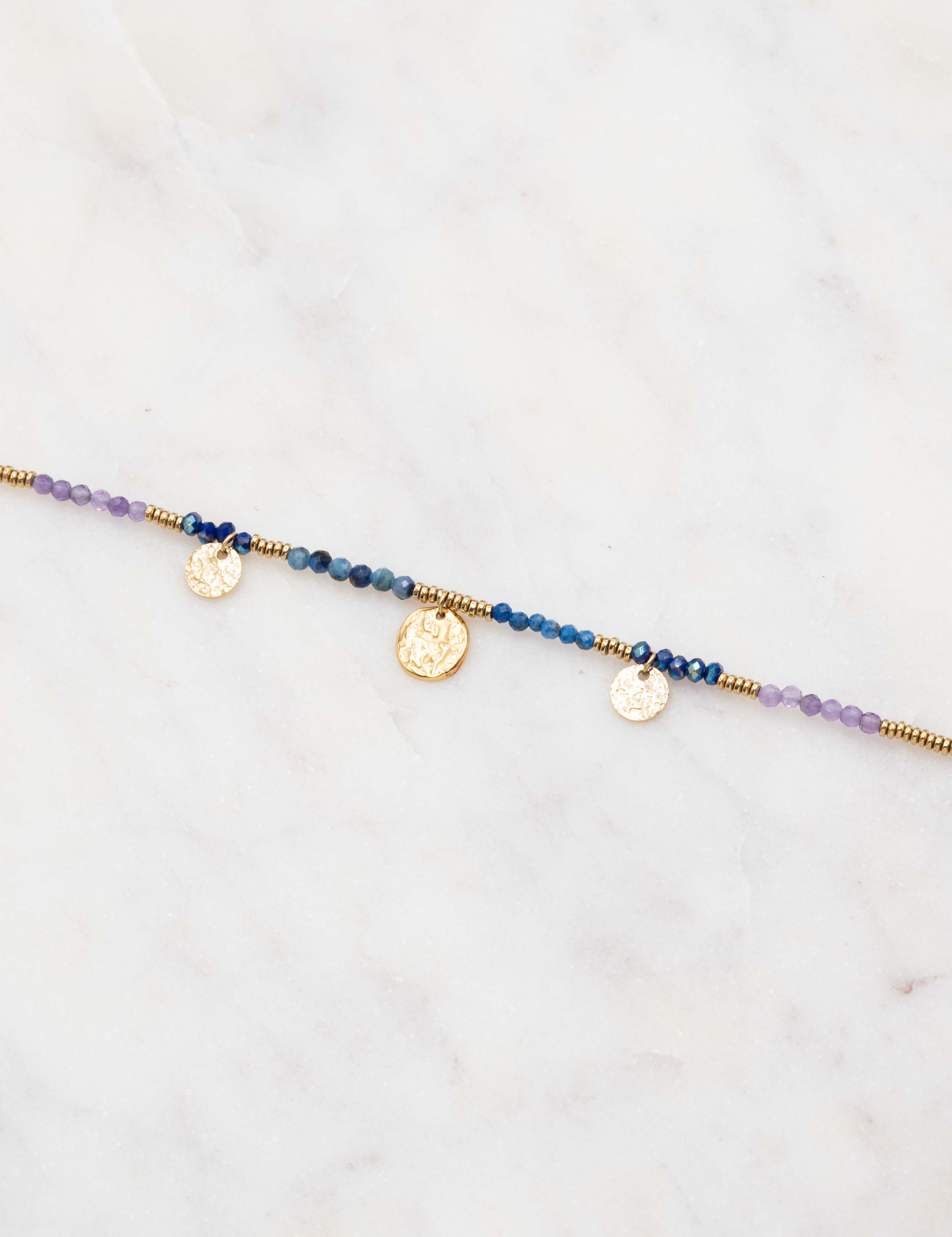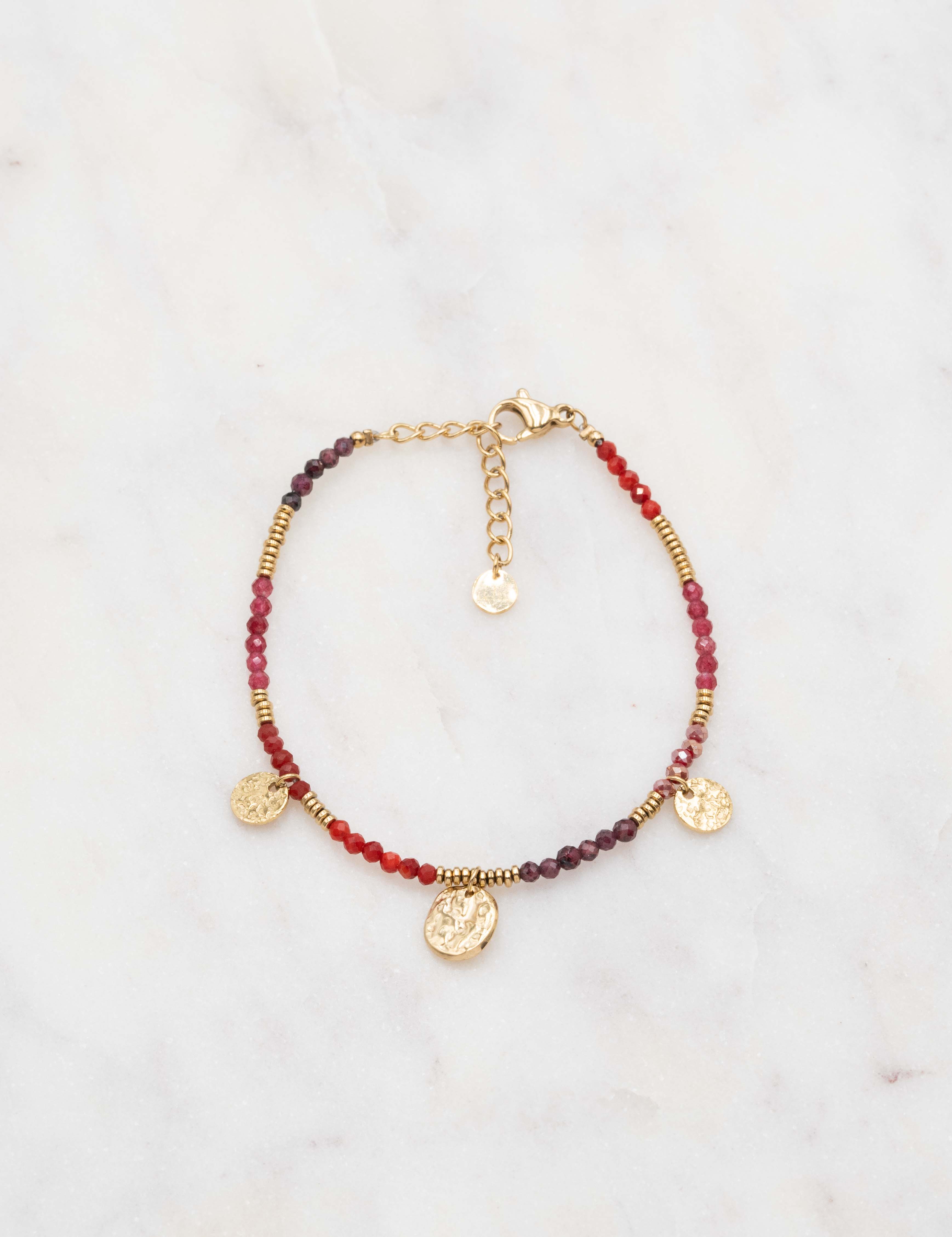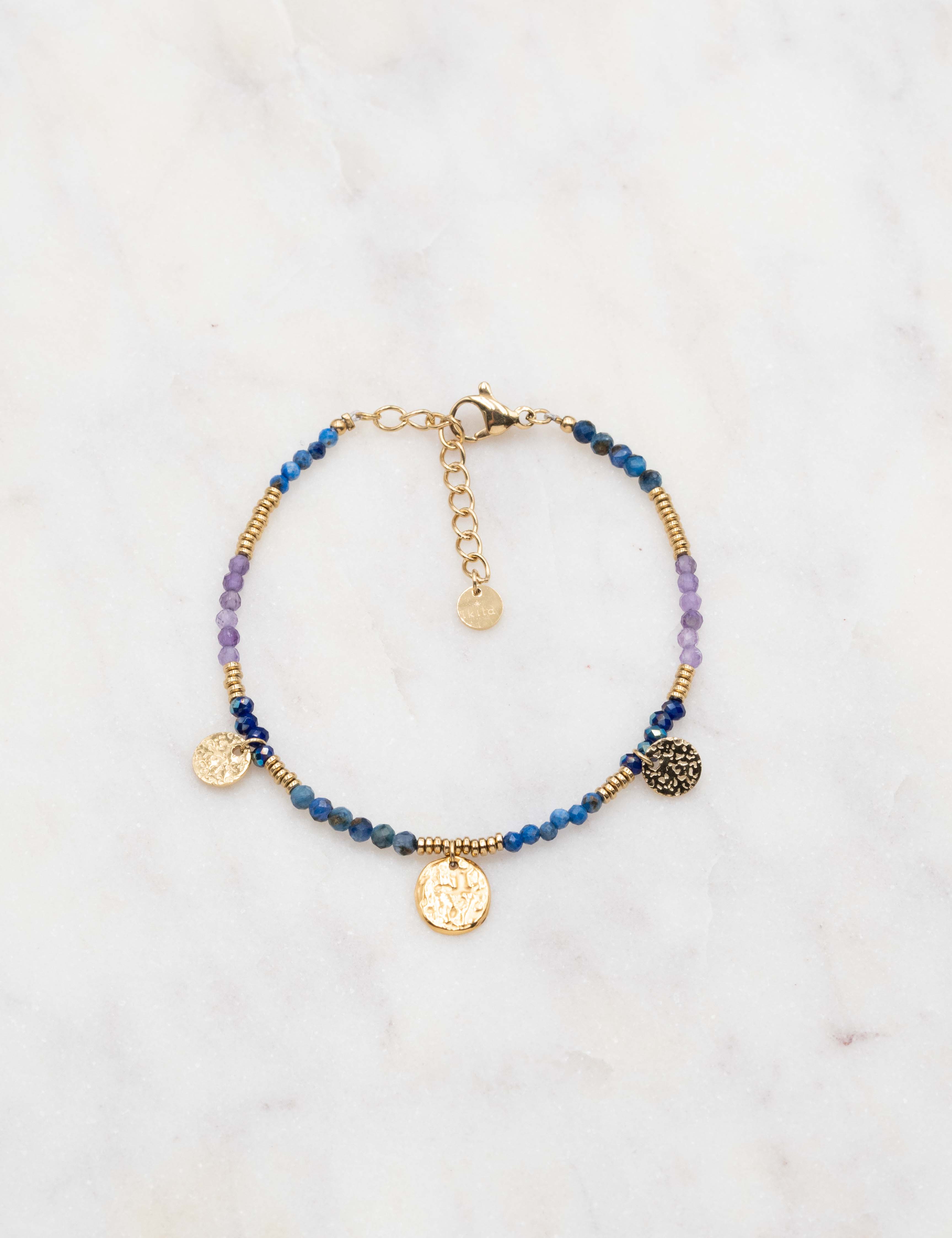 Bracelet réglable composé d'un joli enfilage de perles en pierres naturelles et de pampilles rondes dorées martelées.