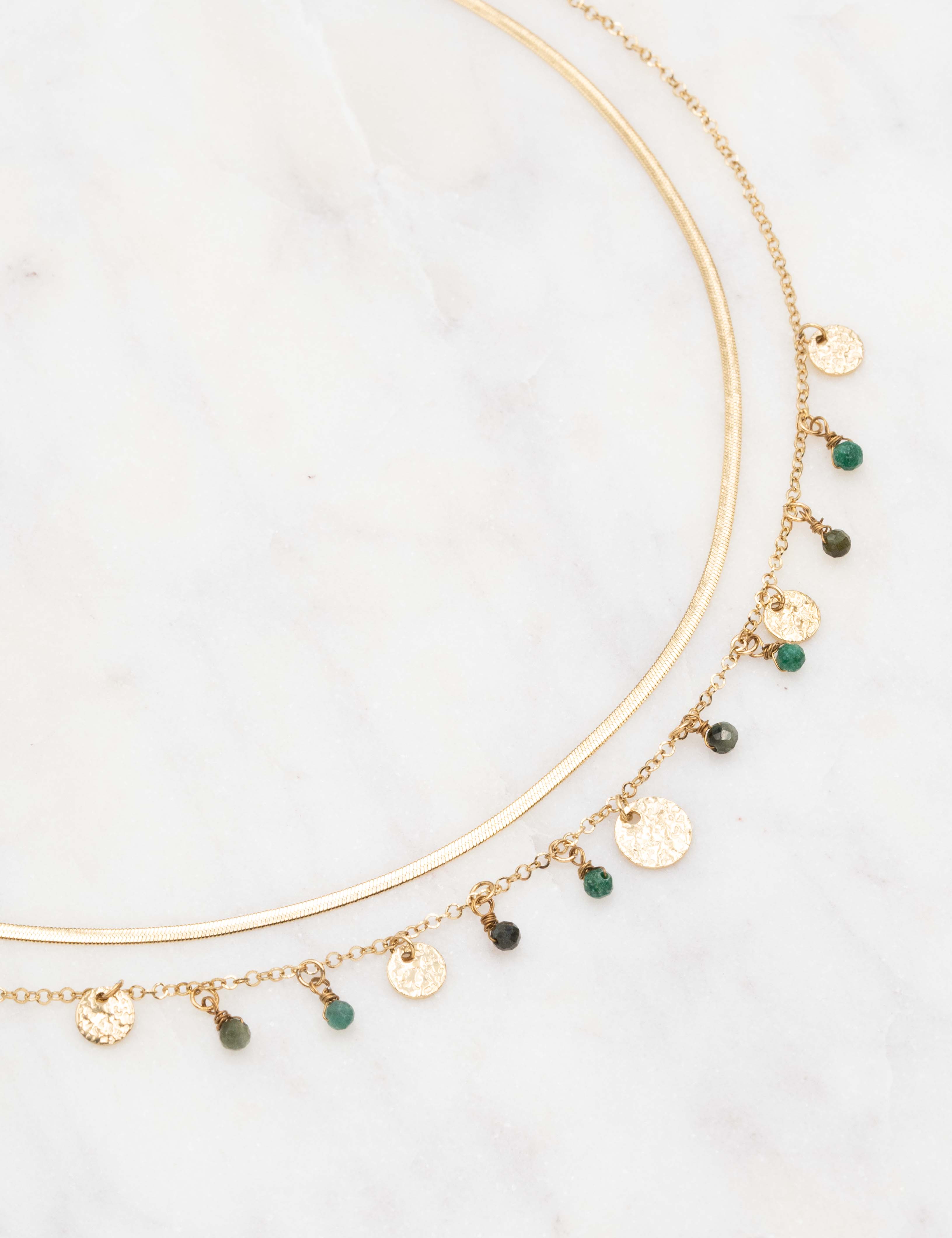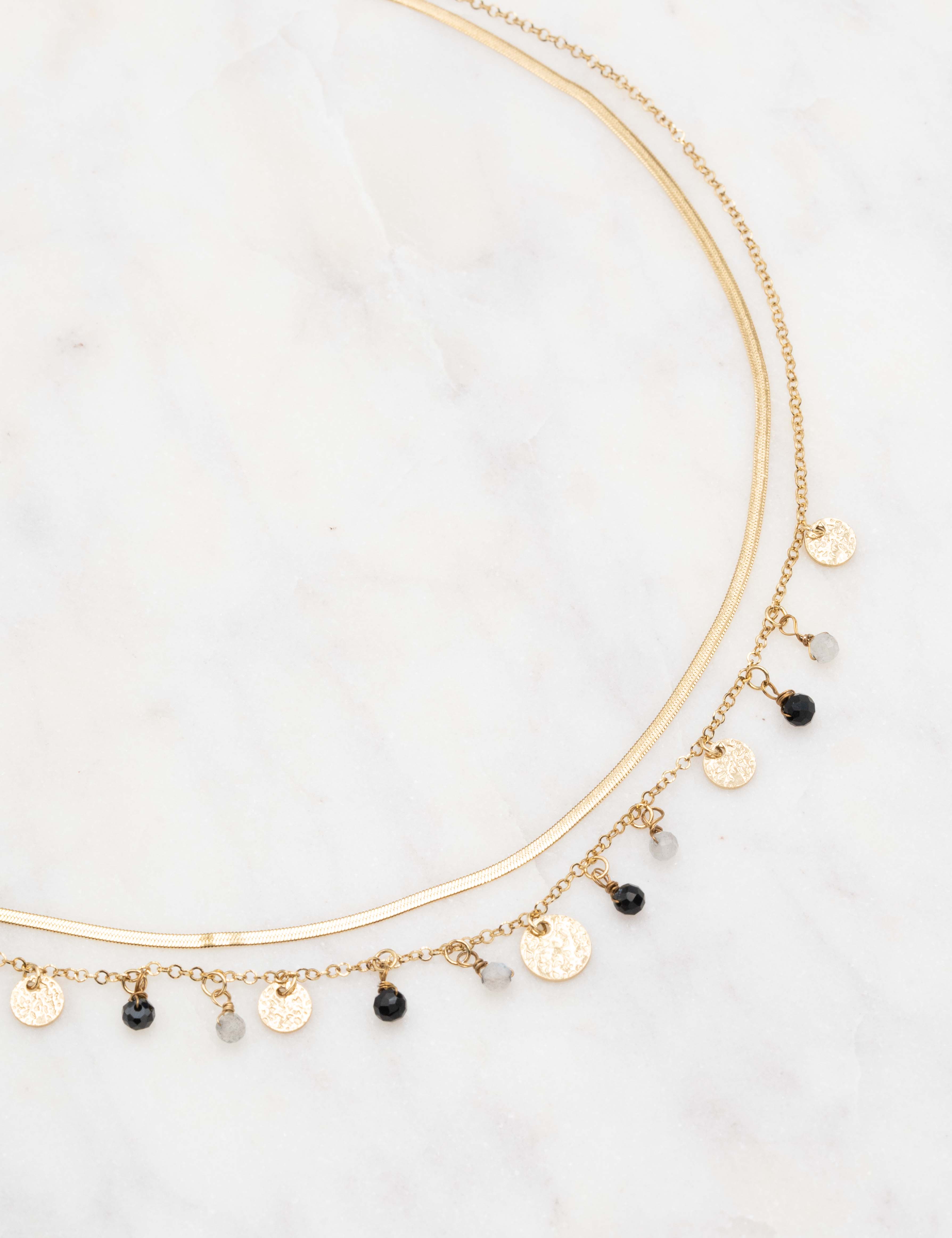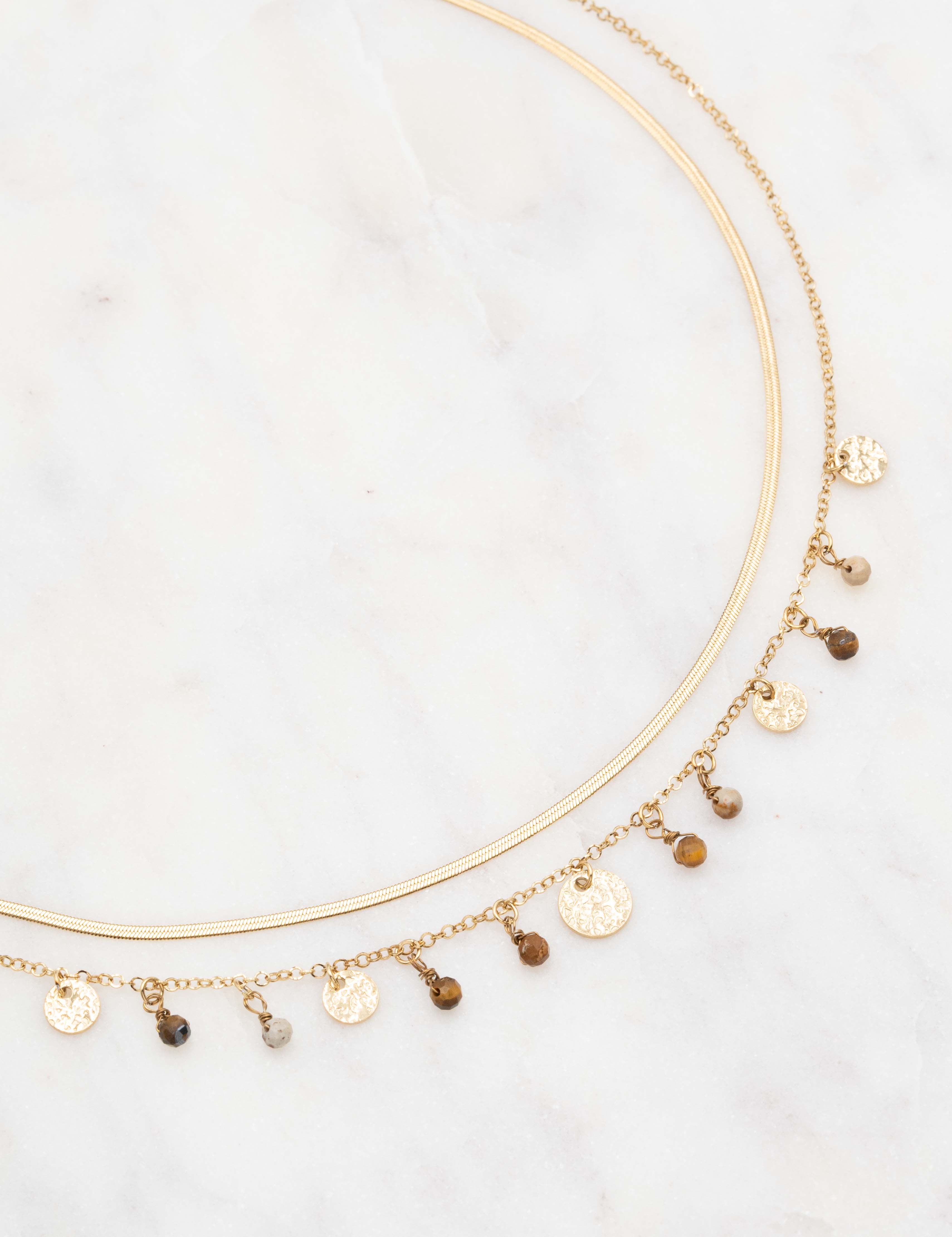 Collier réglable double rangs composé d'une maille miroir et d'une chaine ornée de pierres naturelles, pate de verre et de pampilles rondes dorées martelées.