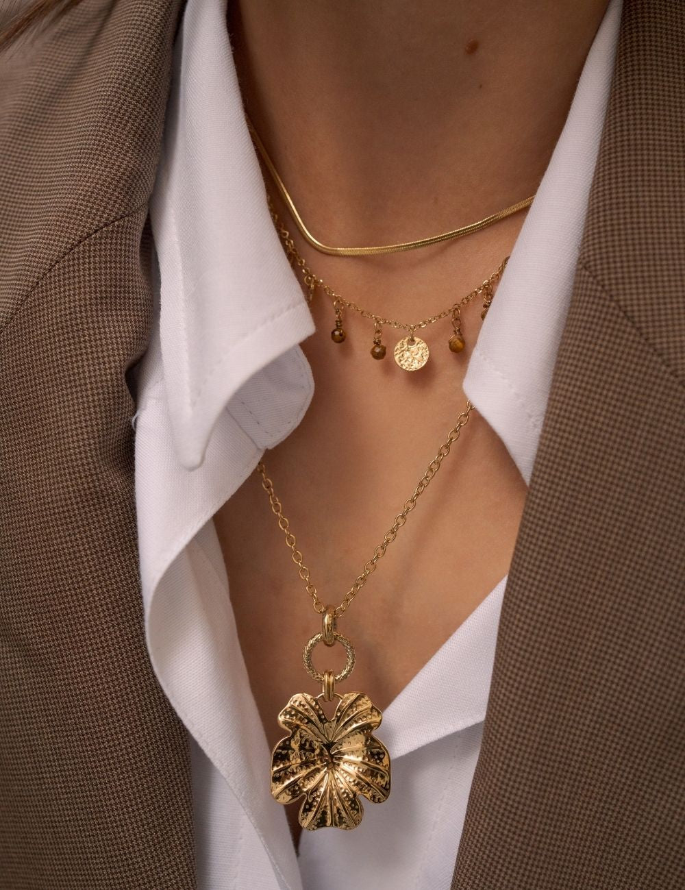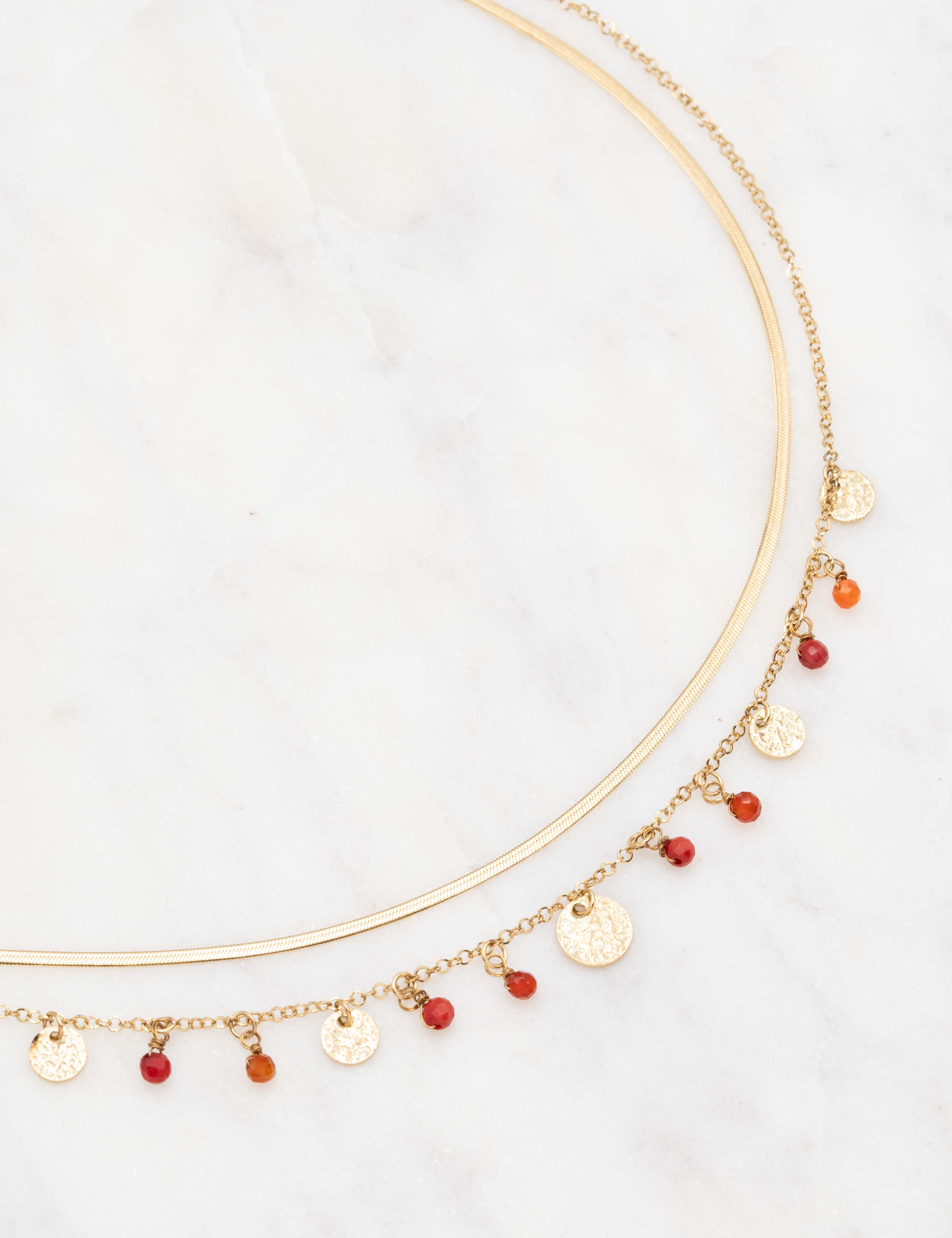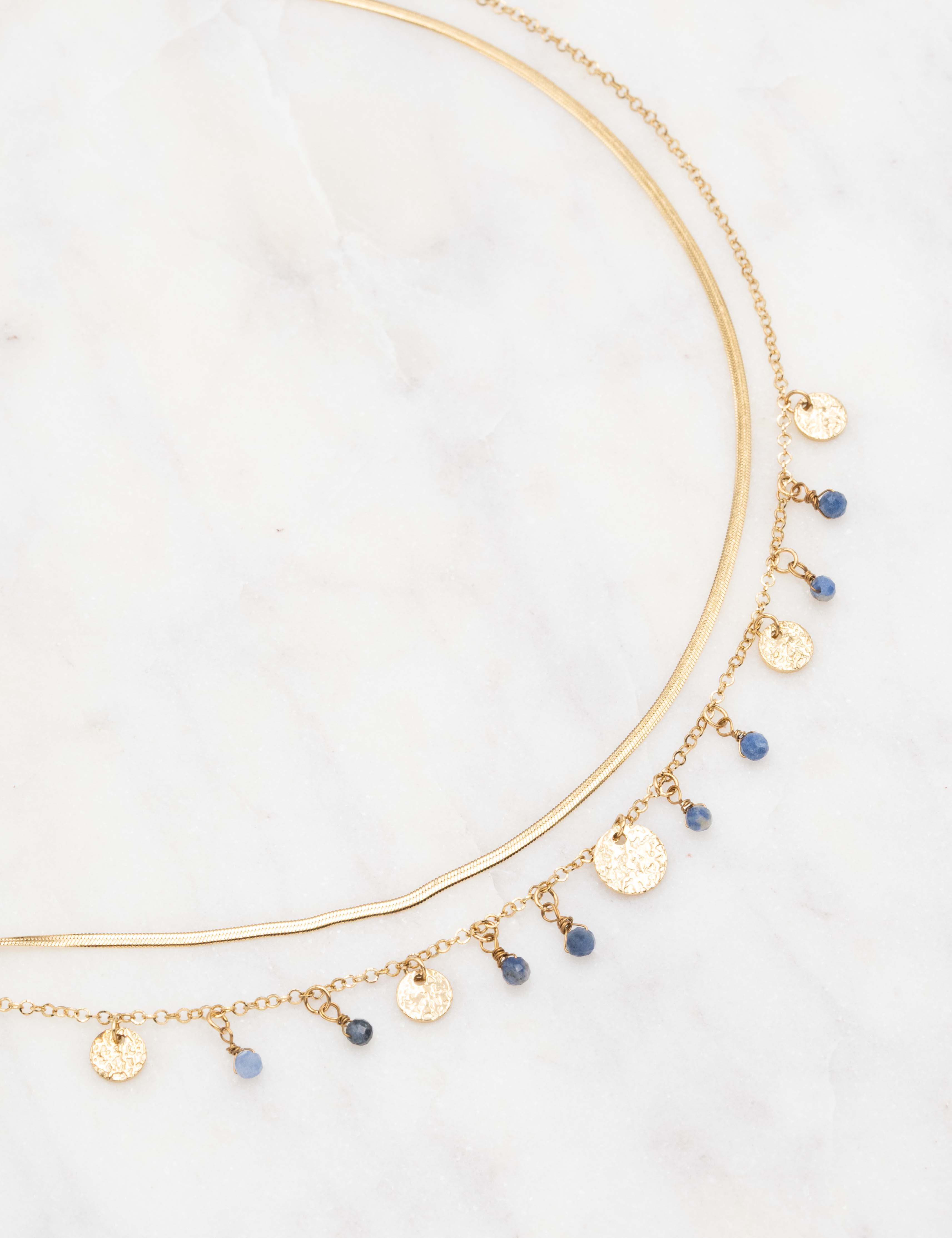 Collier réglable double rangs composé d'une maille miroir et d'une chaine ornée de pierres naturelles, pate de verre et de pampilles rondes dorées martelées.