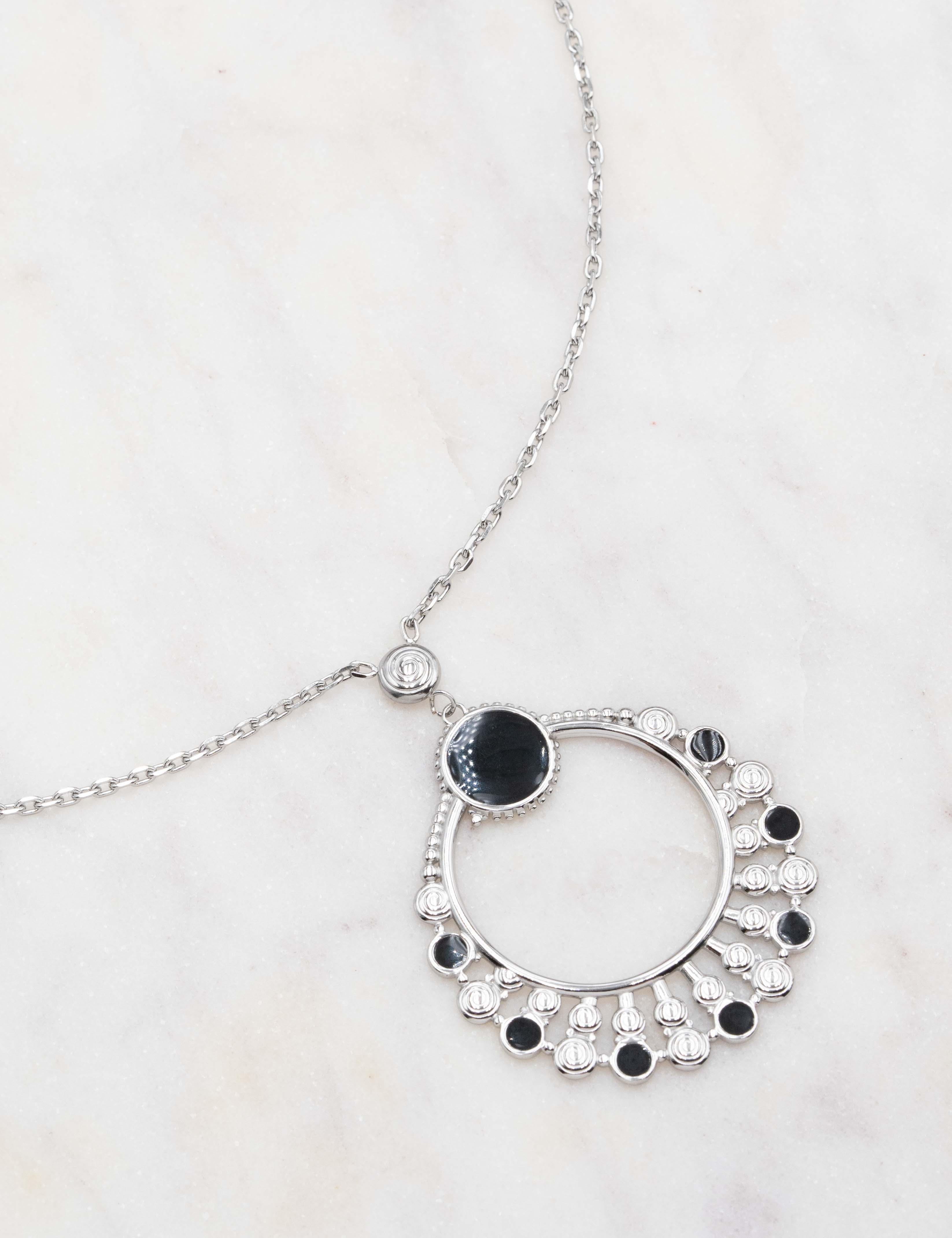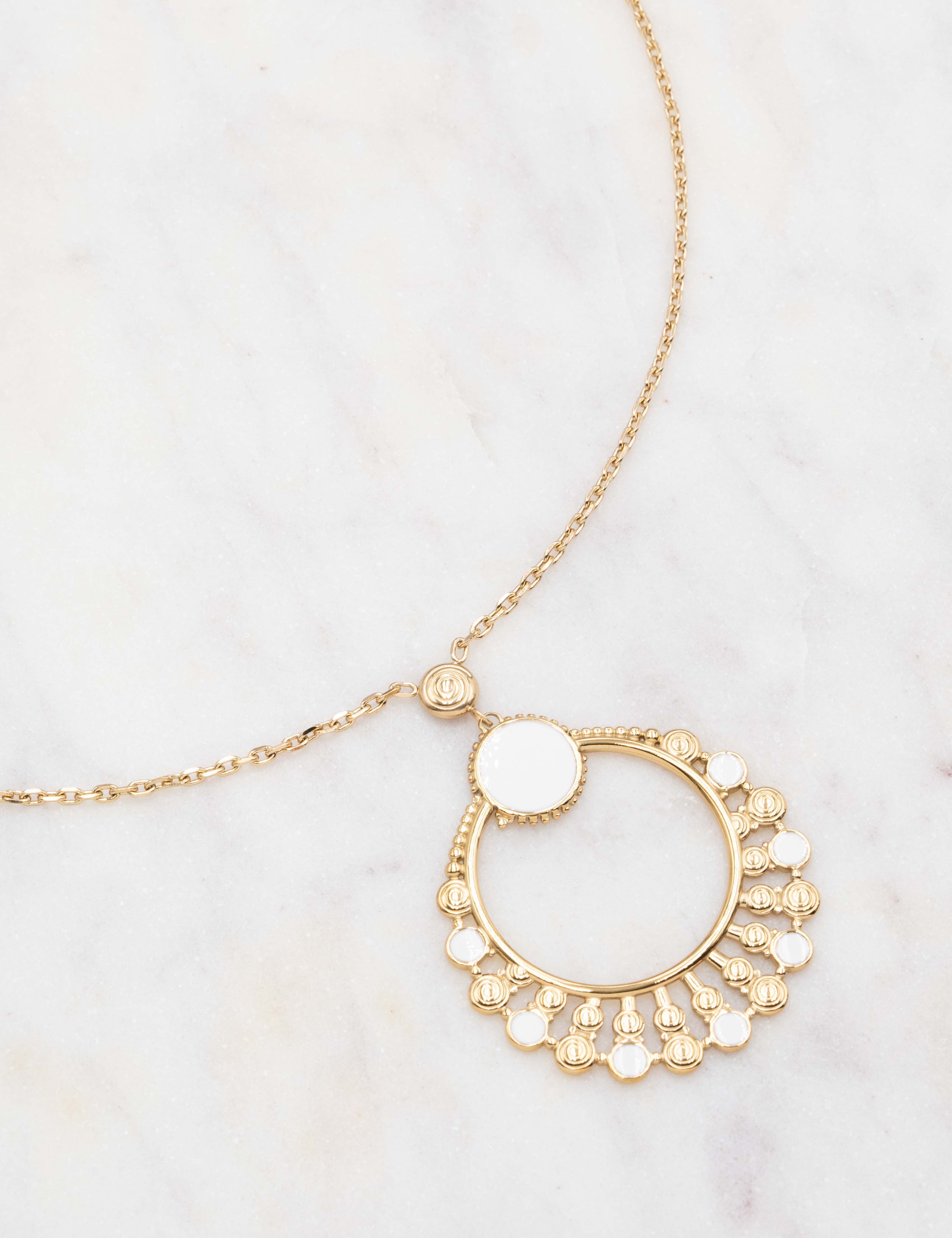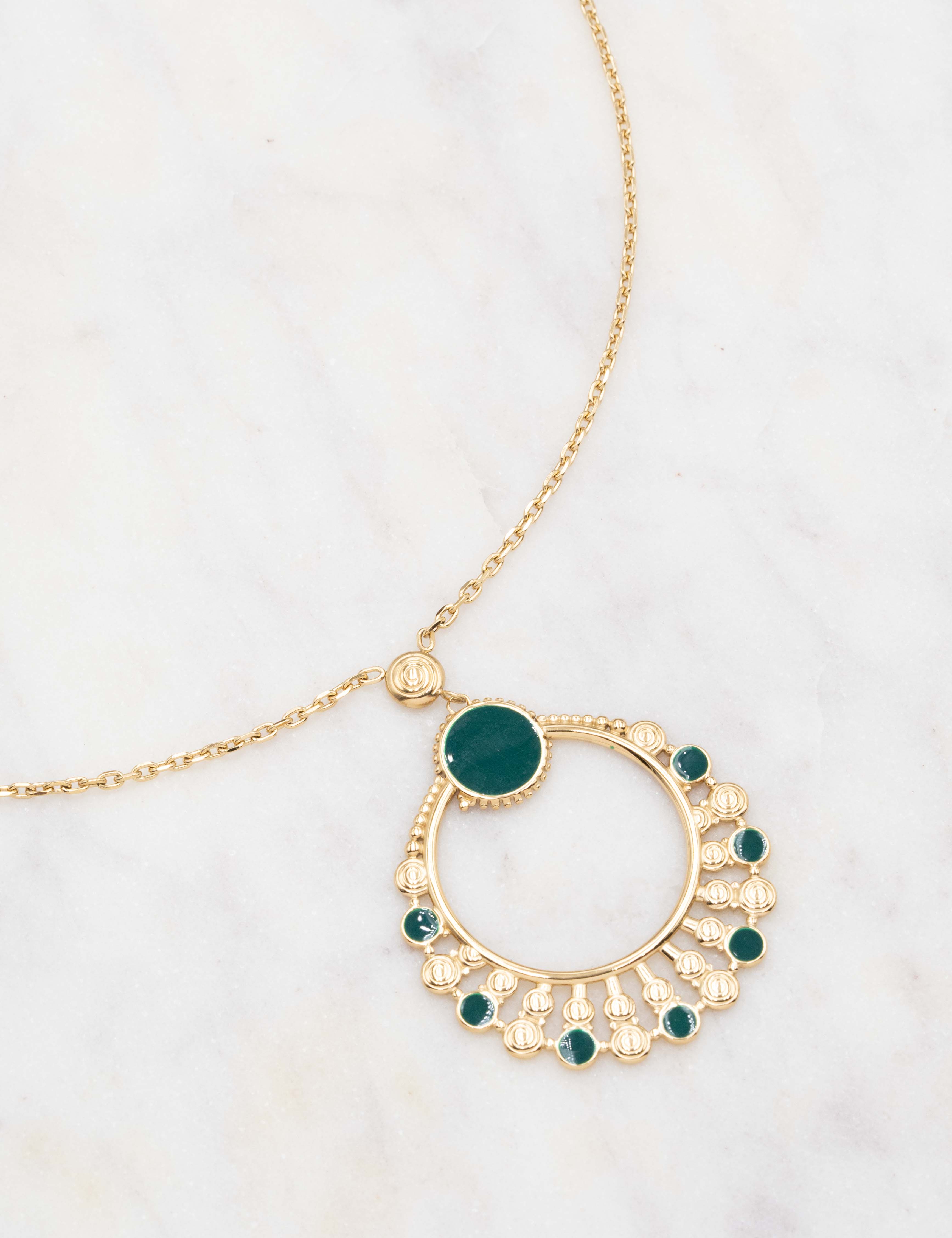 Collier réglable style sautoir composé d'une pièce ajourée stylisée (motifs tourbillon) embellie de touches émaillées colorées.