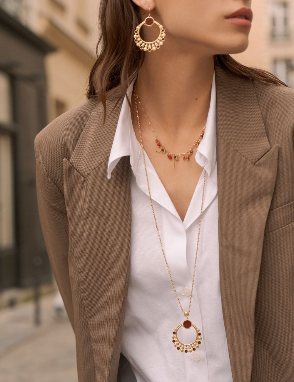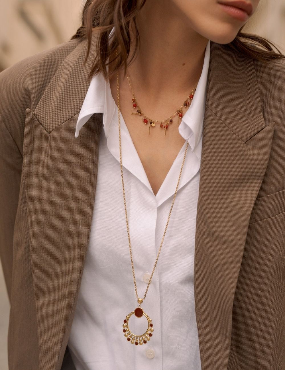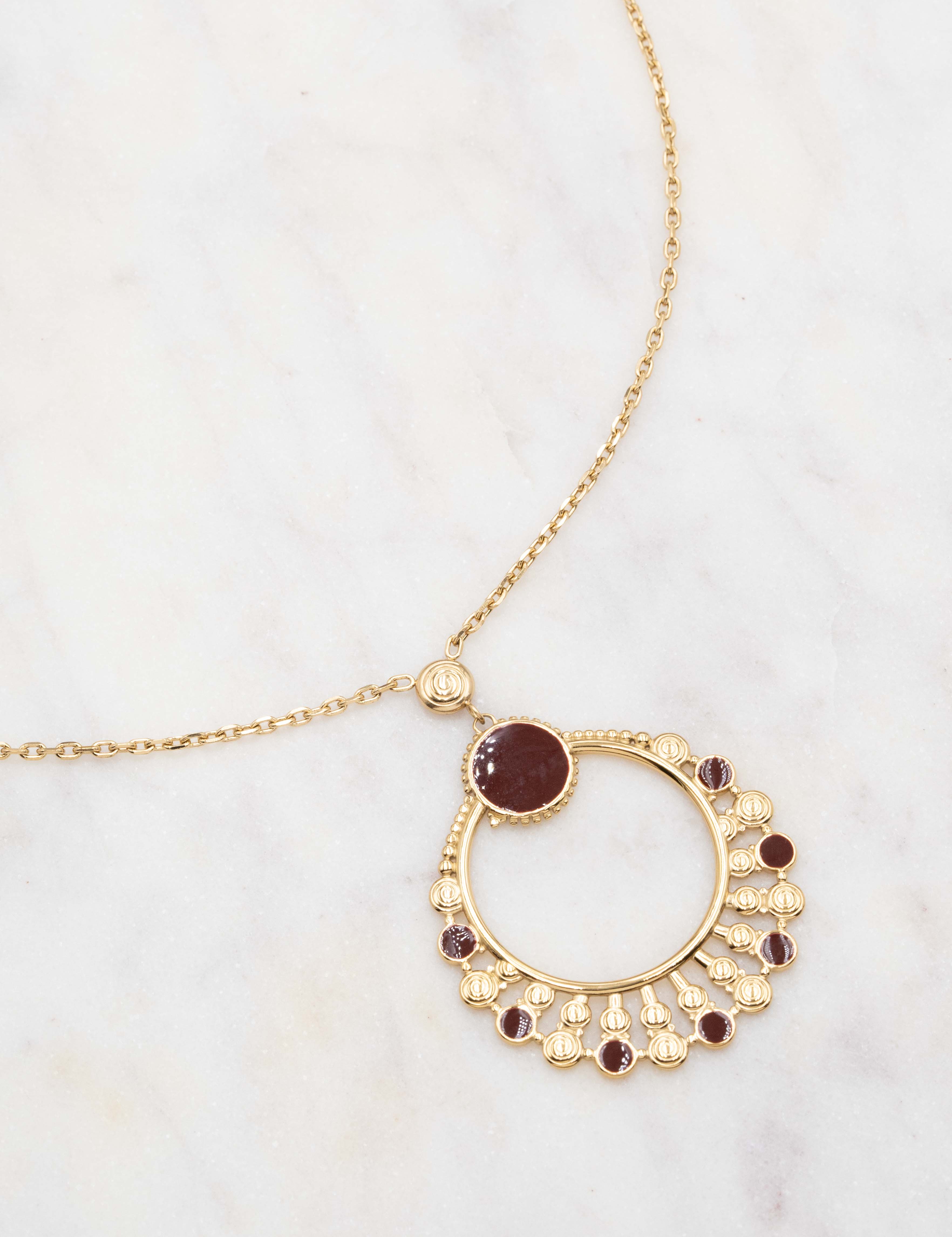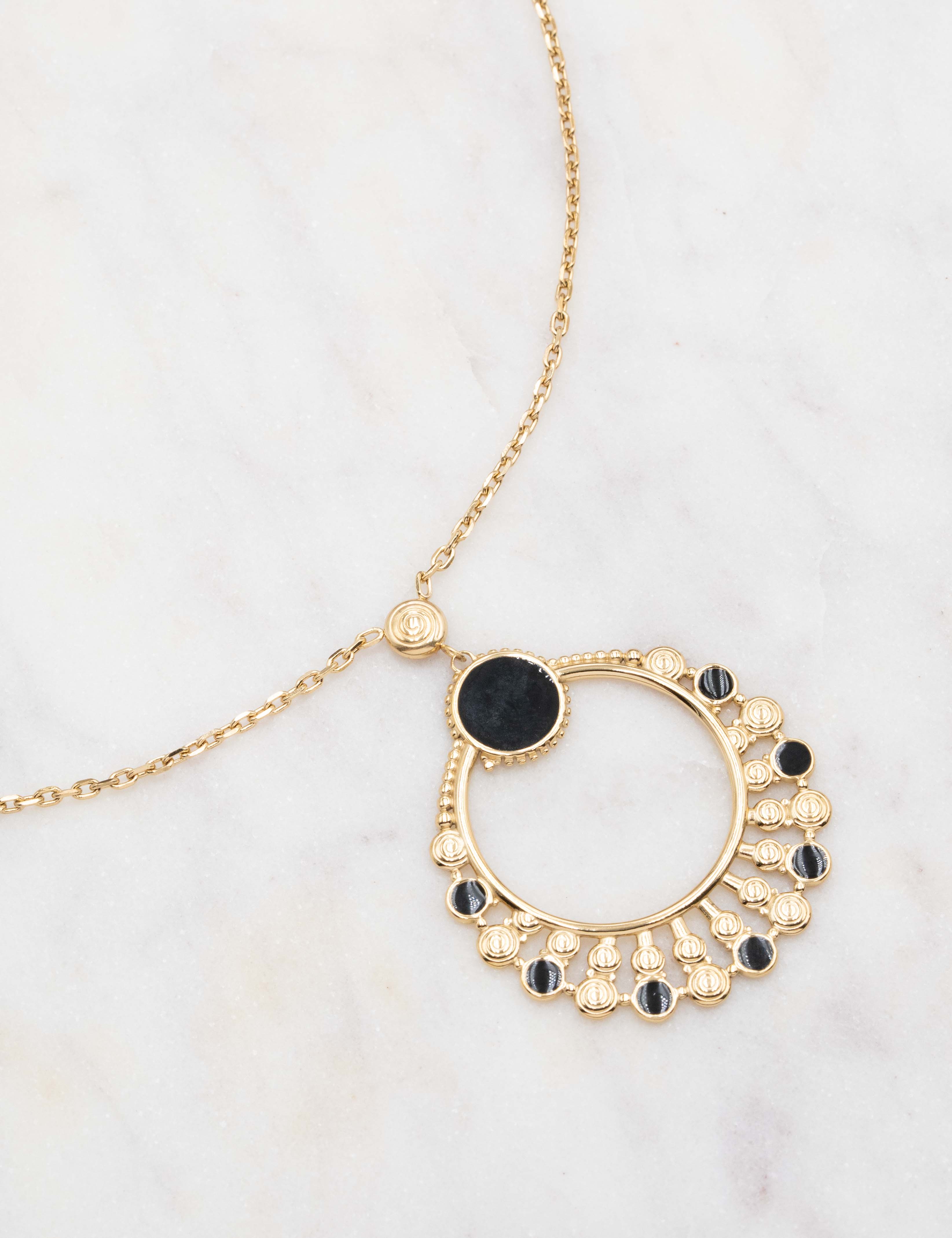 Collier réglable style sautoir composé d'une pièce ajourée stylisée (motifs tourbillon) embellie de touches émaillées colorées.