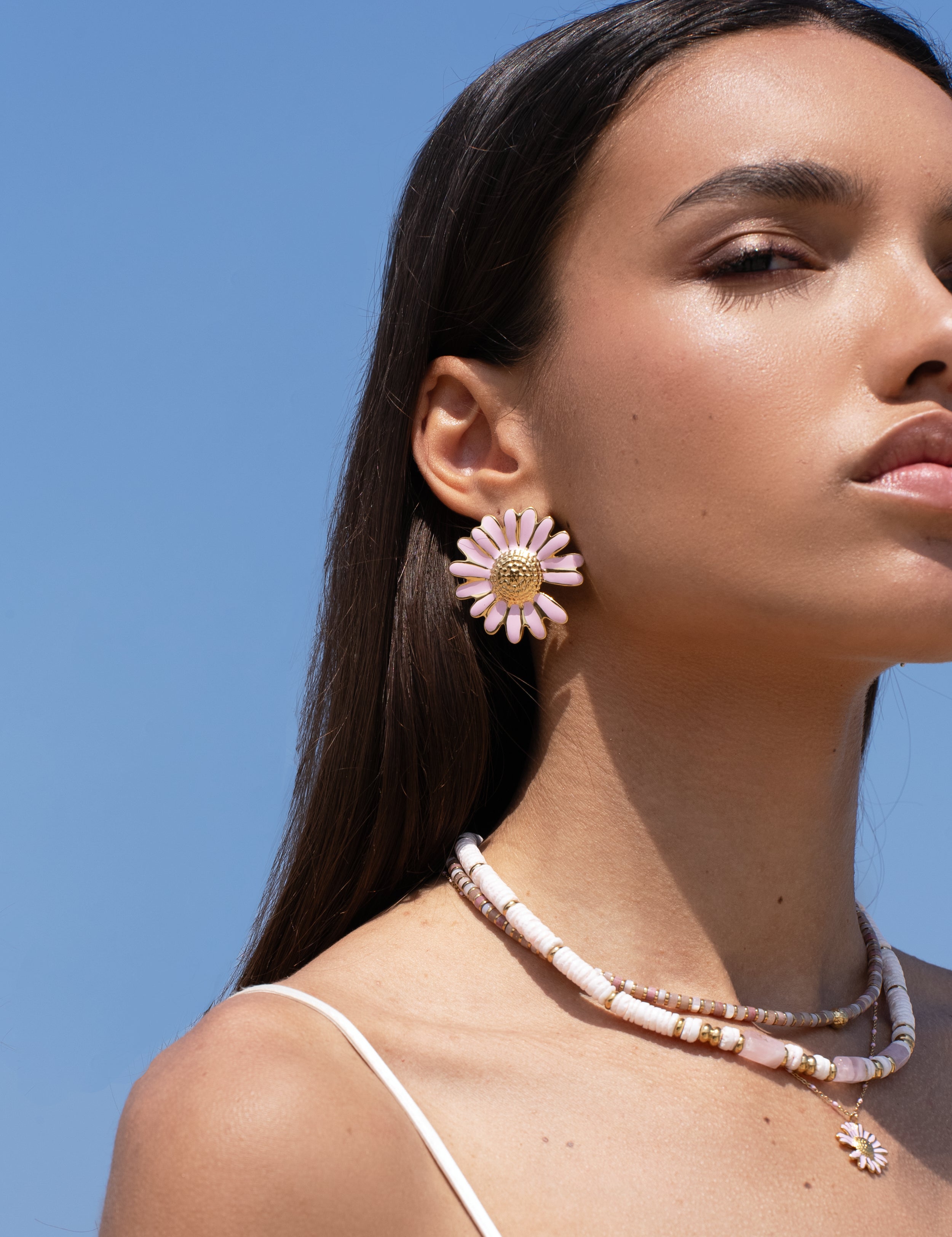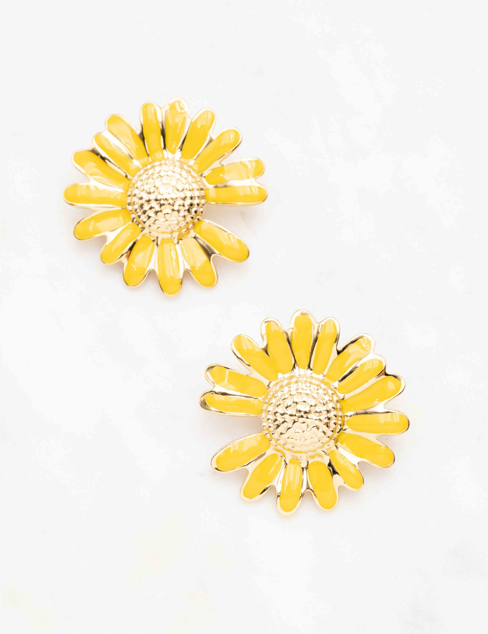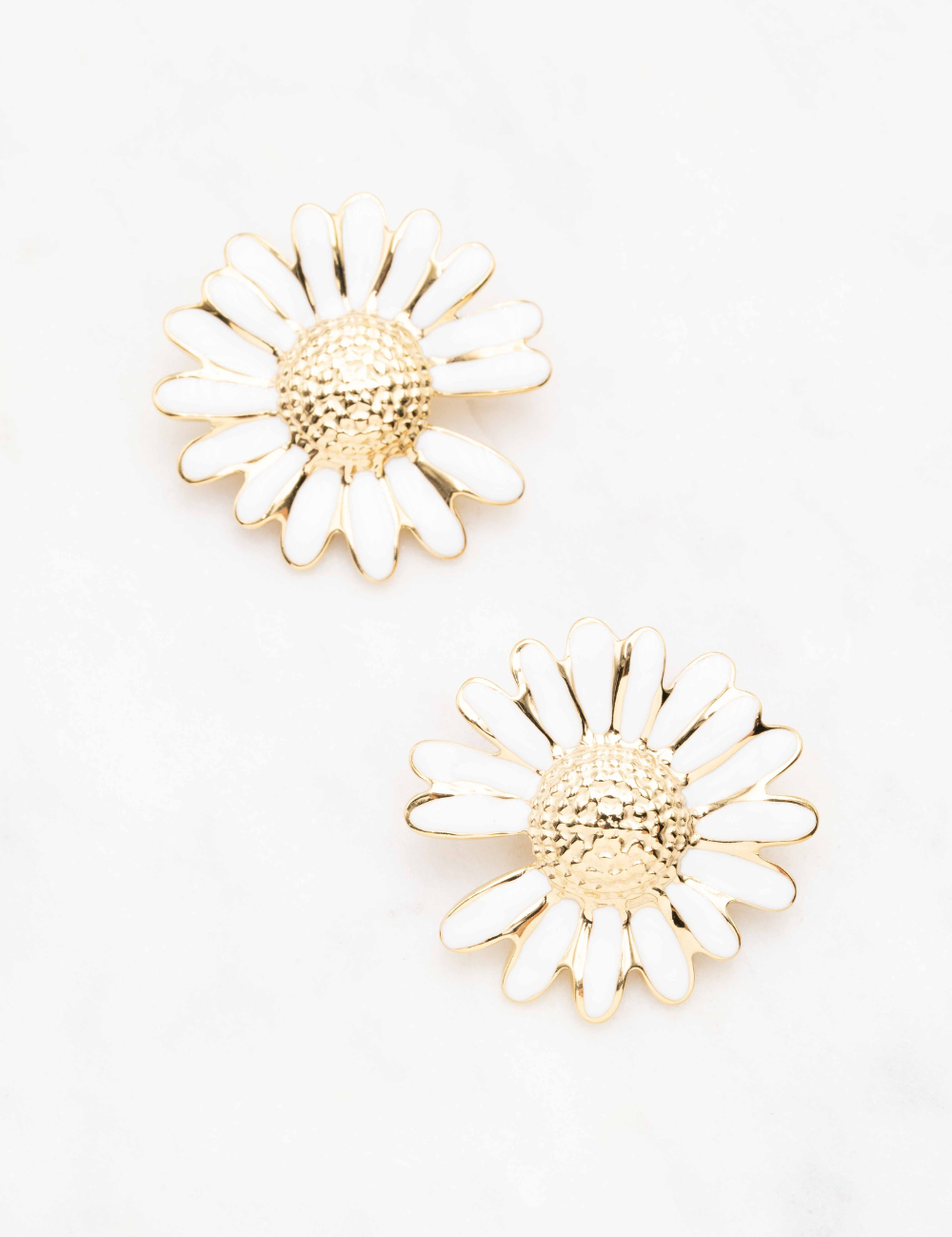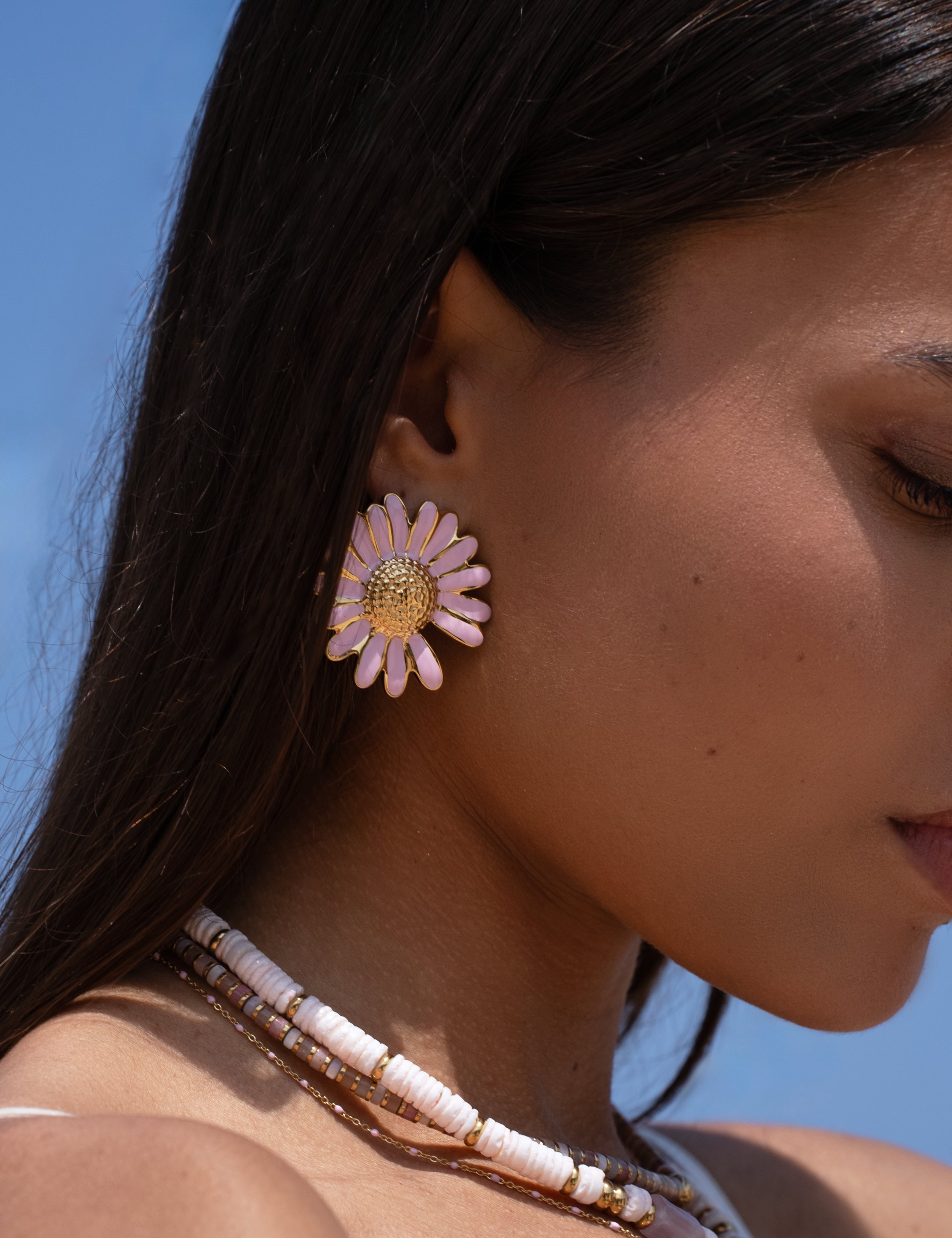 Boucles d'oreilles à puce formant une fleur style marguerite émaillée colorée.