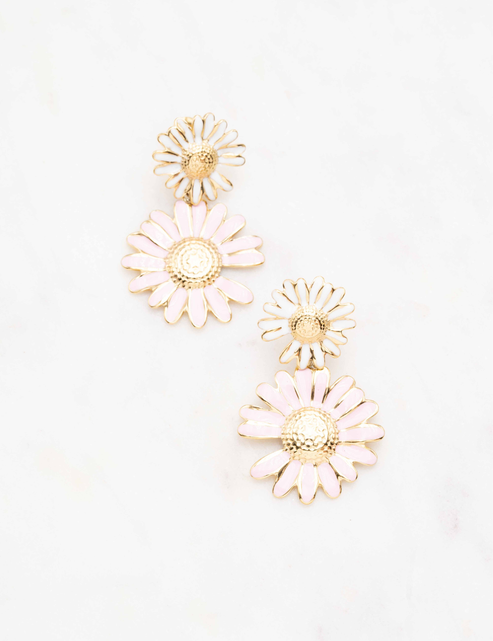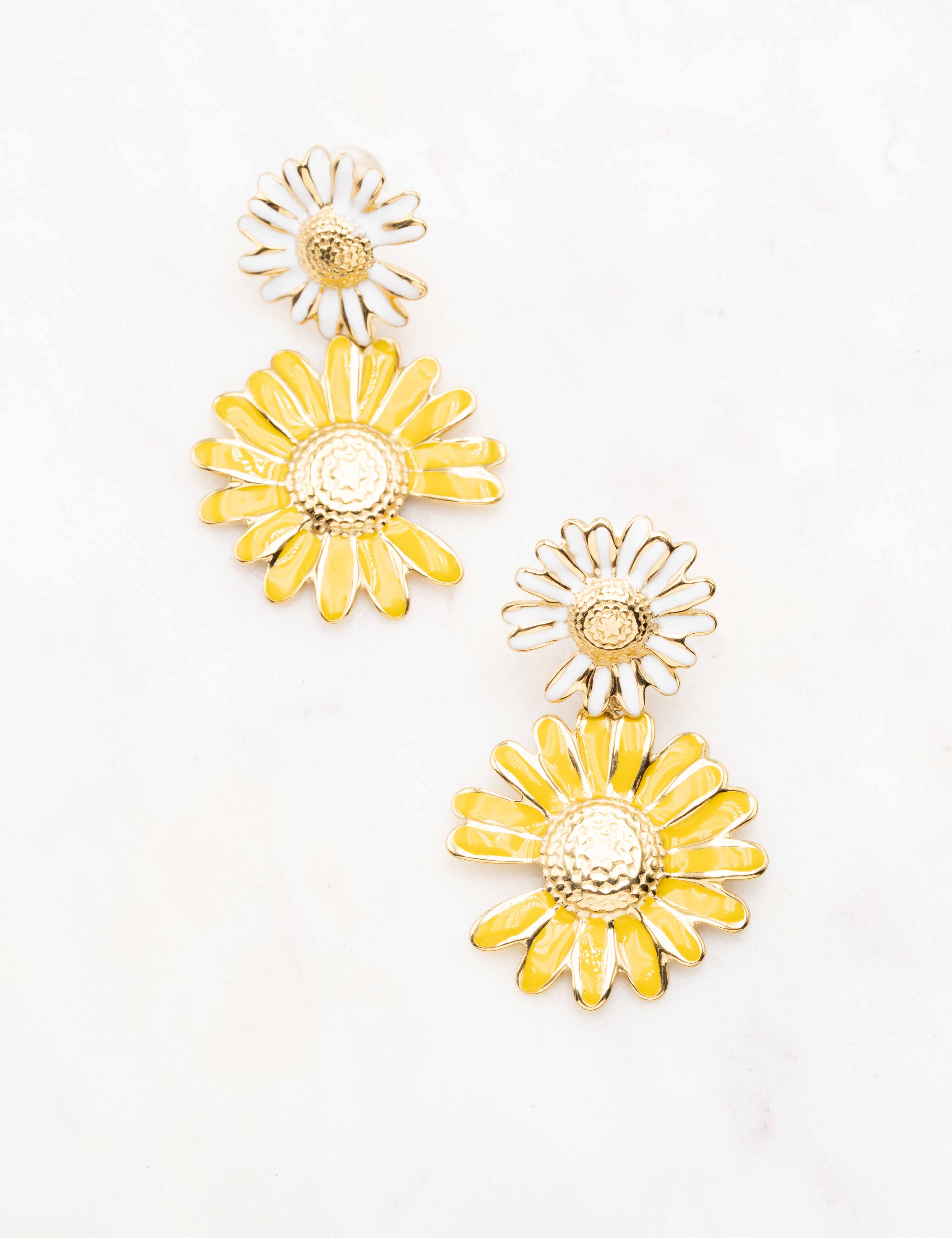 Boucles d'oreilles à puce composée de deux fleurs style marguerite émaillées.