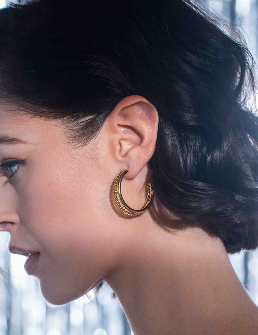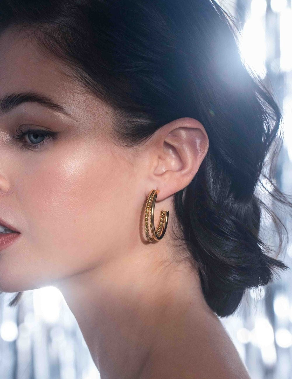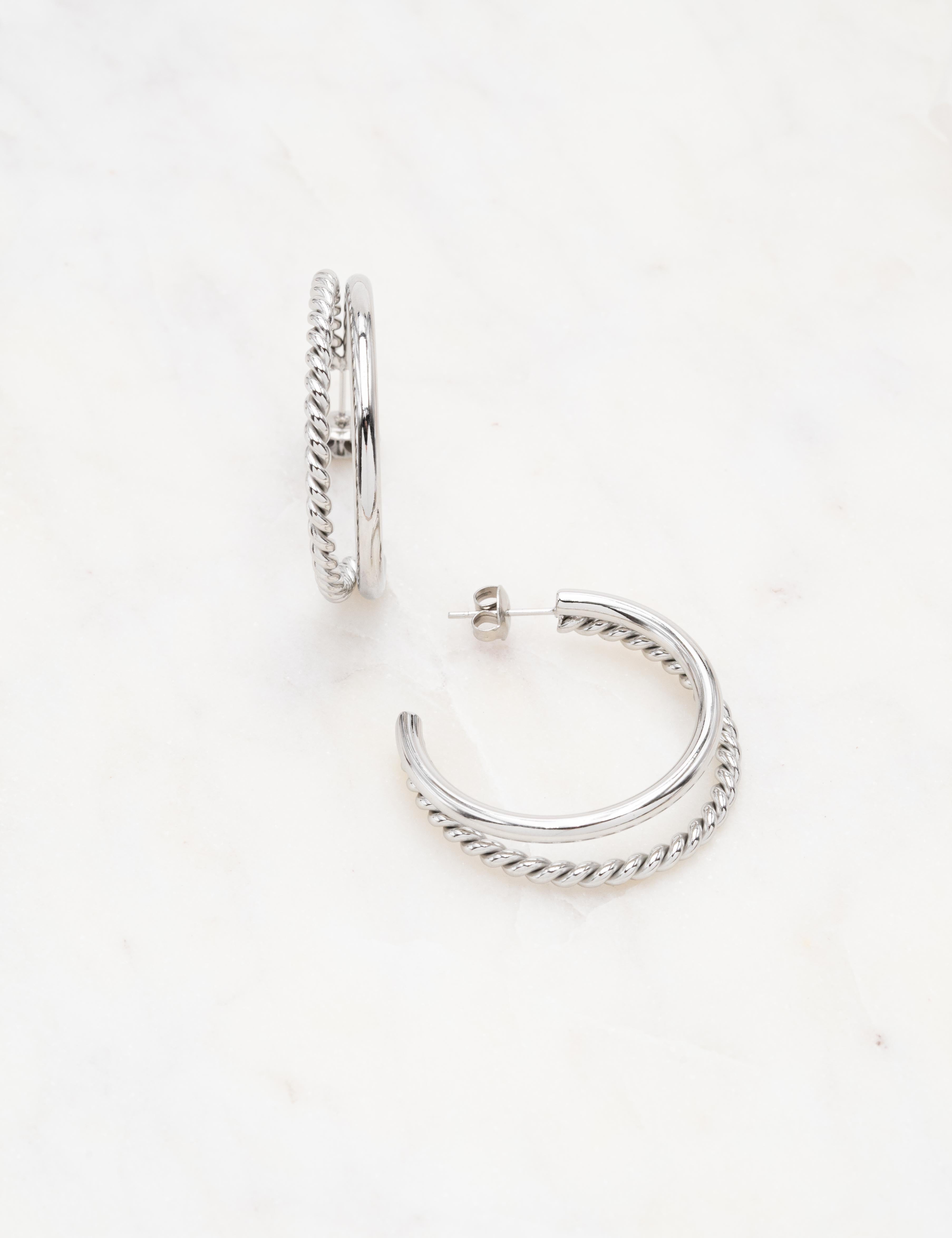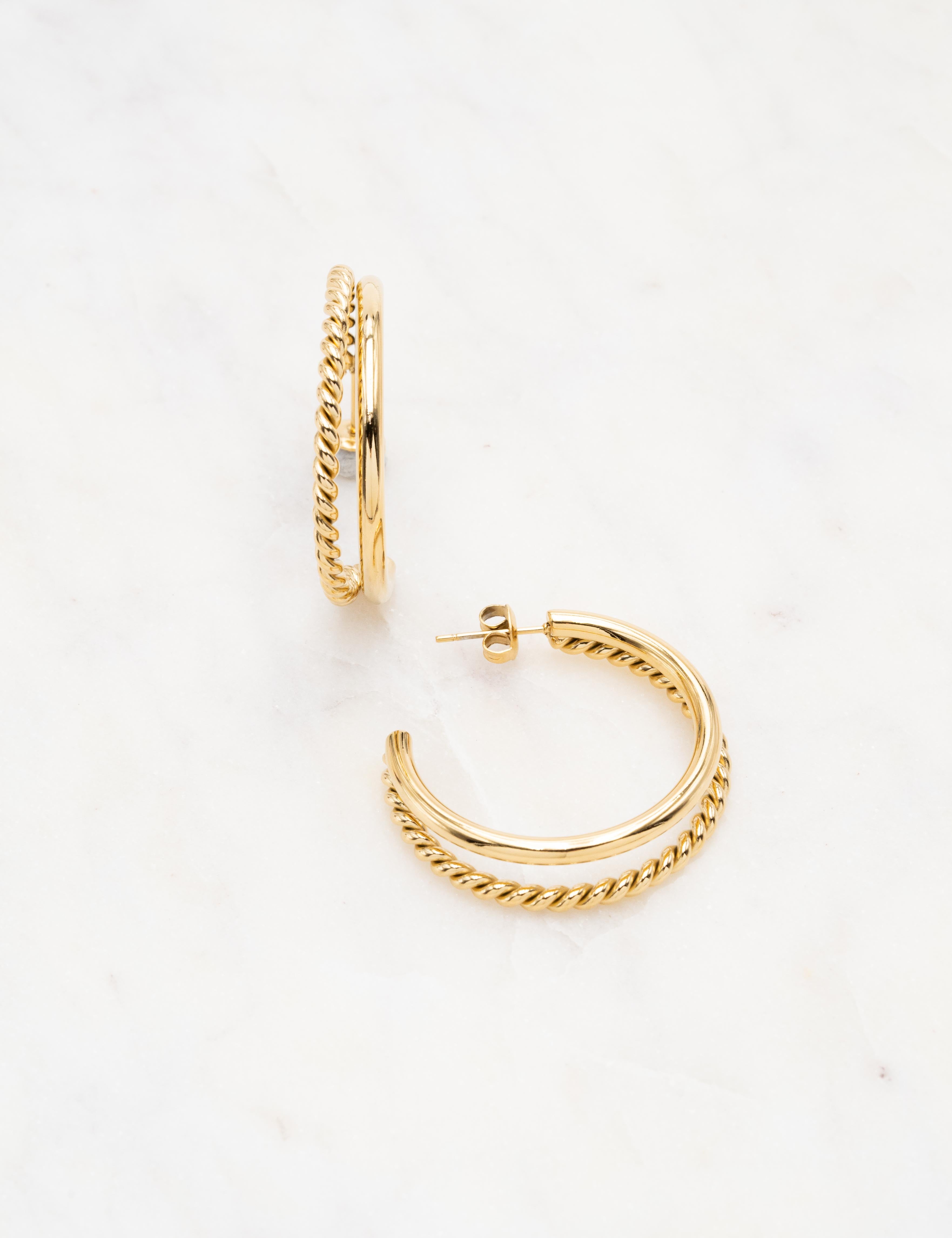 Boucles d'oreilles type créoles à puce doubles rangs : effet lisse et torsadé.