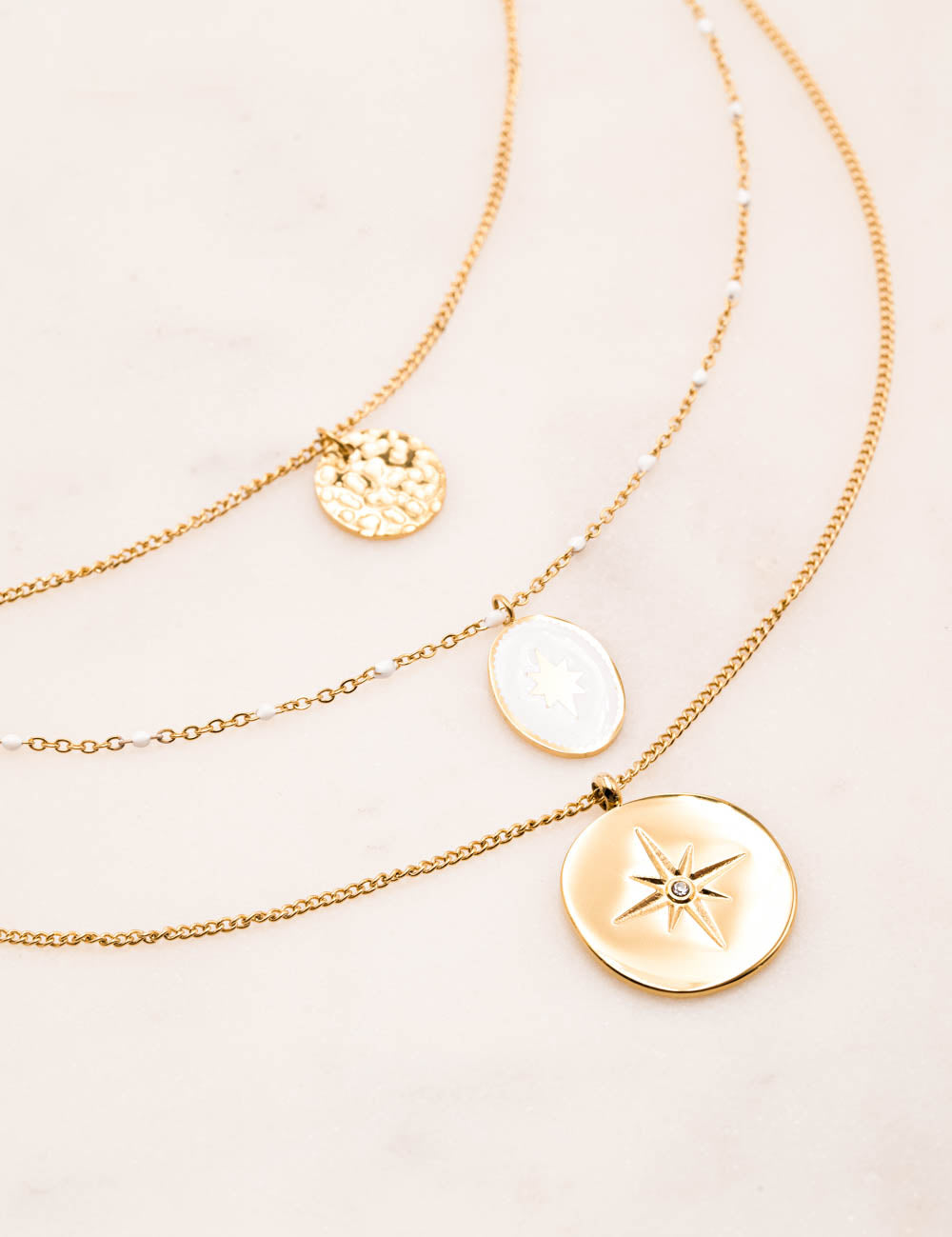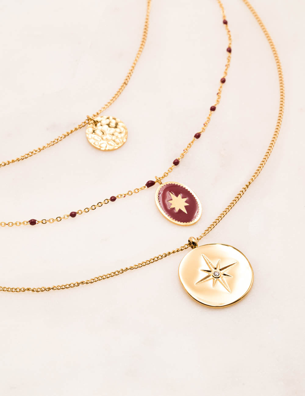 Collier réglable sur chaine 3 rangs orné d'une chaine avec touches émaillées, d'un pendant étoilé strassé et d'une pièce émaillée avec une étoile. Fermoir mousqueton et chainette de réglage.