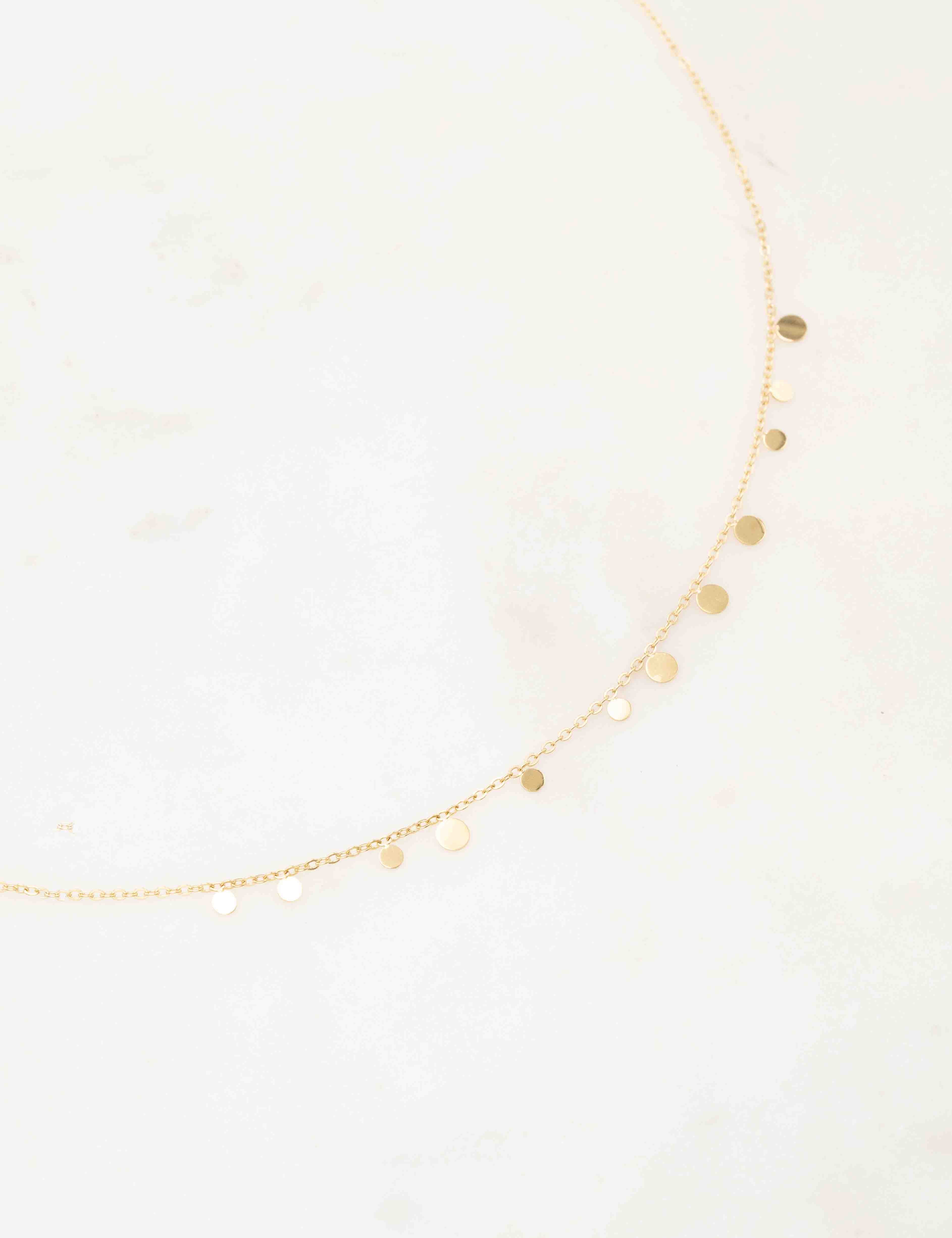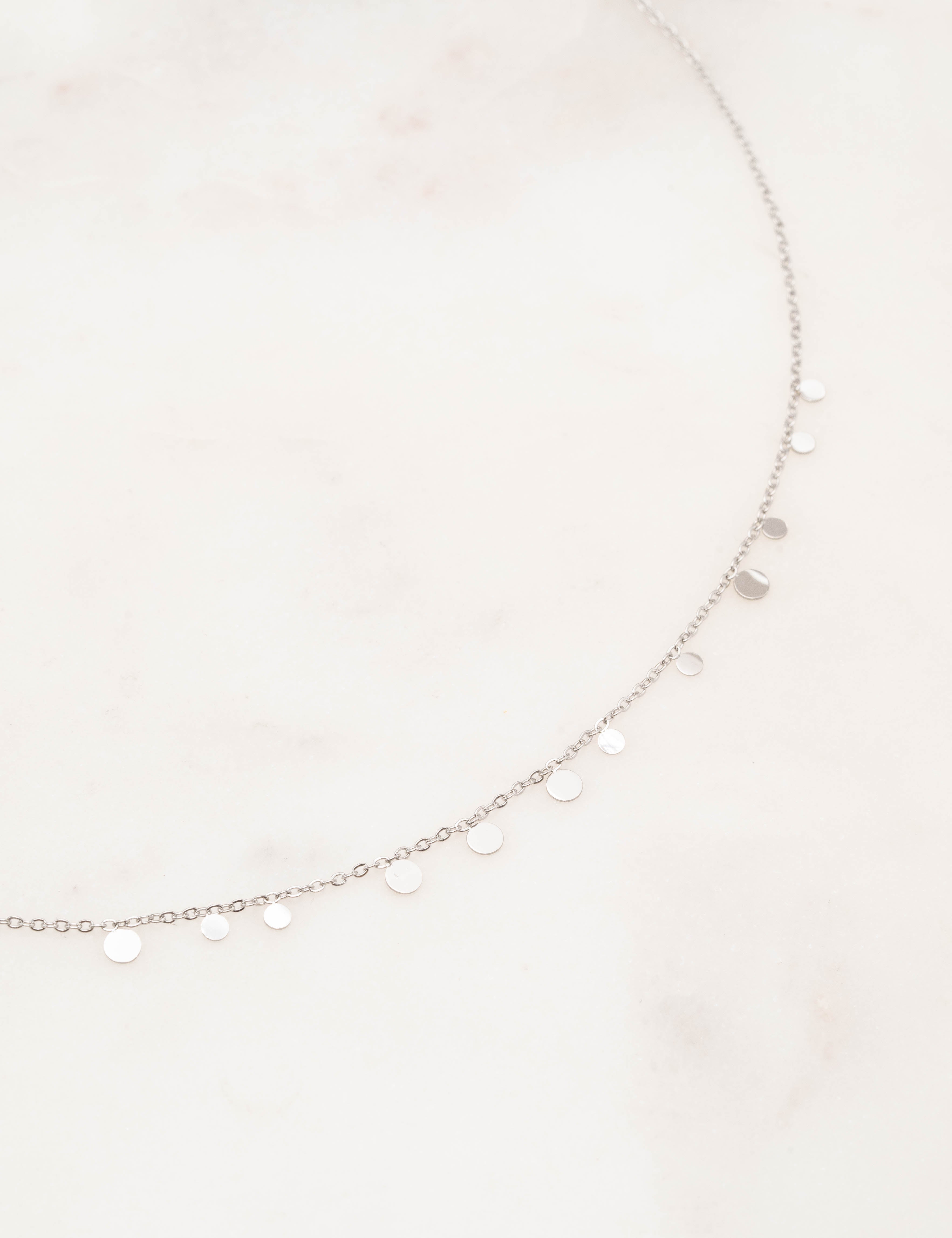 Collier réglable composé de pampilles rondes. Fermoir mousqueton et chainette de réglage.