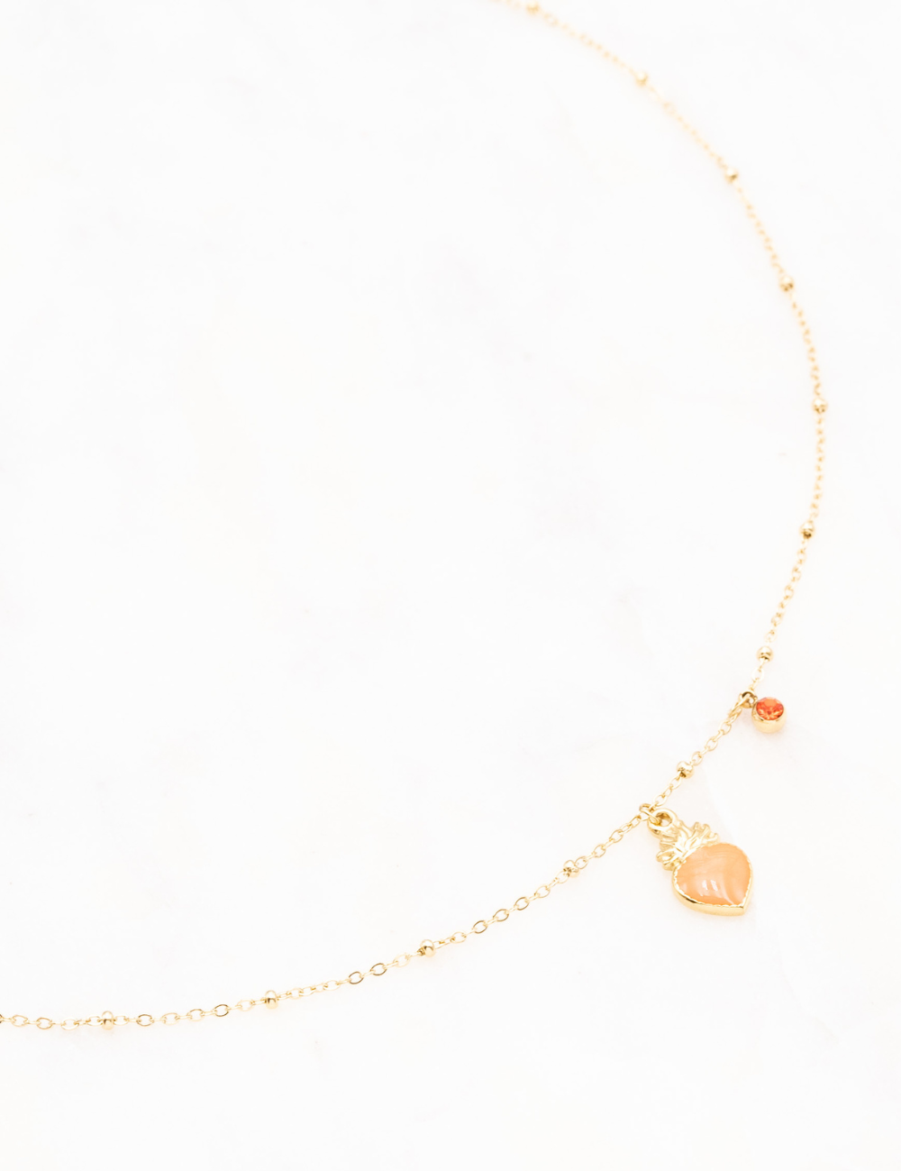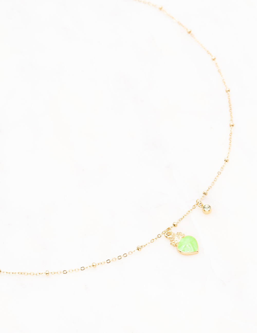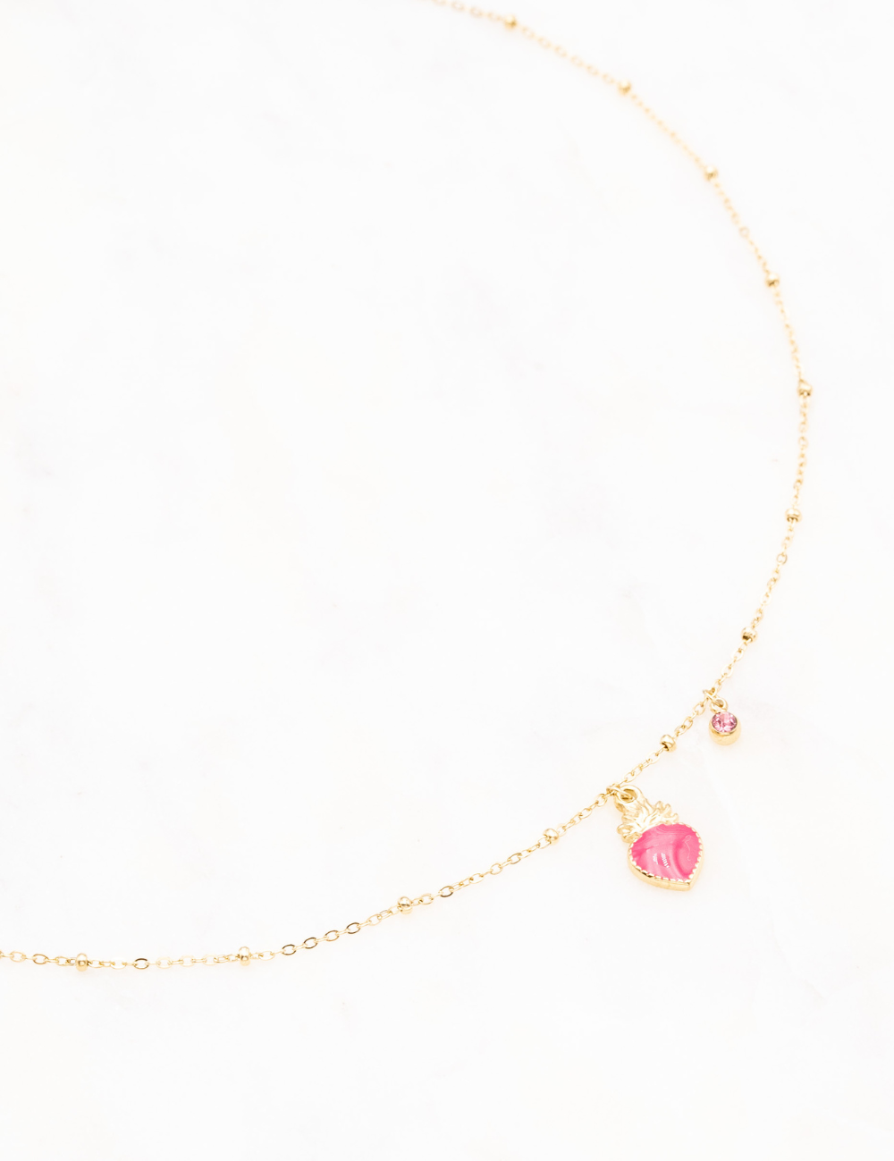 Collier réglable sur chaîne composé d'une pampille ronde sertie d'un strass et d'un pendentif coeur coloré émaillé.