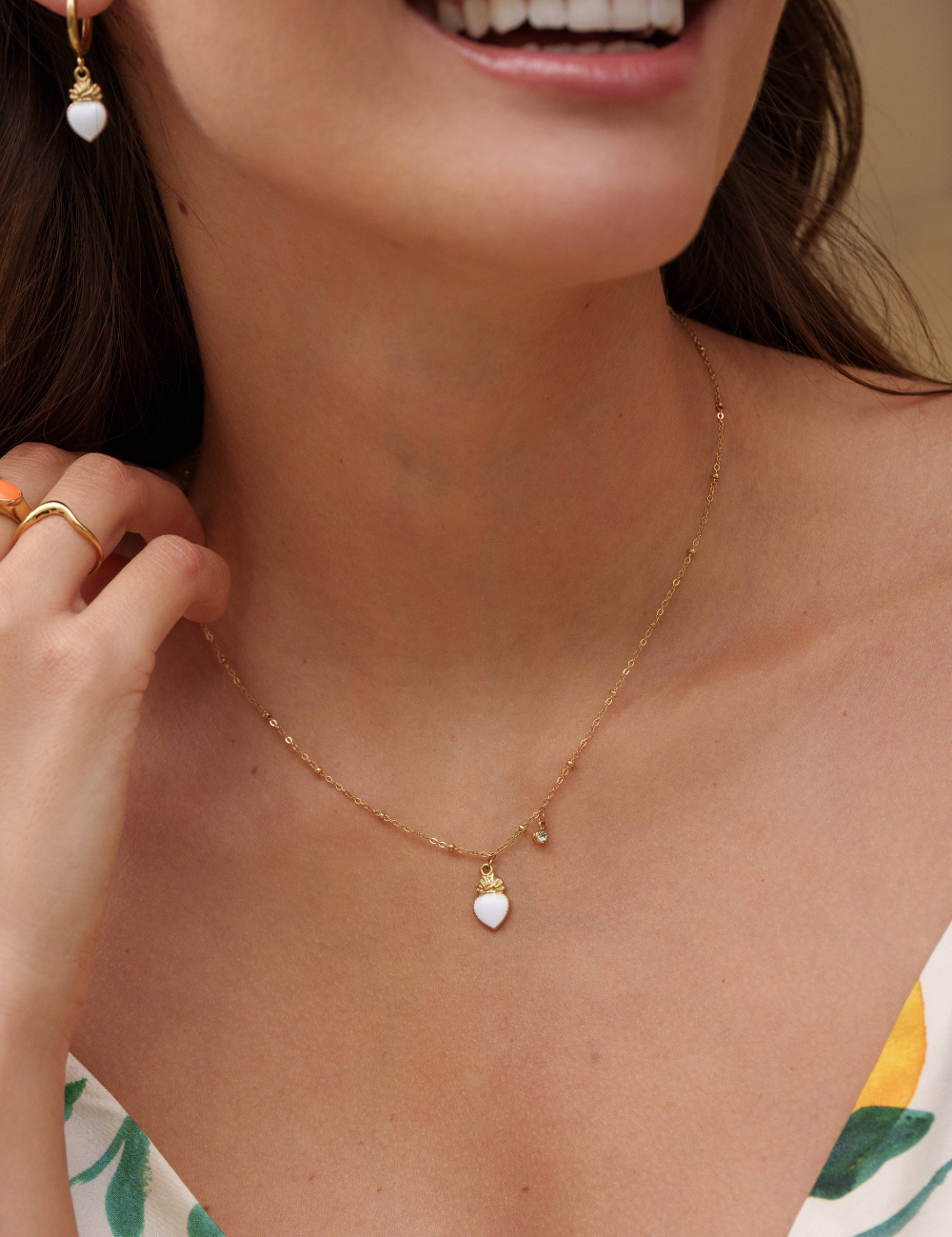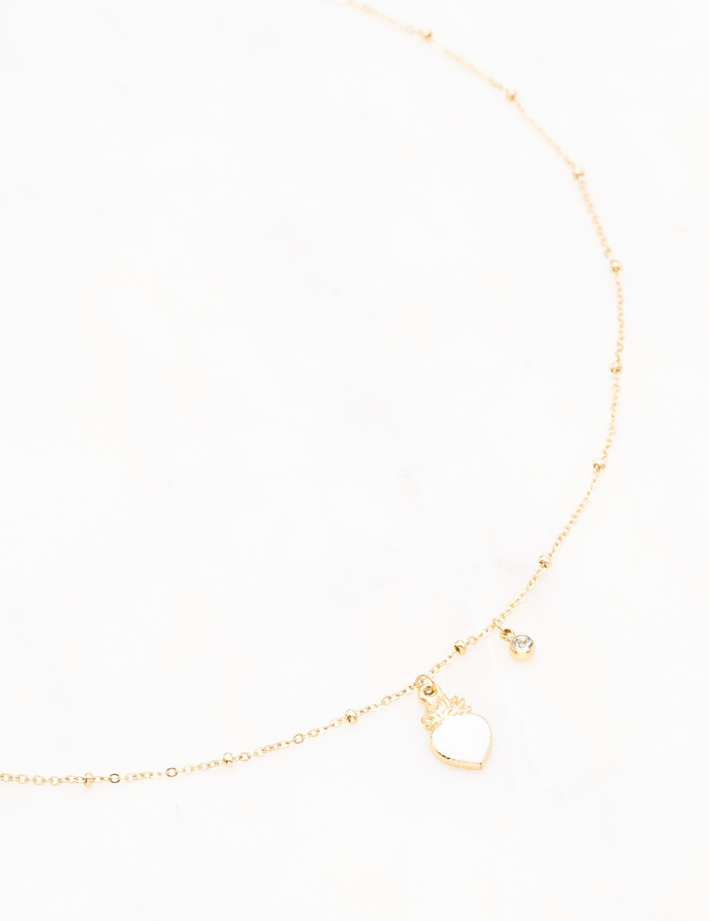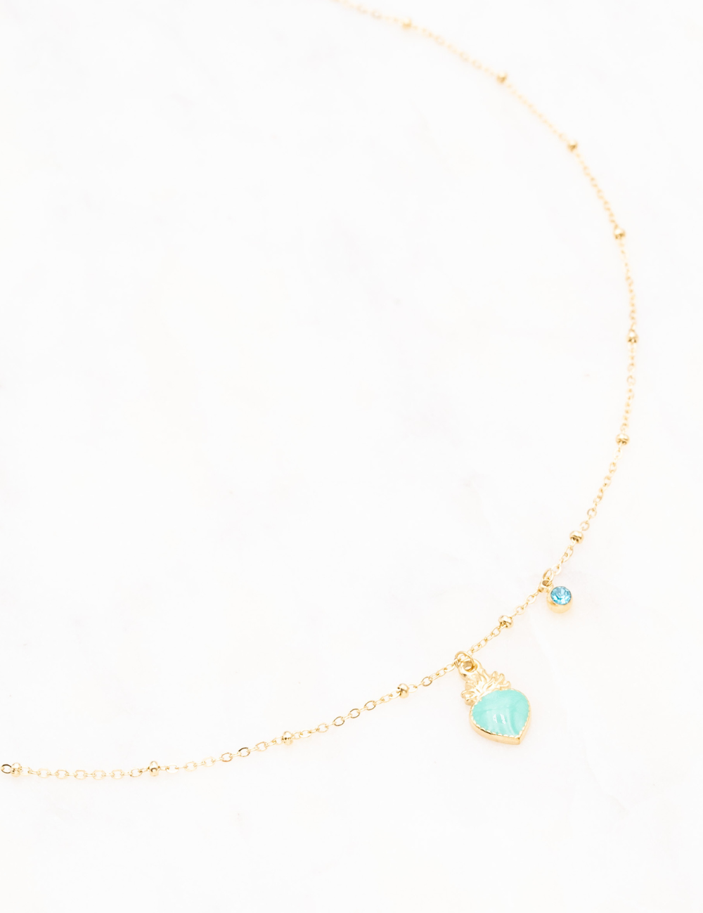 Collier réglable sur chaîne composé d'une pampille ronde sertie d'un strass et d'un pendentif coeur coloré émaillé.