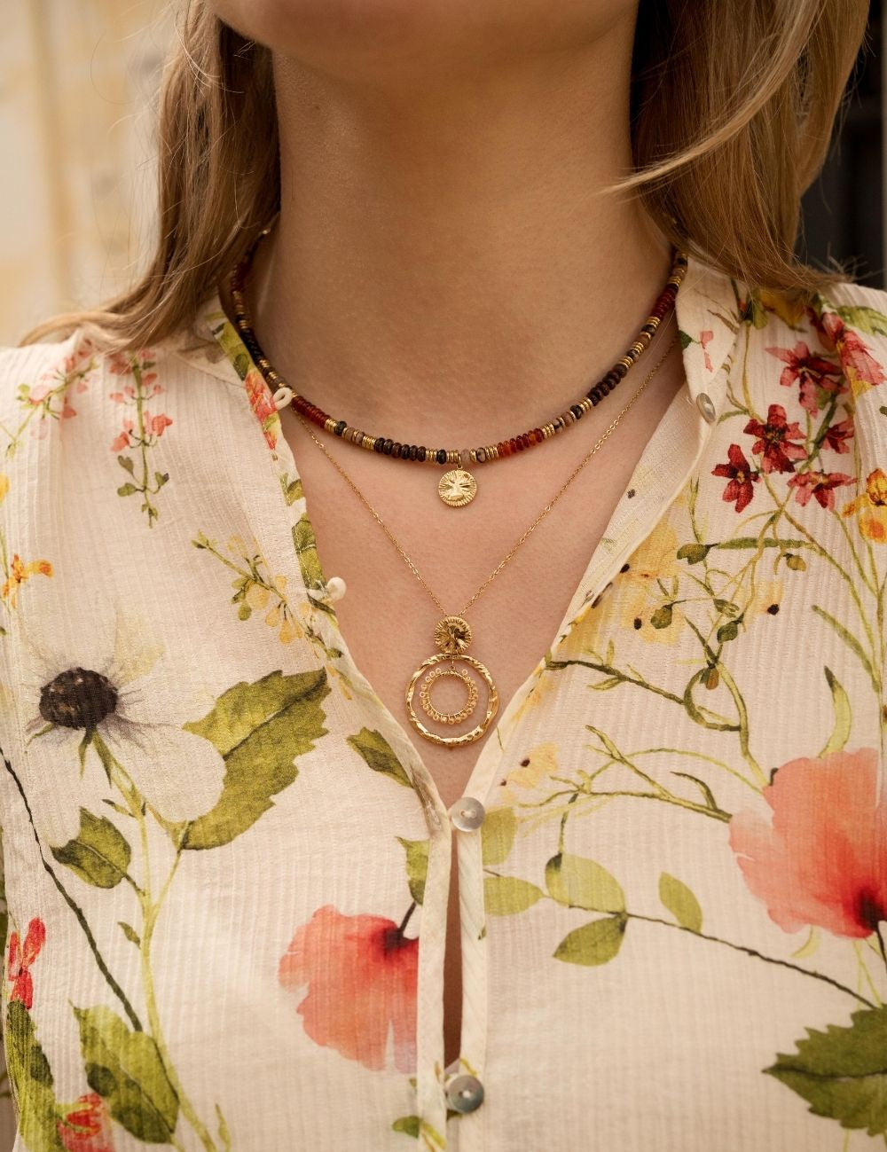 Collier réglable sur chaîne composé d'une pièce ronde texturée, d'un anneau martelé et un orné de pates de verre type rocaille.