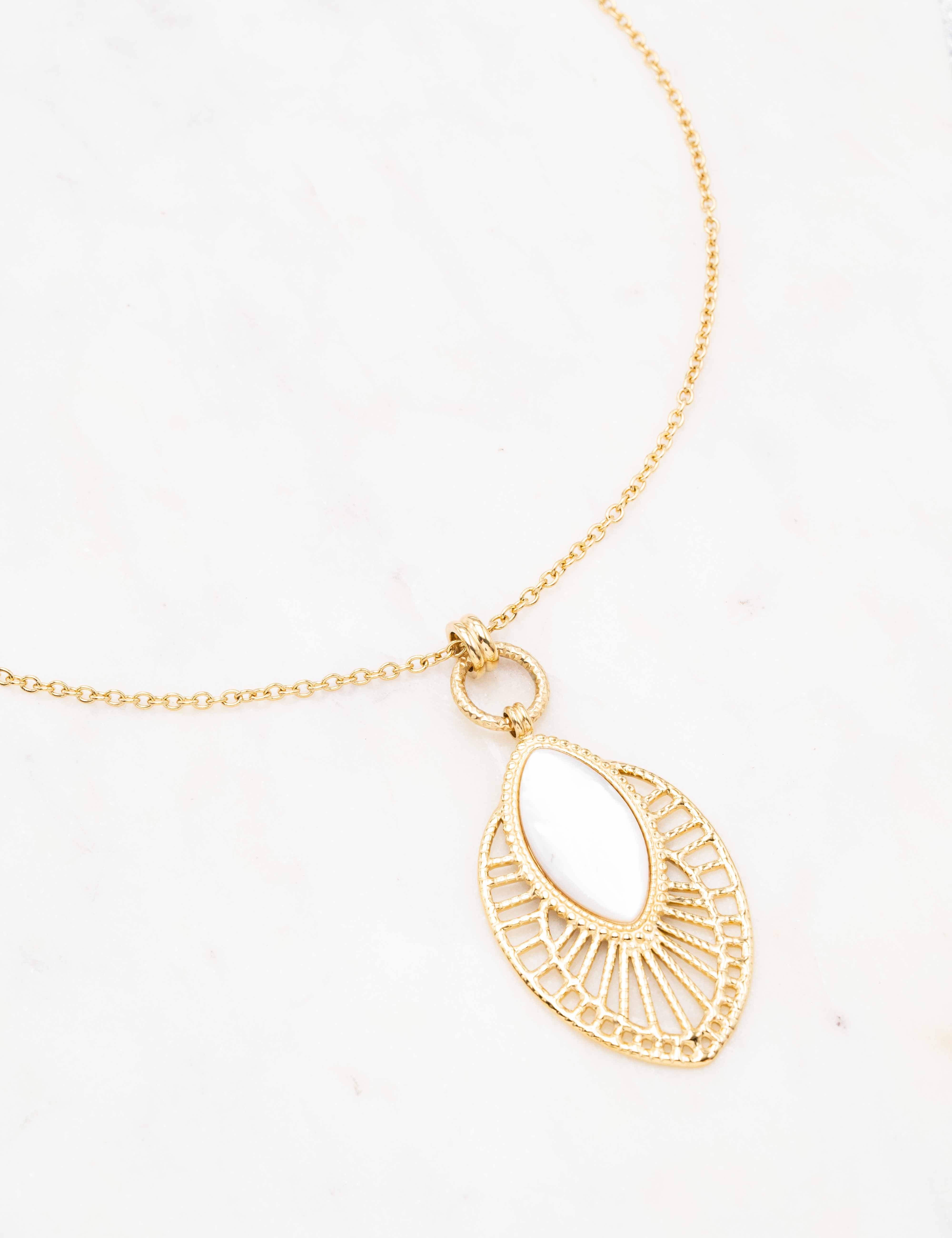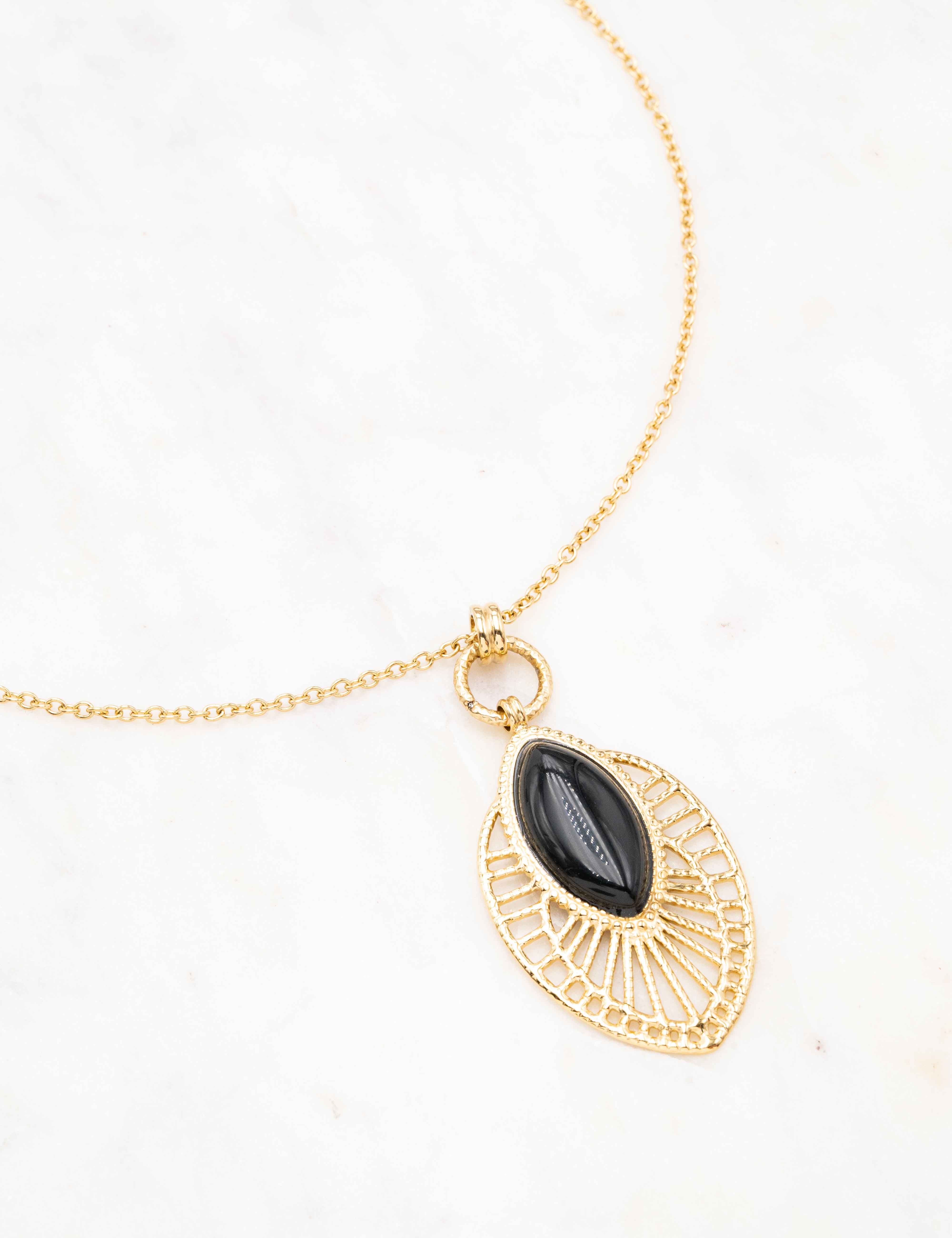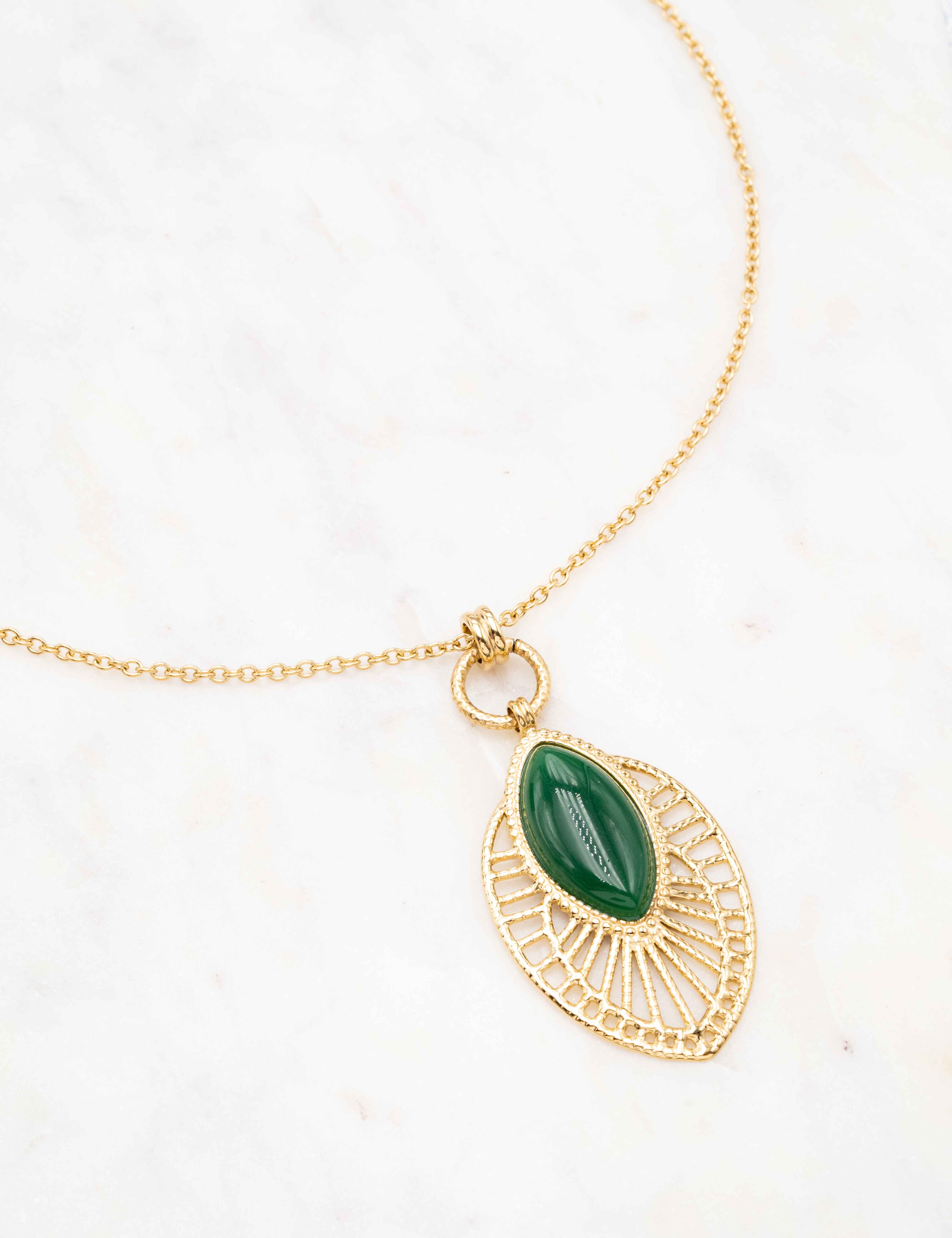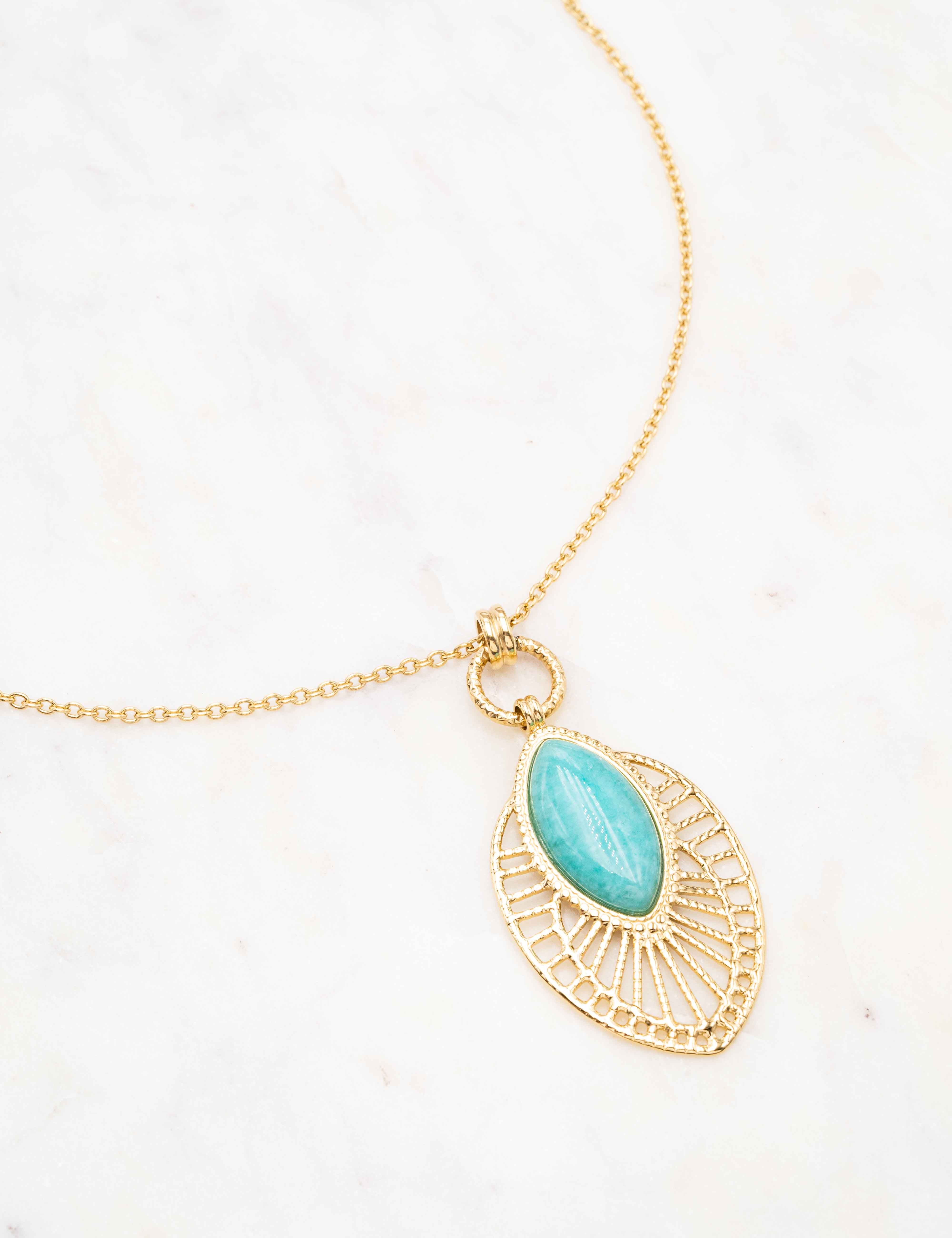 Collier réglable sur chaîne type sautoir composé d'un pendentif ajouré orné d'une pierre naturelle.