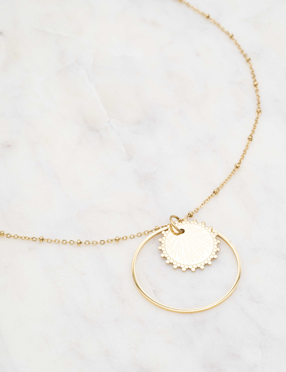 Collier réglable type sautoir composé d'un pendant graphique rond ajouré et d'un anneau.