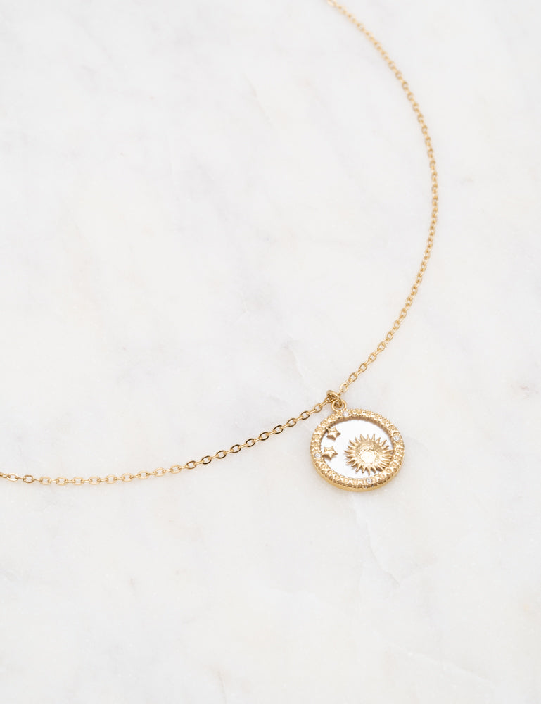 Collier sur chaîne composé d'un pendentif rond avec un fond nacré et orné d'étoiles, d'un soleil et de strass (oxyde de zirconium).