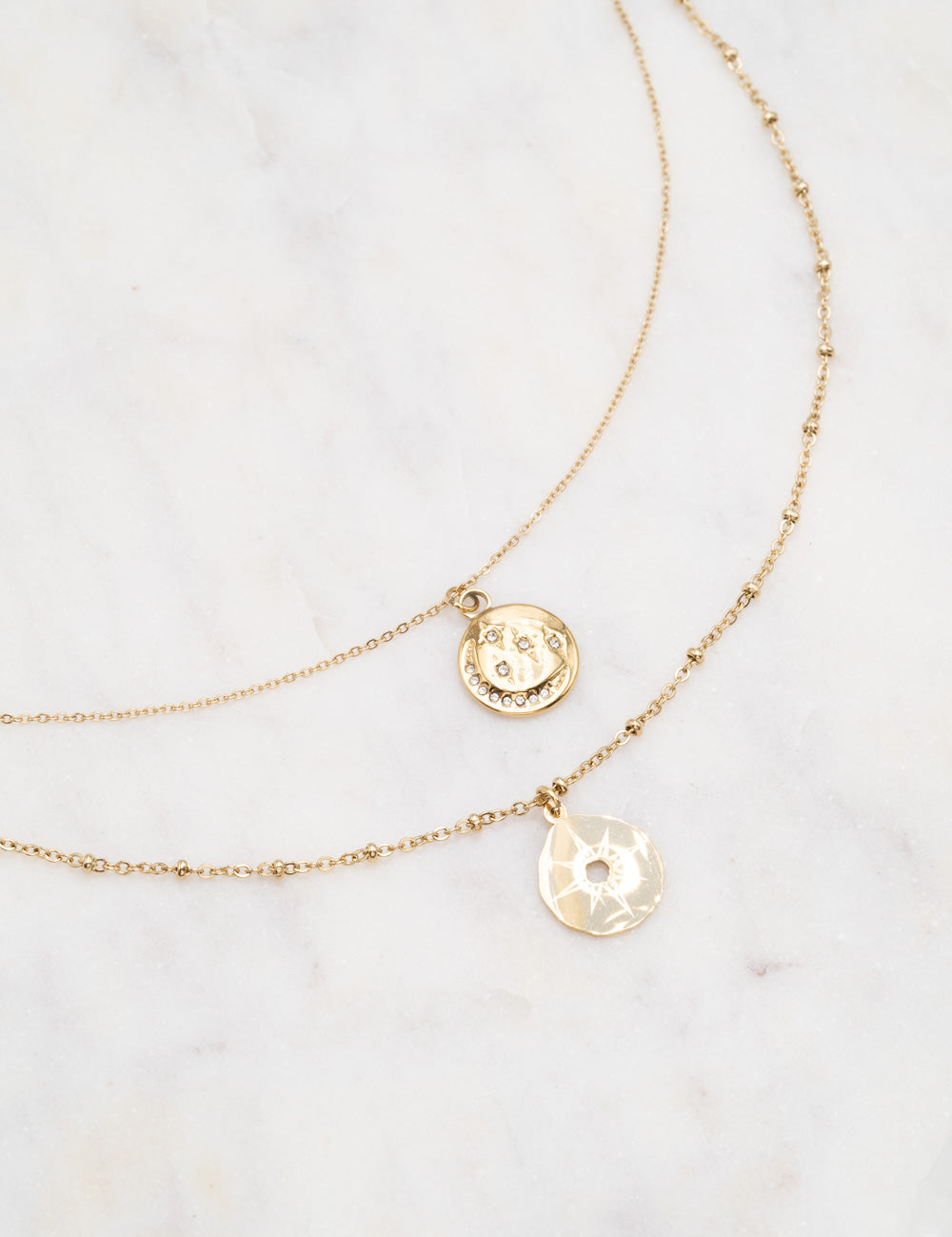 Collier réglable 2 rangs composés d'une pièce ronde ornée de strass (oxydes de zirconium) formant une lune et constellation et d'une pampille étoilée gravée. Fermoir mousqueton et chainette de réglage.