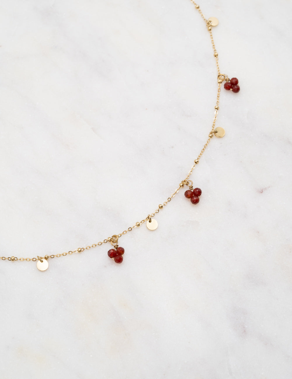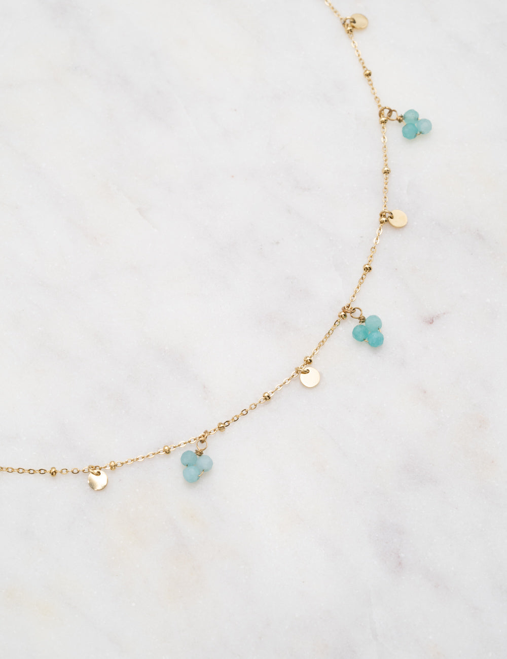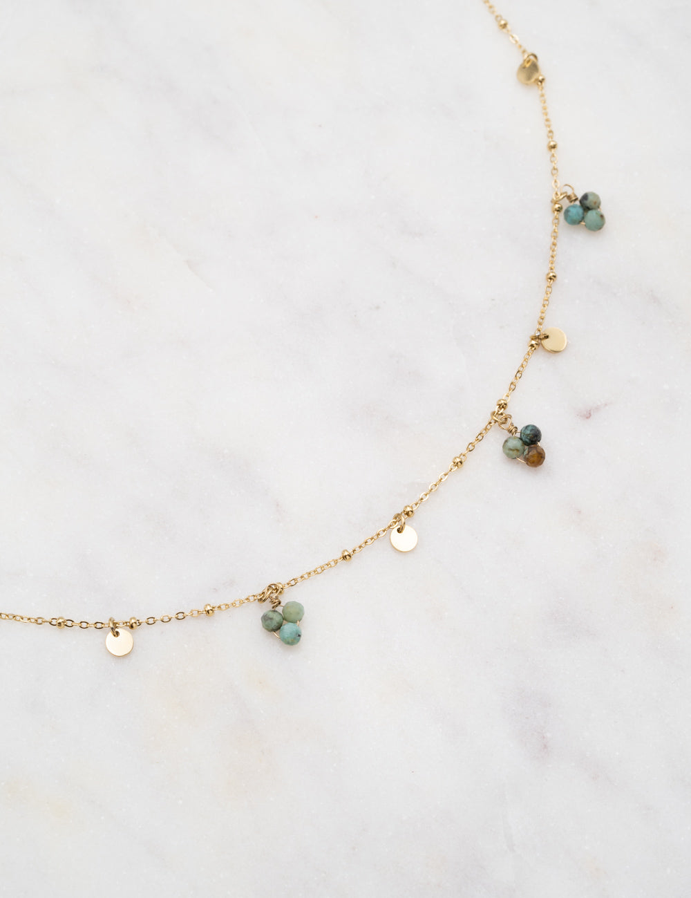Collier sur chaine réglable avec des petites grappes de pierres naturelles. Pierres naturelles : nacre, cornaline, rhodonite, onyx, amazonite, turquoise africaine, lapis lazuli.