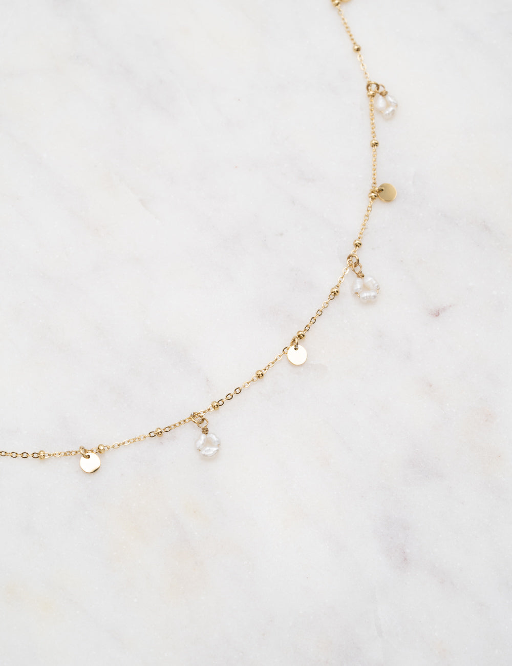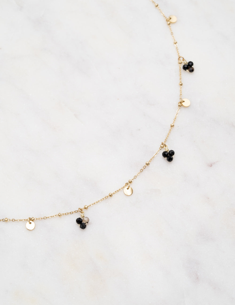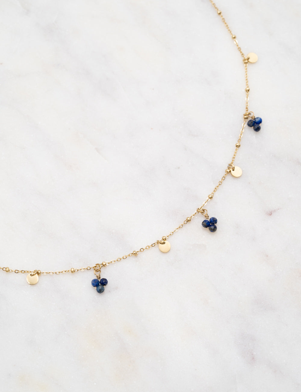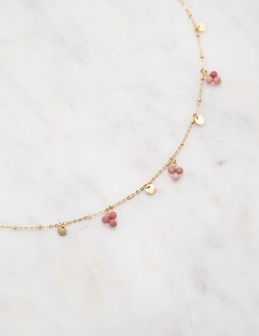 Collier sur chaine réglable avec des petites grappes de pierres naturelles. Pierres naturelles : nacre, cornaline, rhodonite, onyx, amazonite, turquoise africaine, lapis lazuli.