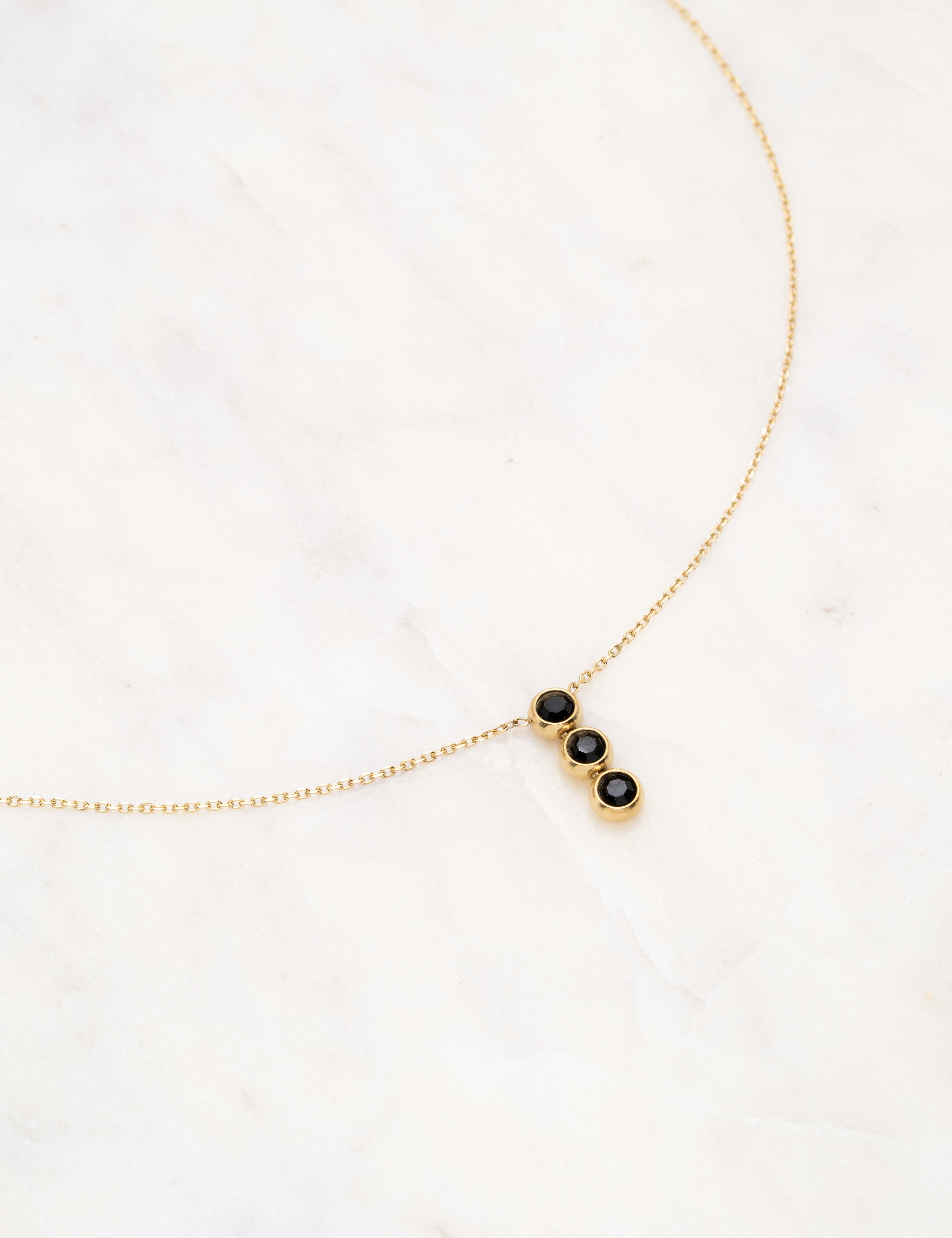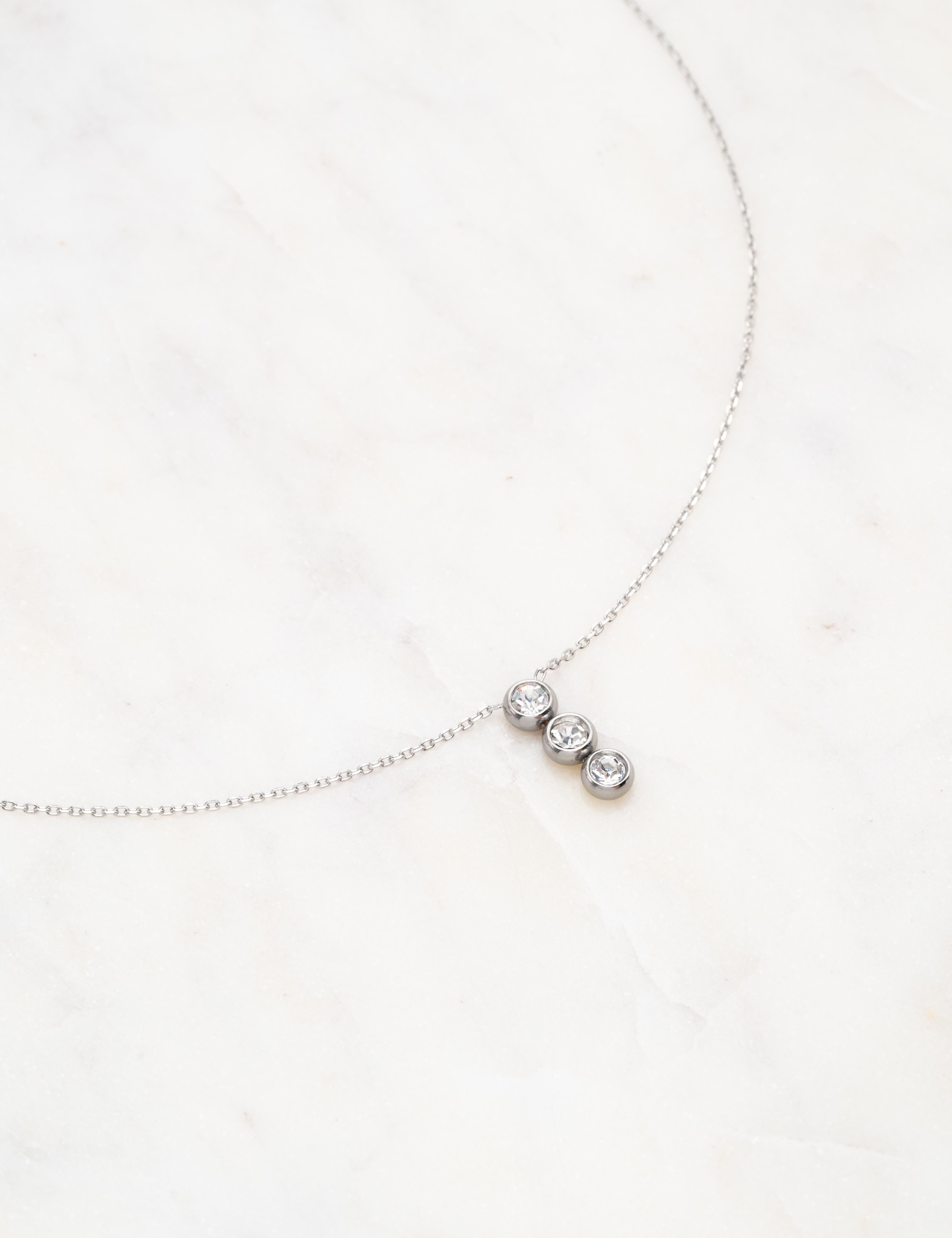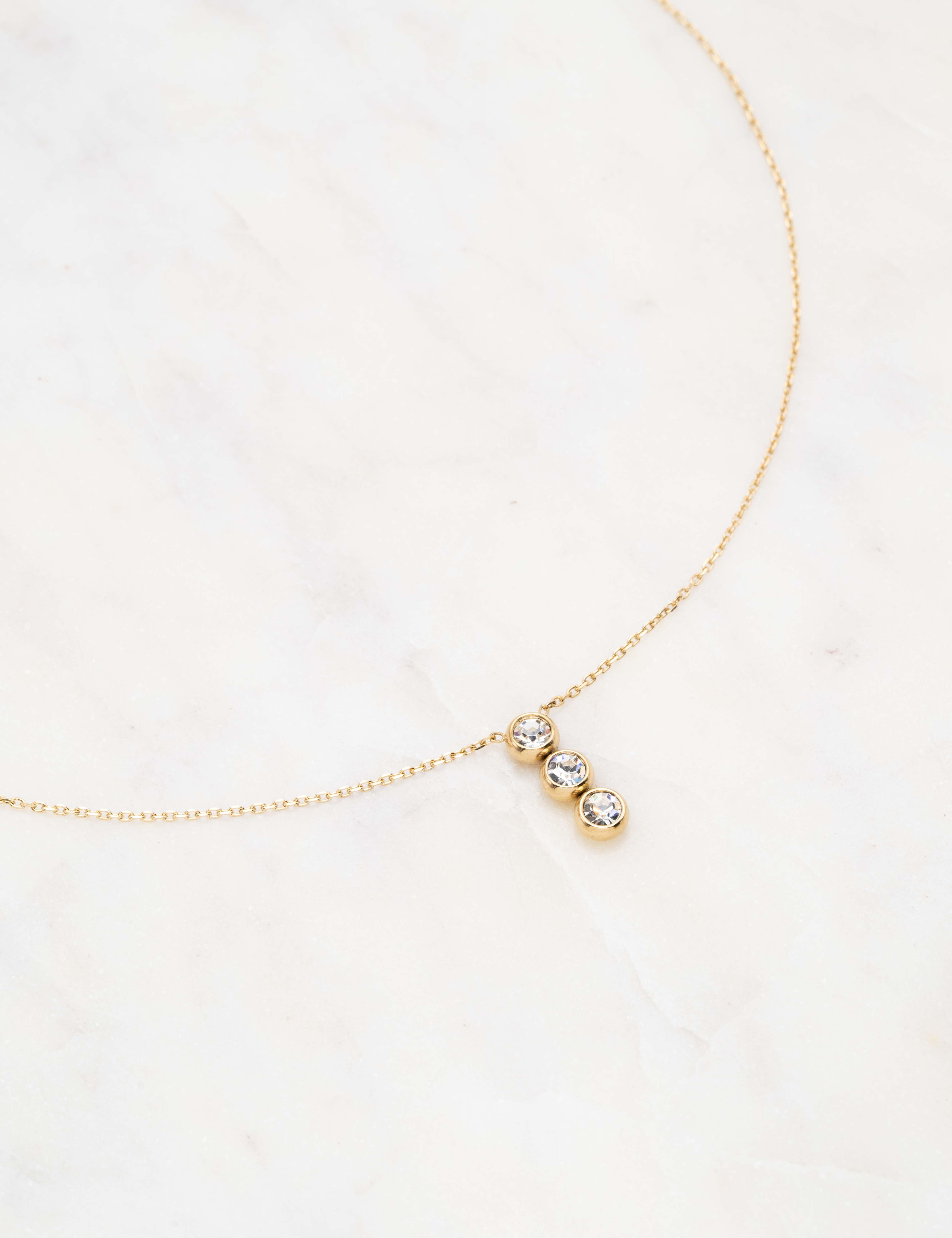 Collier réglable sur chaîne orné de trois strass. Fermoir mousqueton et chainette de réglage.