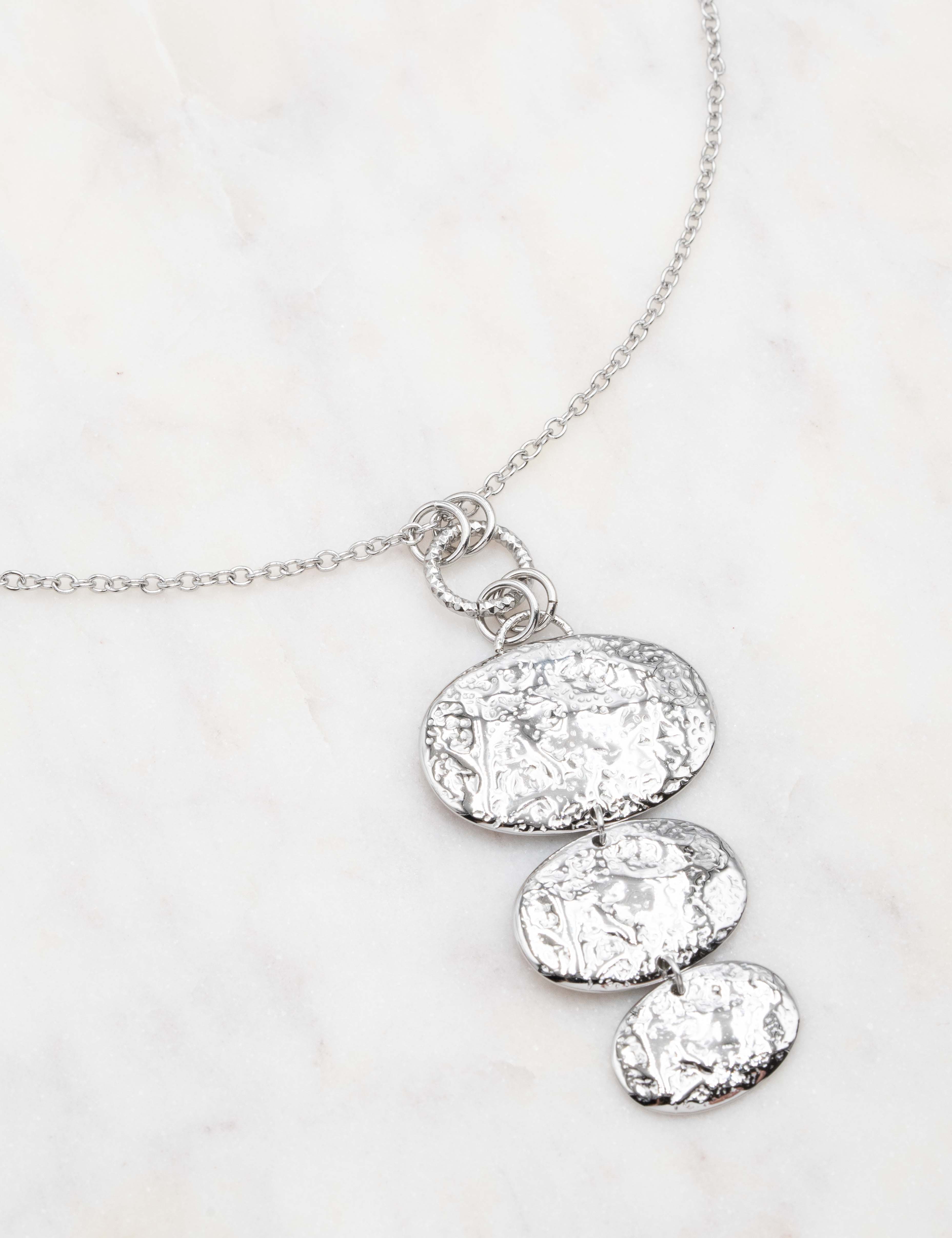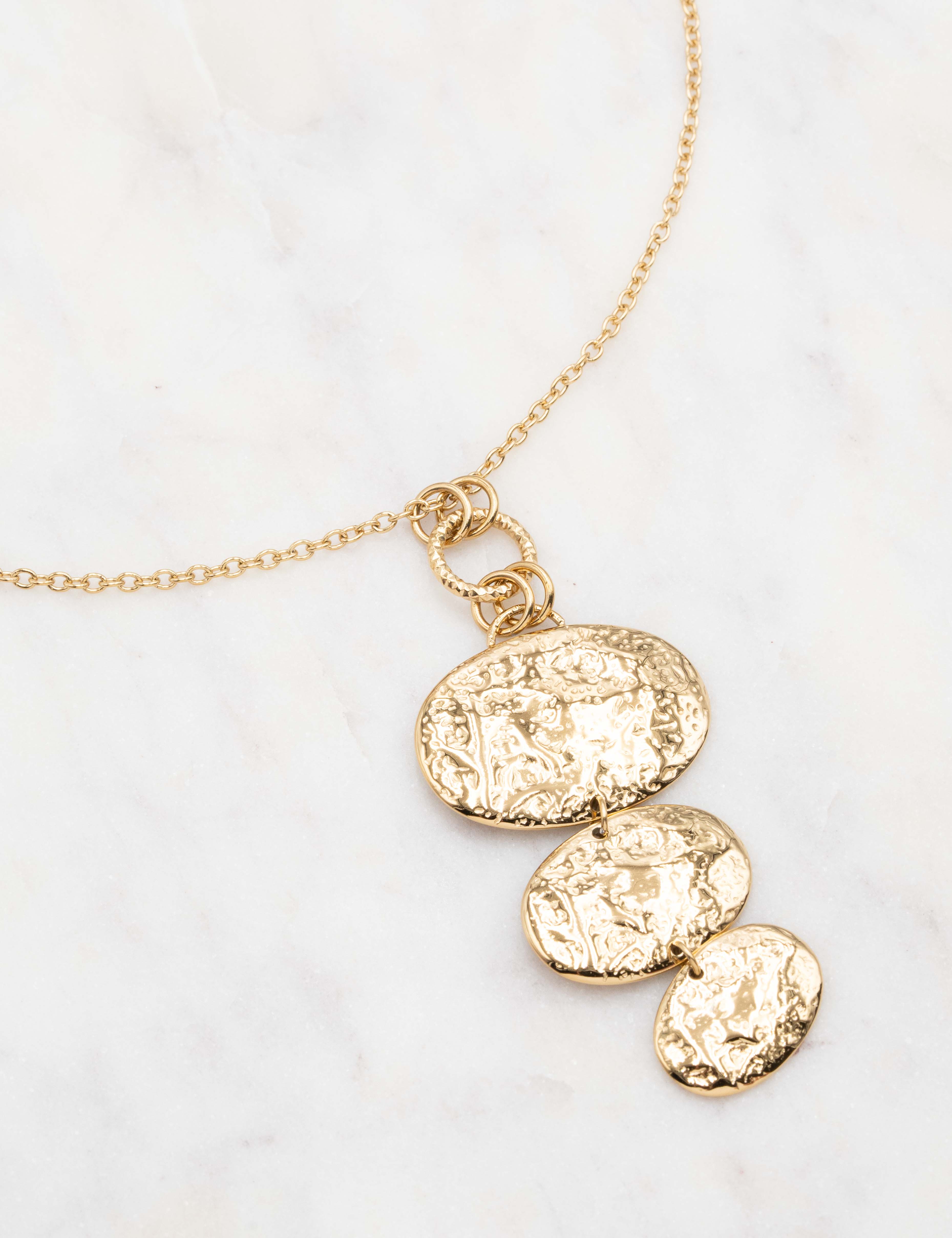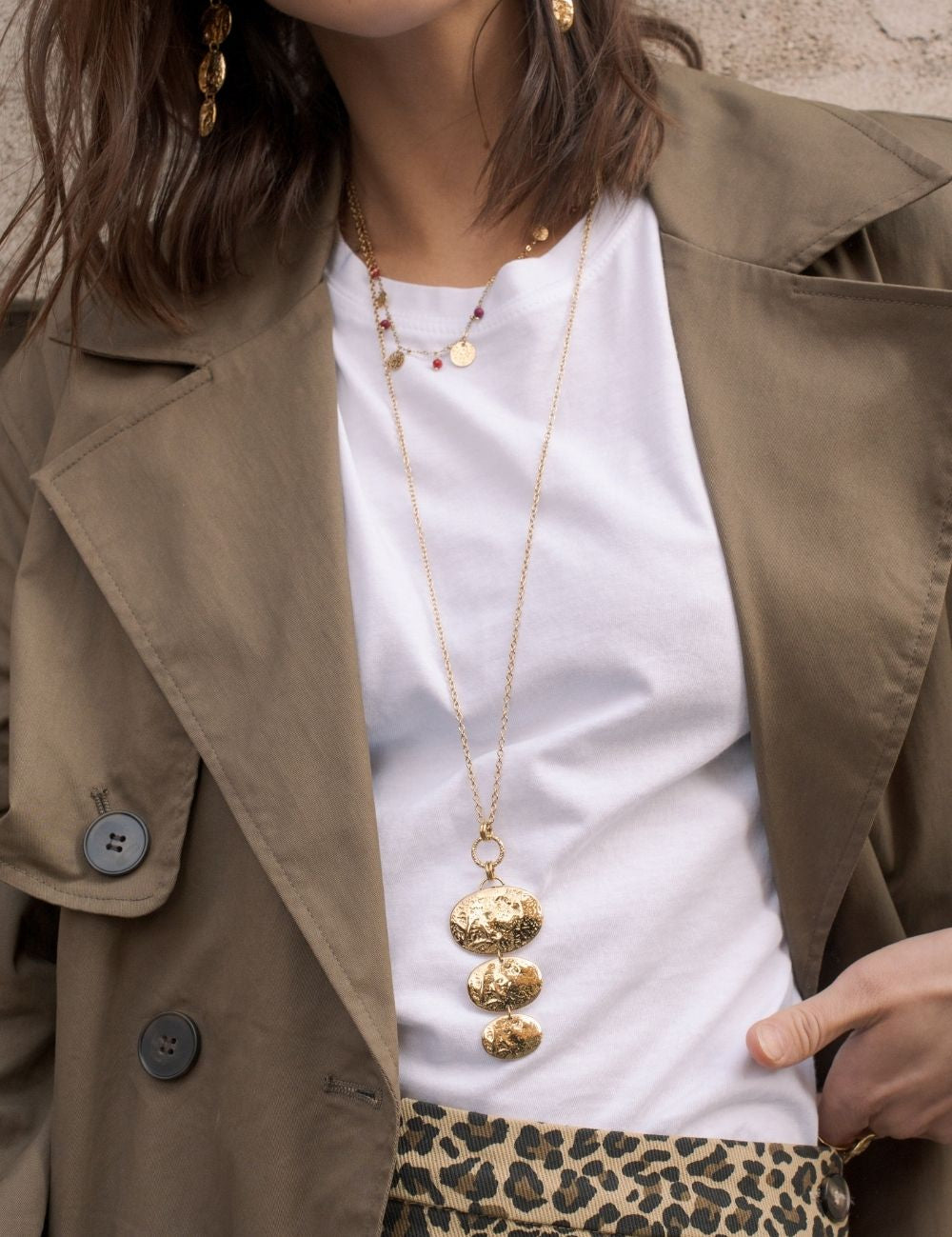 Collier réglable sur chaîne type sautoir composé d'un anneau texturé avec plusieurs pièces martelées et reliefées.