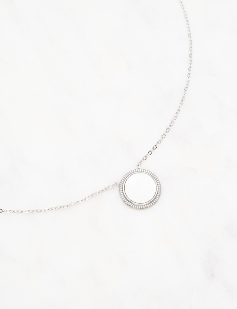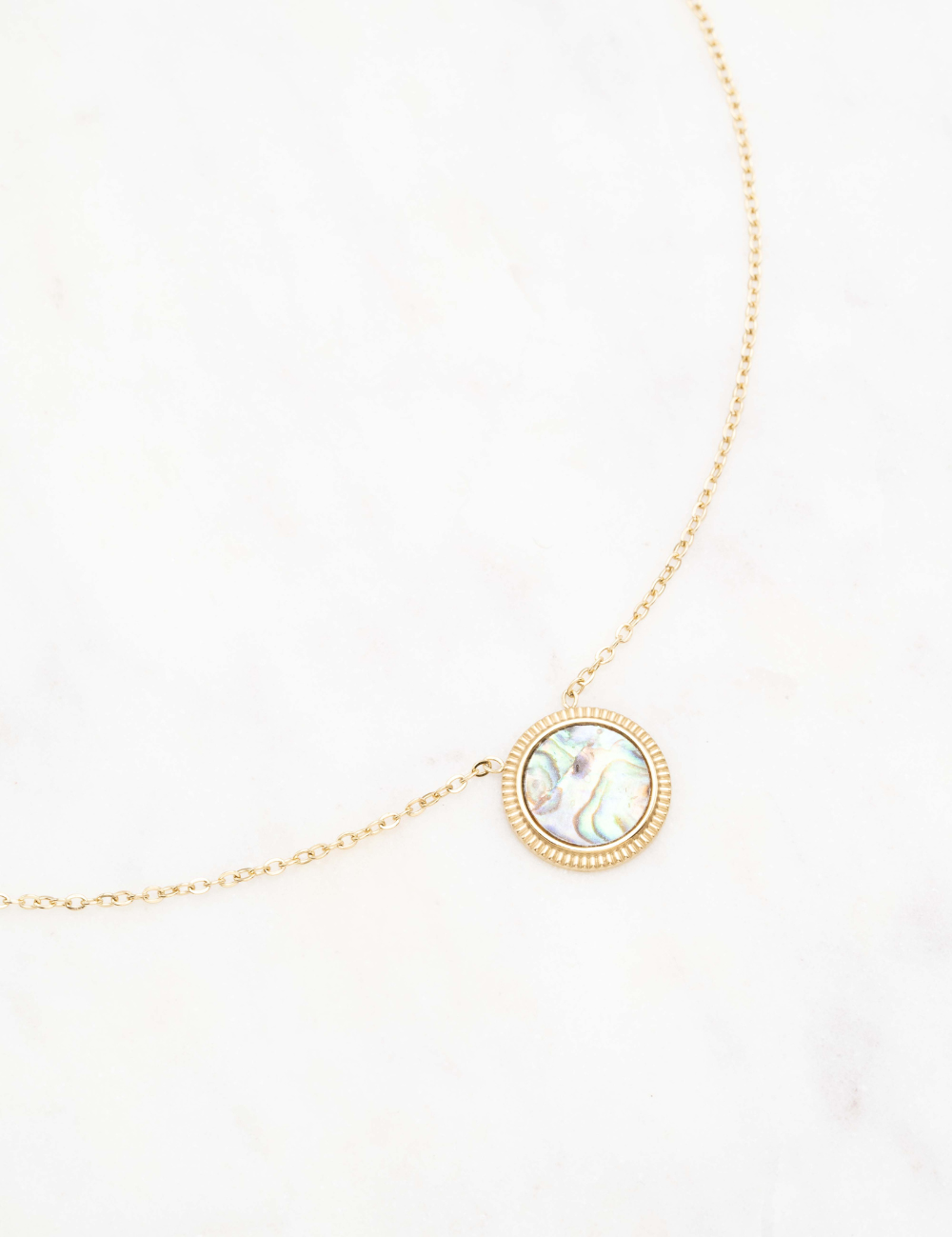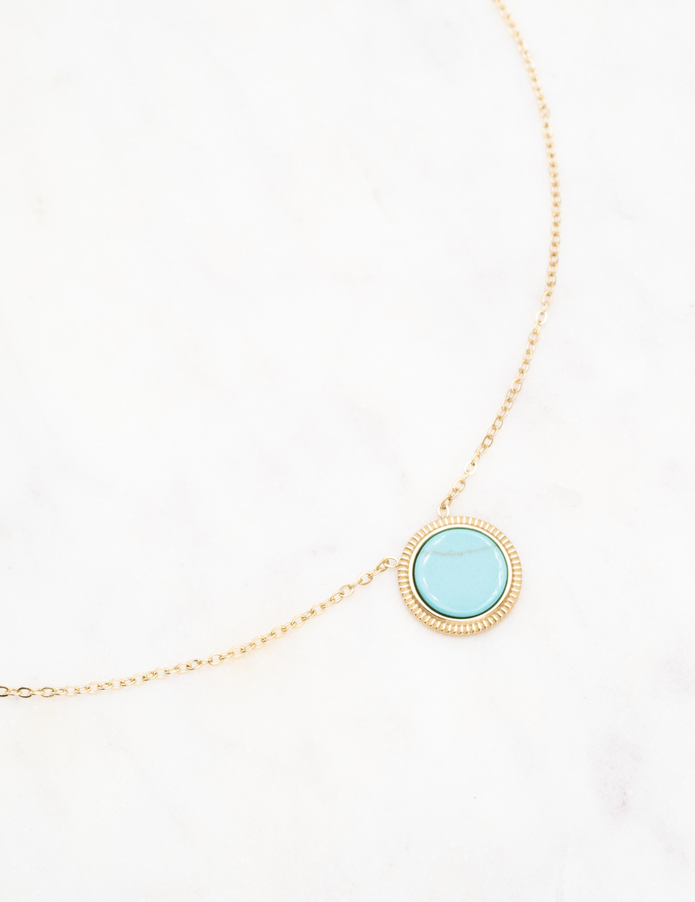 Collier réglable sur chaîne avec une pampille ronde ornée d'une pierre naturelle.