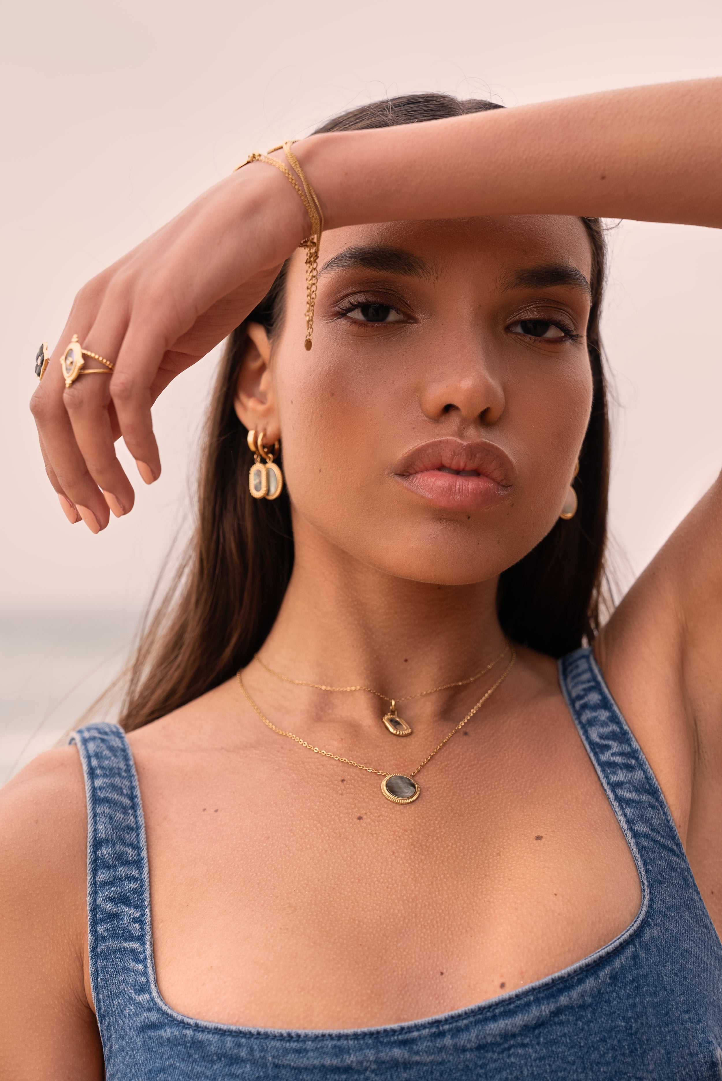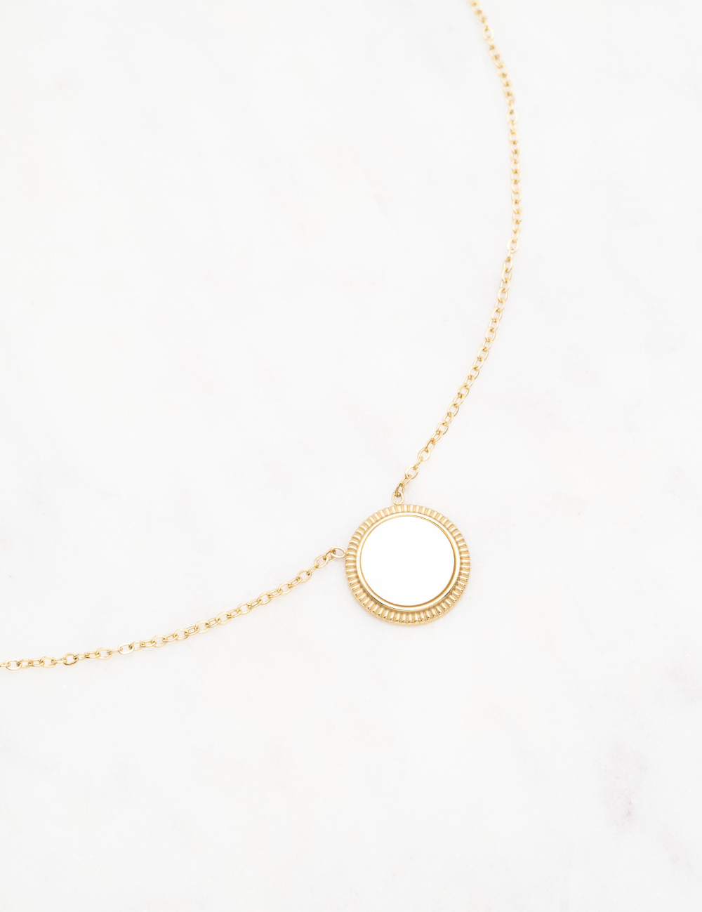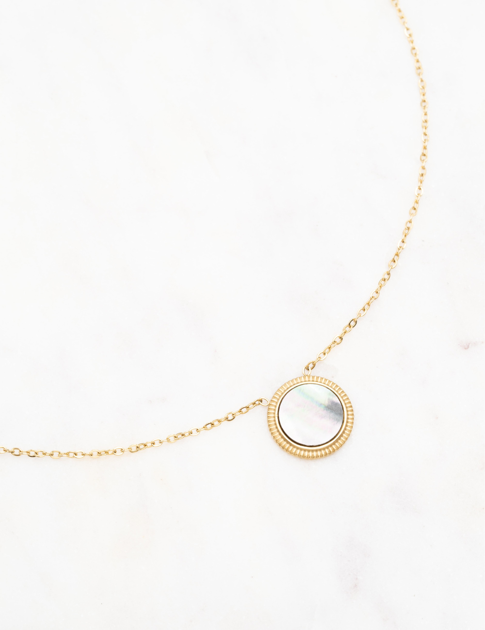 Collier réglable sur chaîne avec une pampille ronde ornée d'une pierre naturelle.