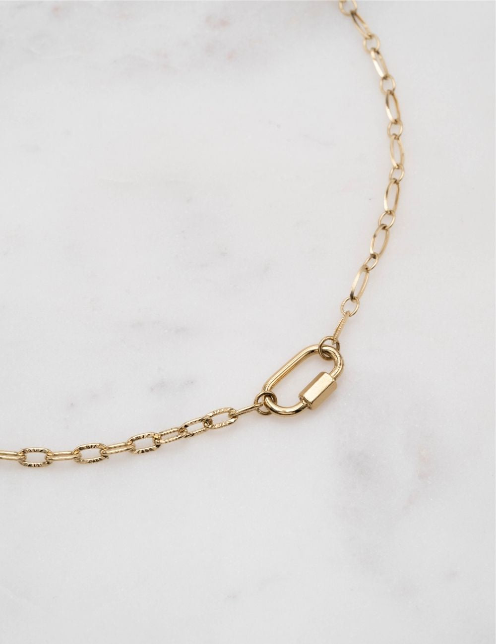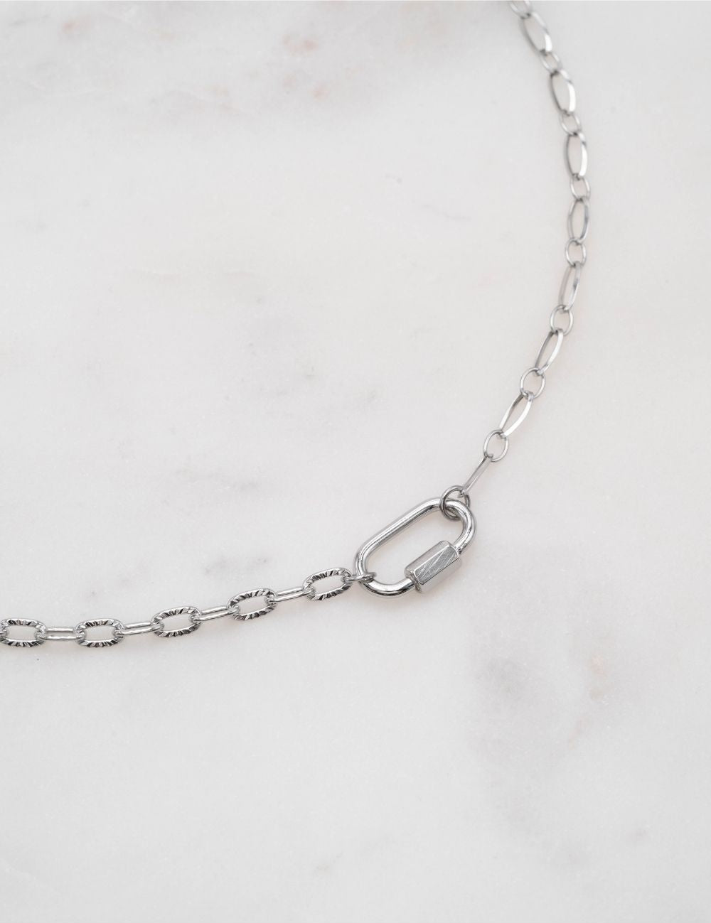 Collier réglable sur chaine à maillons avec un jeu de textures (martelé et lisse) avec une pièce centrale façon cadenas. (Ne s'ouvre pas).