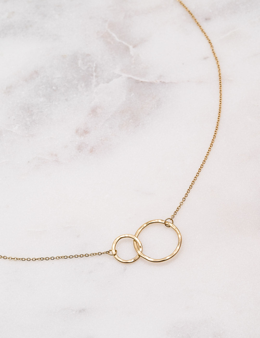 Collier sur chaîne avec fermoir mousqueton et chaînette réglable composé de deux anneaux entrelacés marlelés.