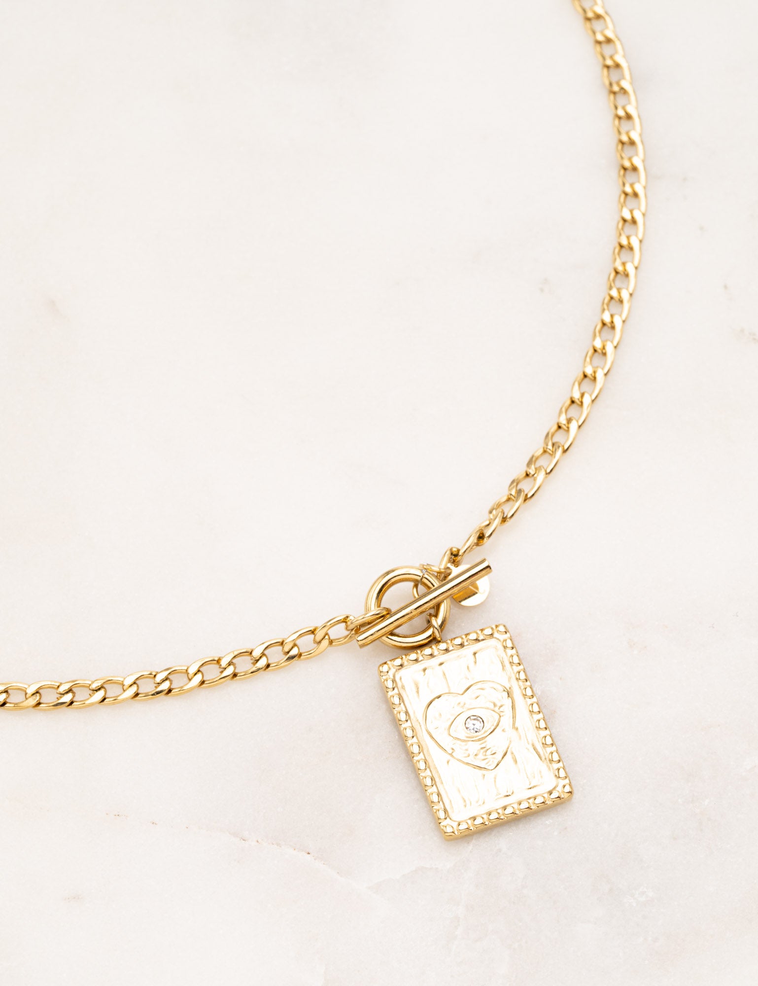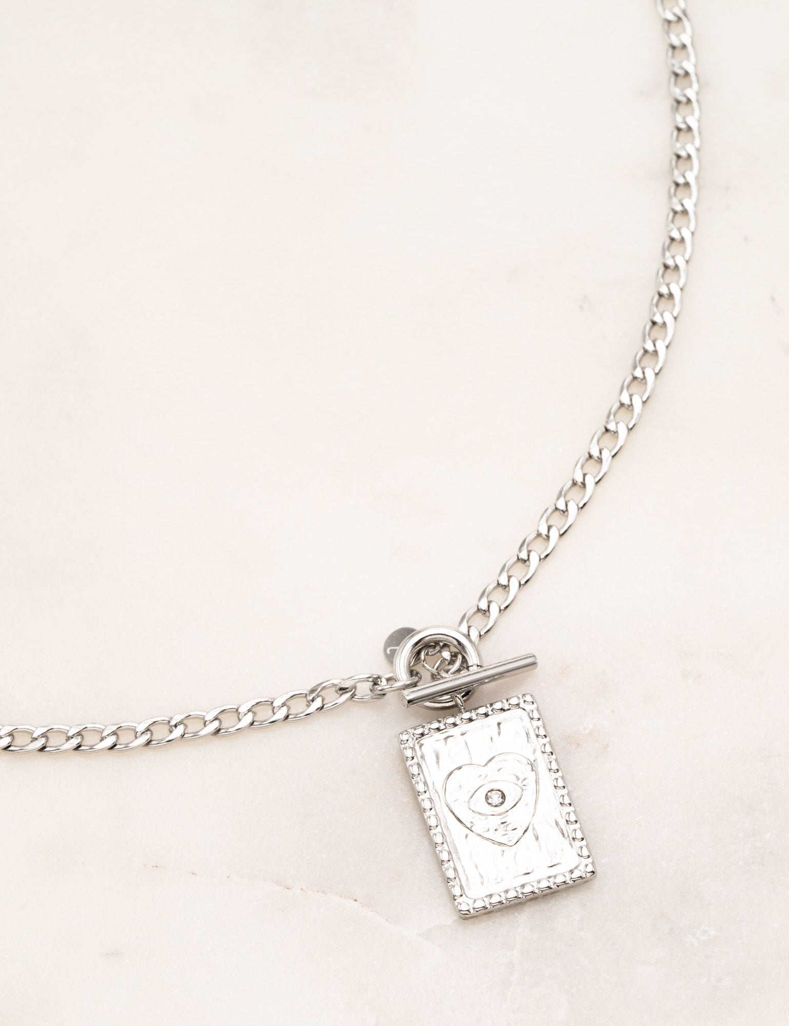 Collier en maille avec une pampille rectangulaire avec un motif de cœur gravé et orné d'un strass (effet œil bienveillant) Fermoir toggle (T) central.