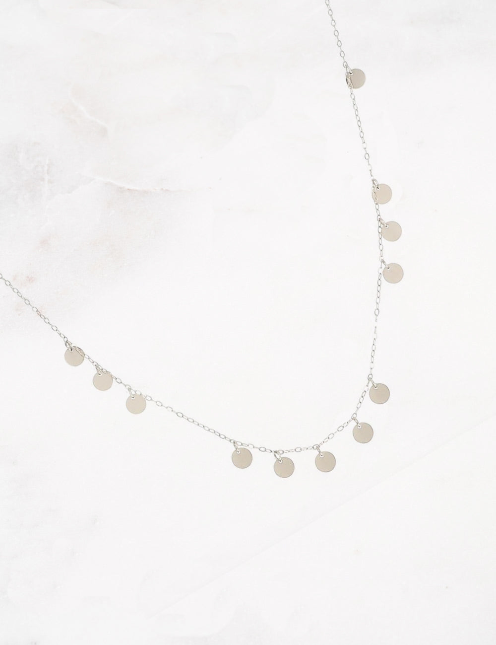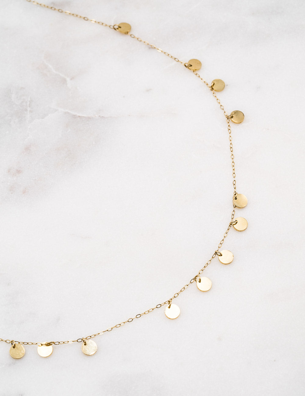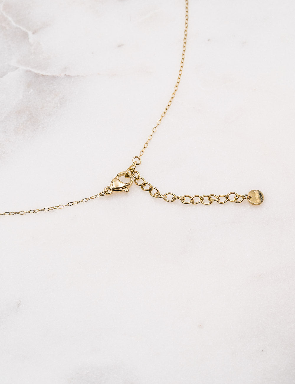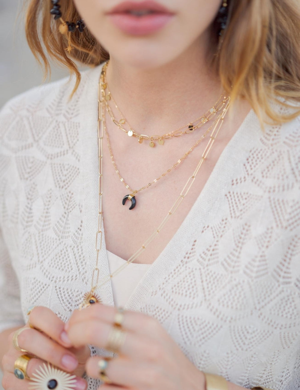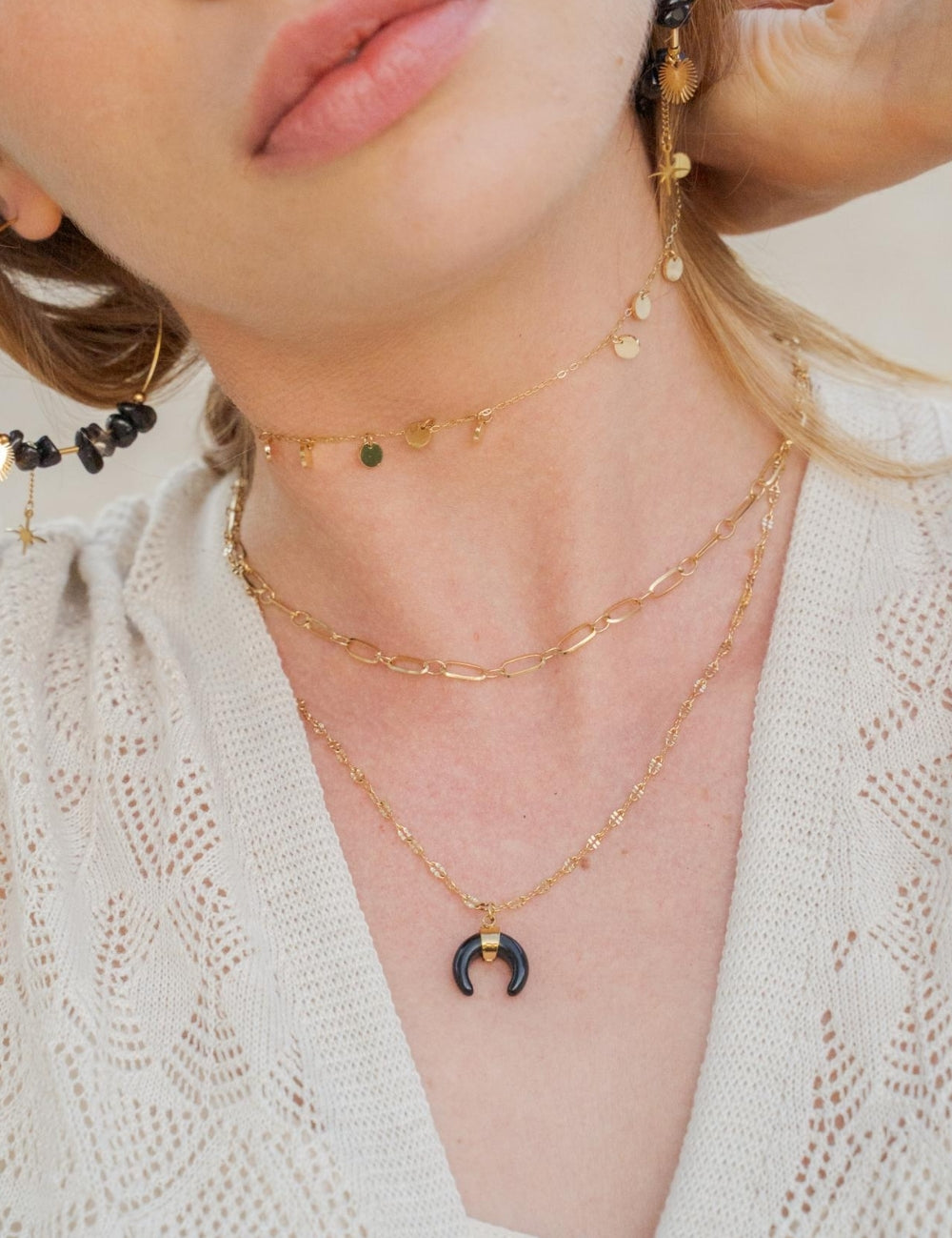 Collier sur chaîne composé de pampilles avec fermoir mousqueton et chaîne de réglage.
