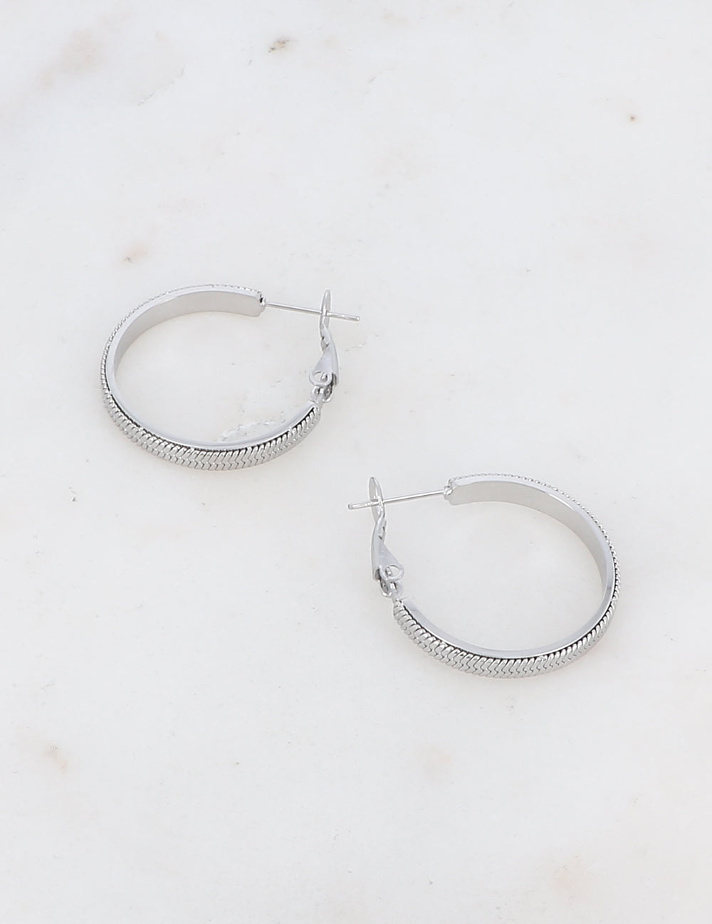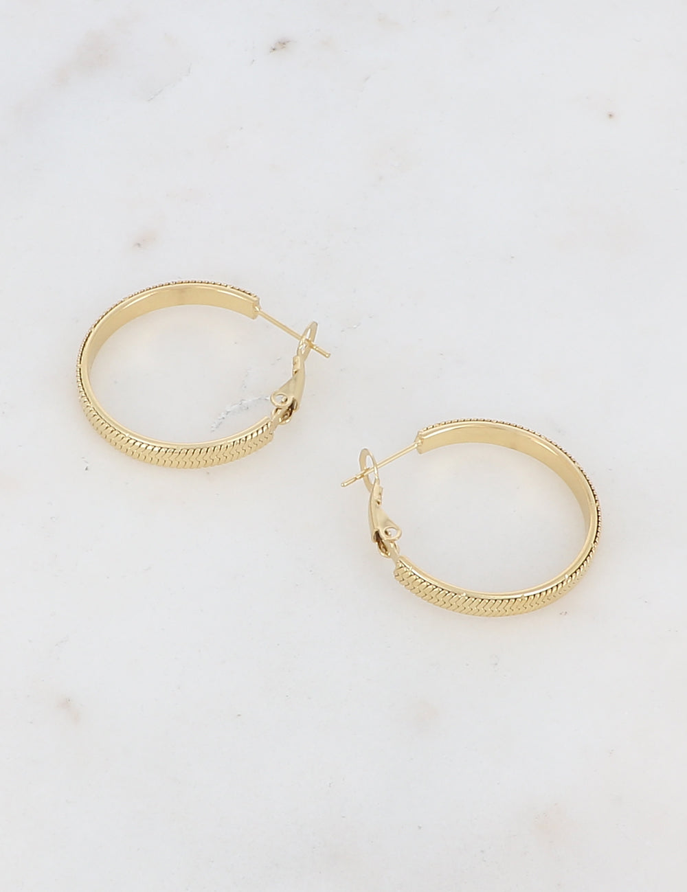 Boucles d'oreilles type créoles effet texturé façon maille plate. Fermoir cliquet.