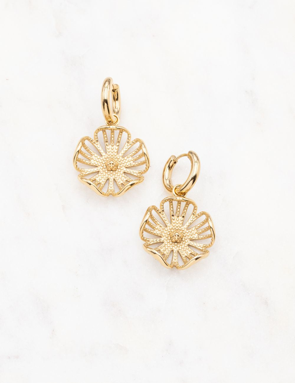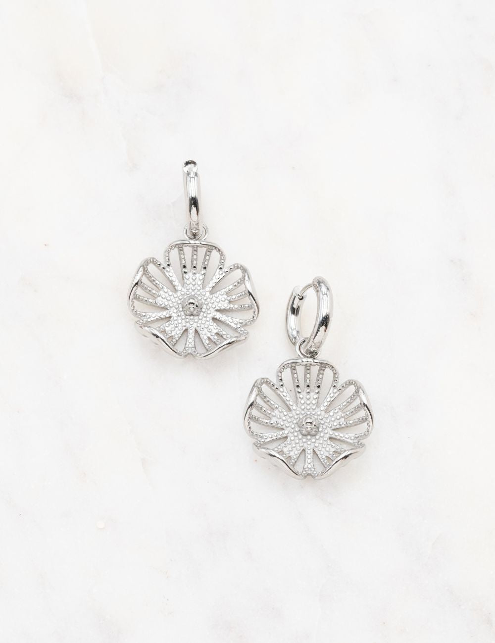 Boucles d'oreilles graphiques type créoles composées d'un pendant formant une fleur ajourée et texturée.