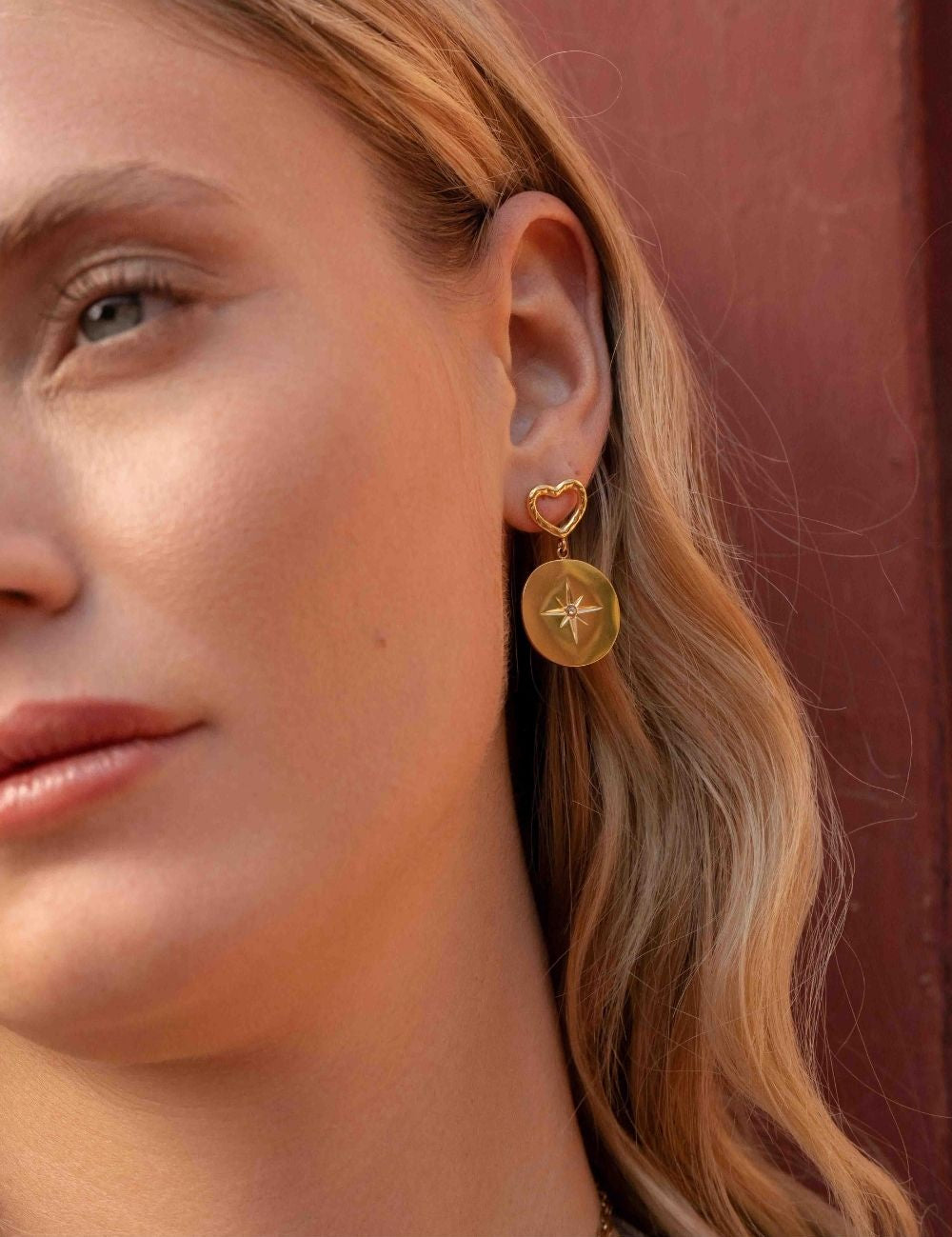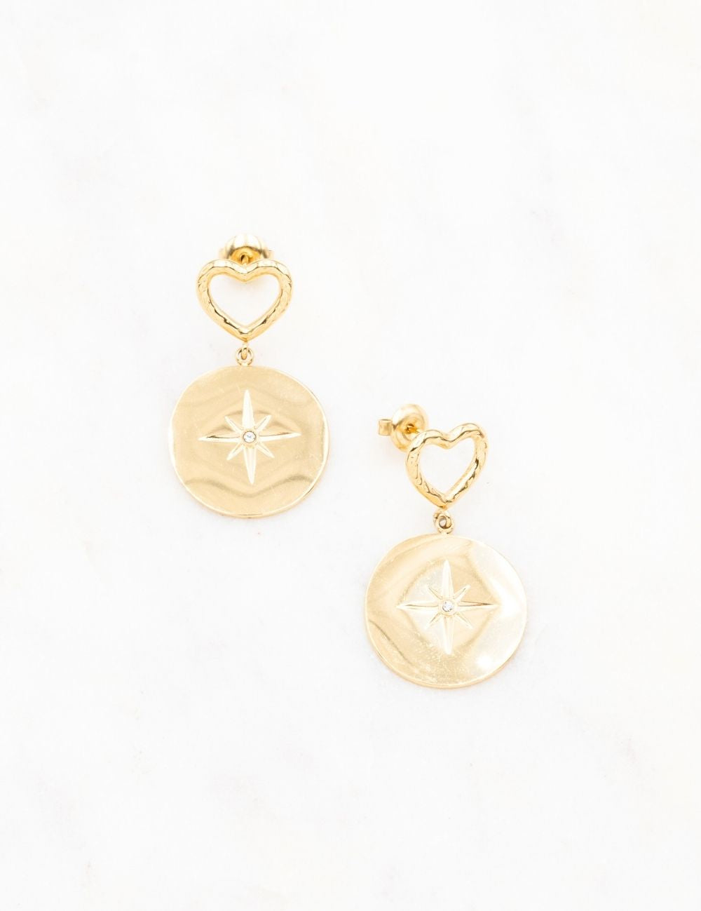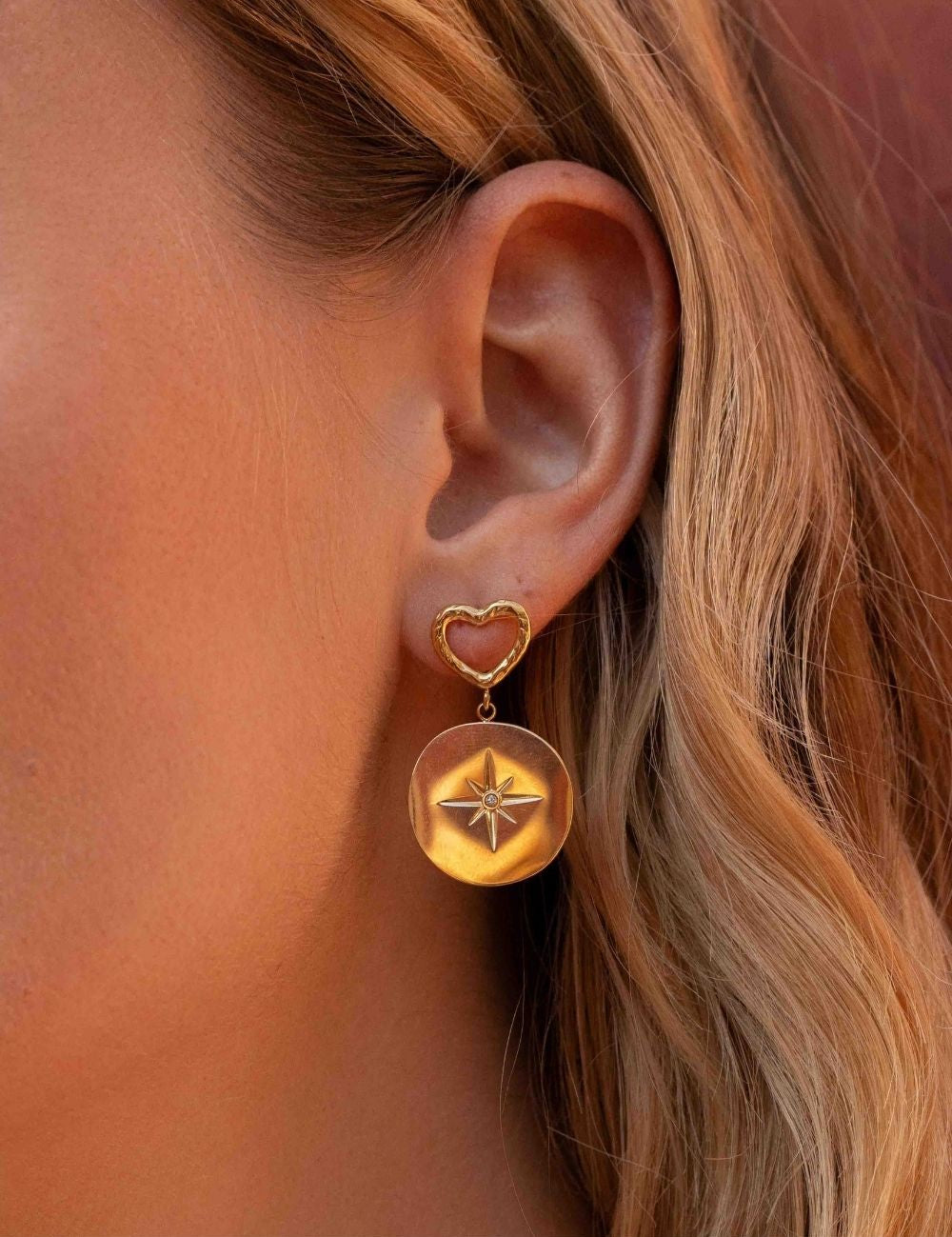 Boucles d'oreilles graphiques à puce composées d'une pièce formant un cœur ajouré texturé orné d'un pendant embelli d'un strass zirconium.