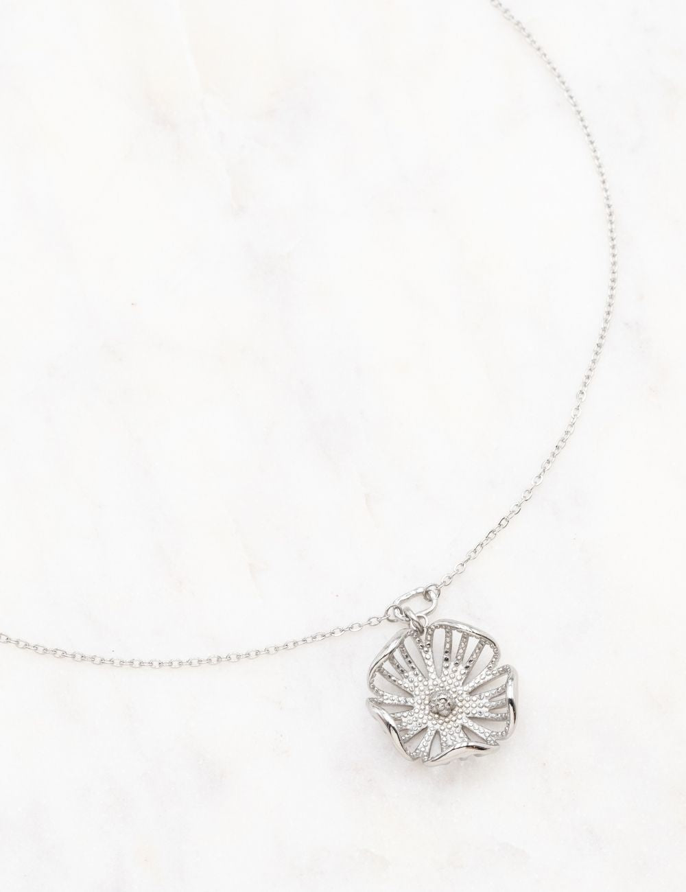 Collier réglable sur chaine composé d'un pendant formant une fleur ajourée et texturée.