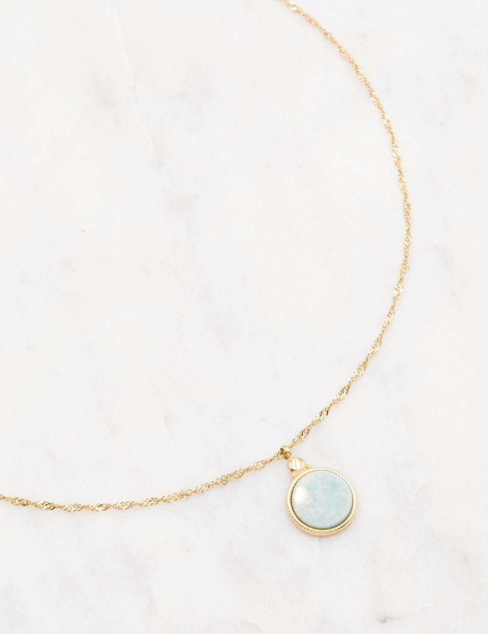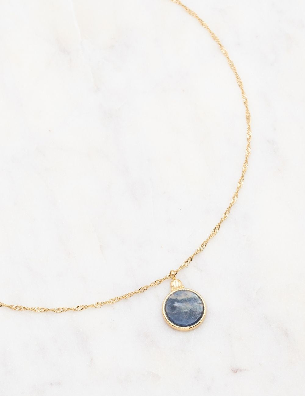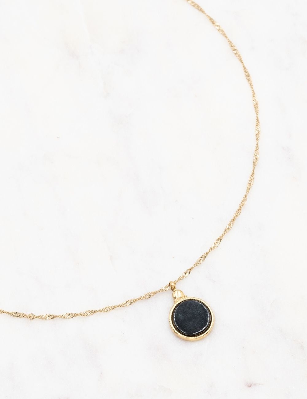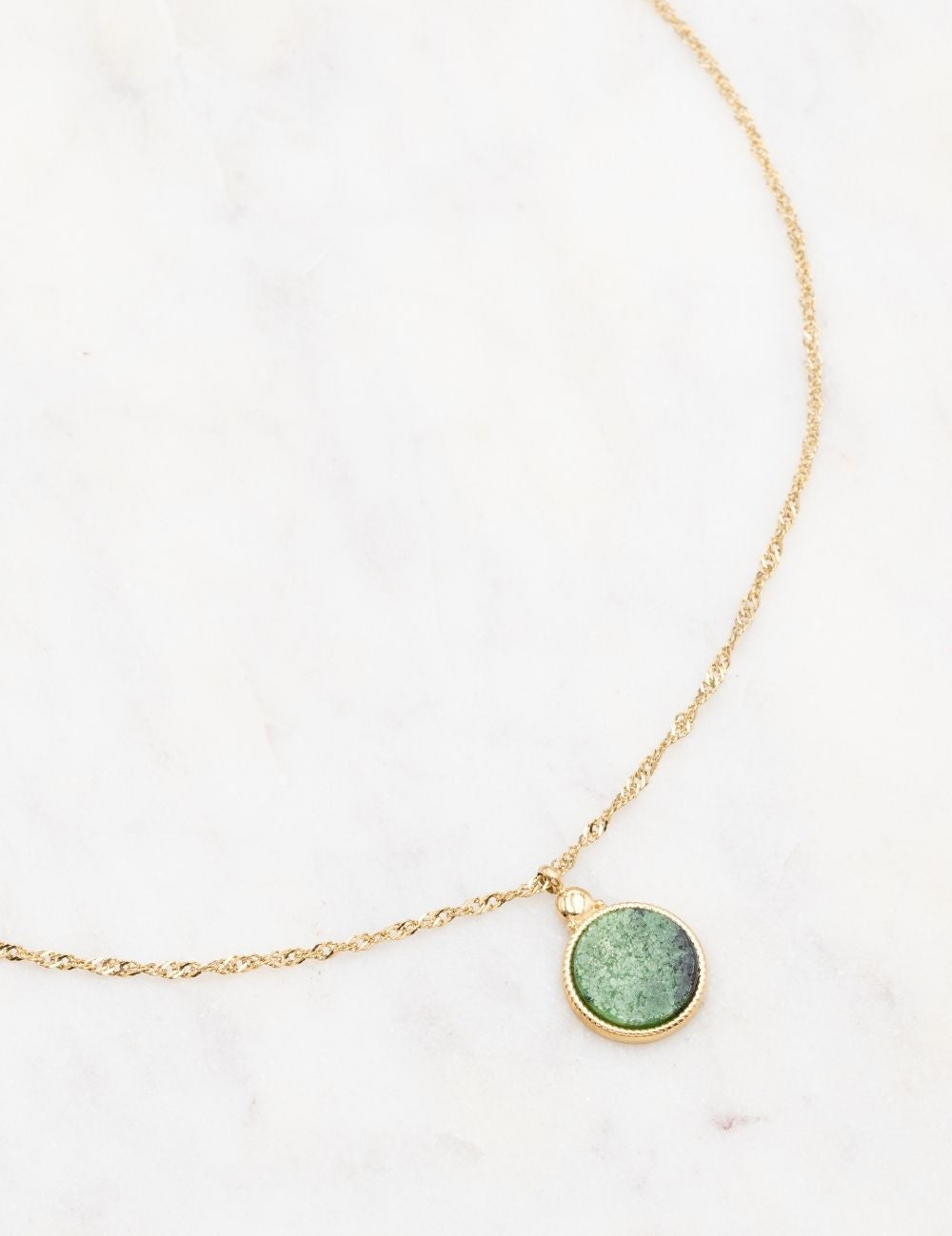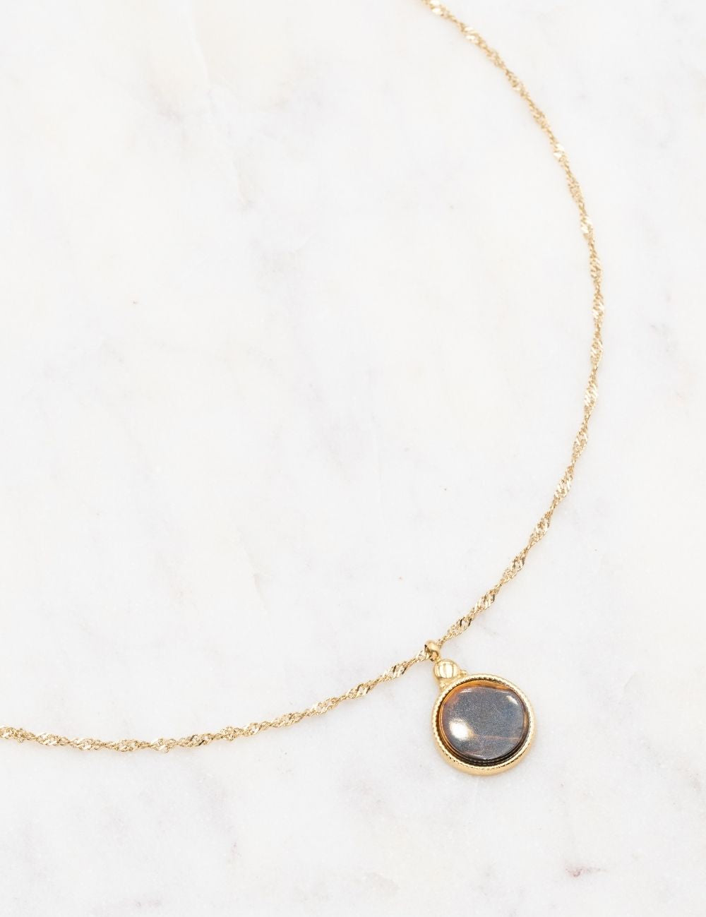 Collier réglable sur chaine composé d'un pendant rond serti d'une pierre naturelle.