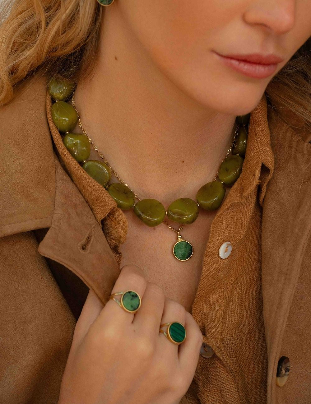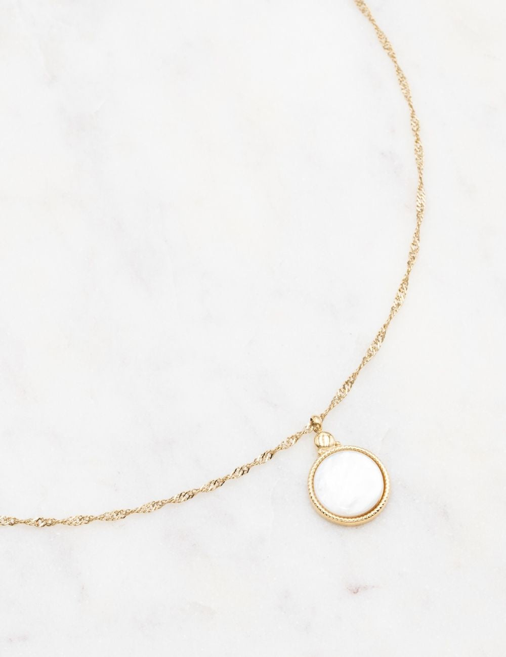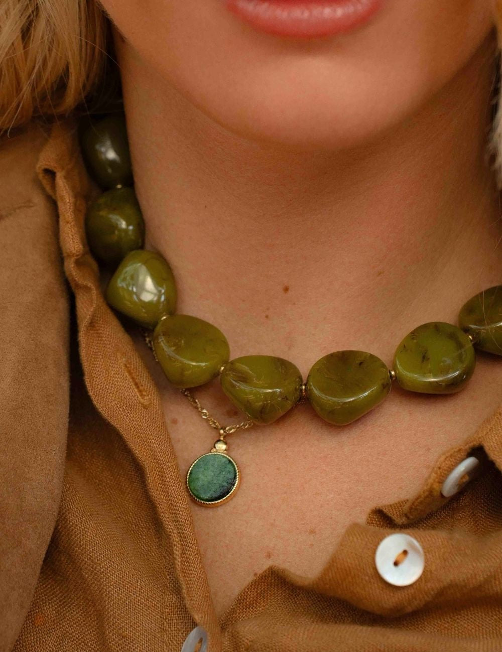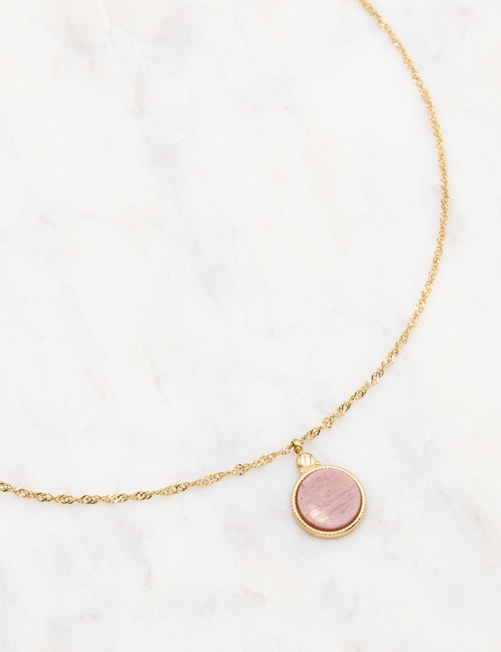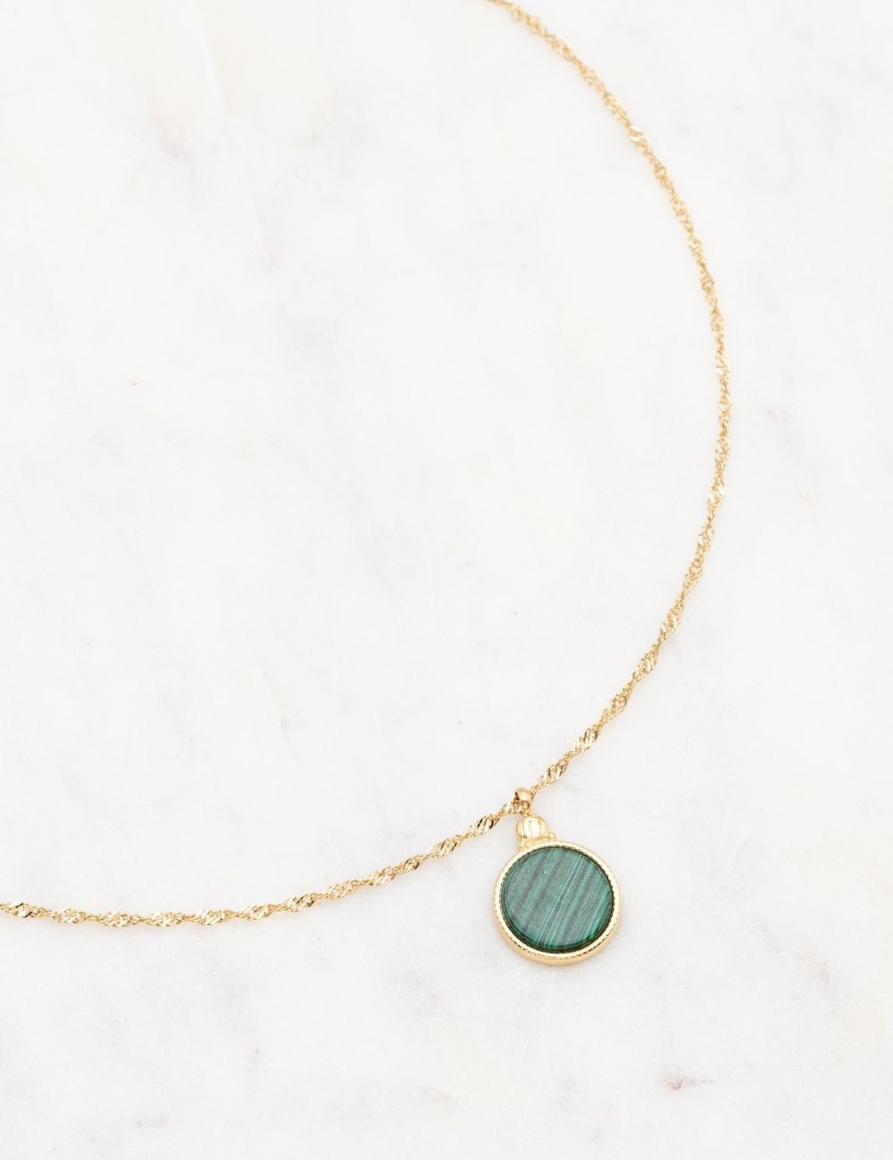 Collier réglable sur chaine composé d'un pendant rond serti d'une pierre naturelle.