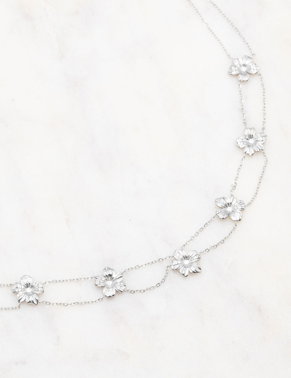 Collier réglable sur chaine composé de 2 rangs ornés de pièces au motif floral texturé.