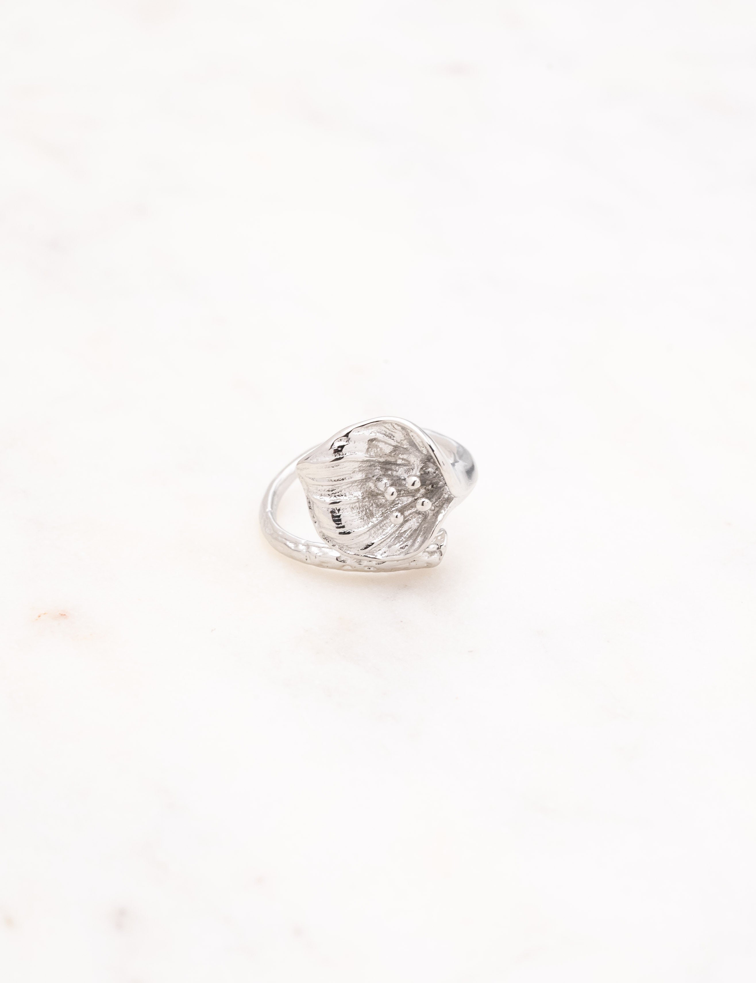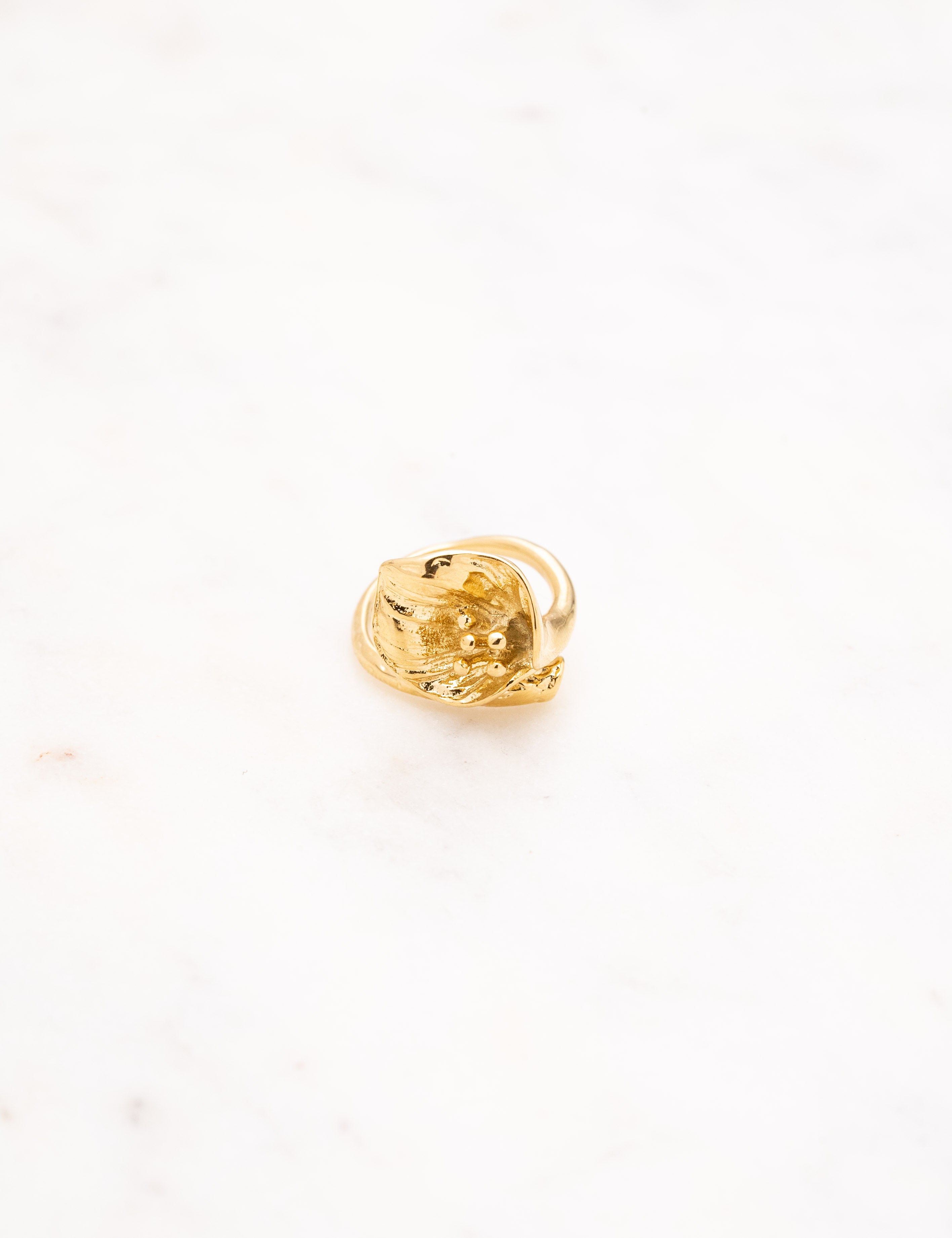Bague graphique composée d'une feuille texturée. Ajustable par le devant.
