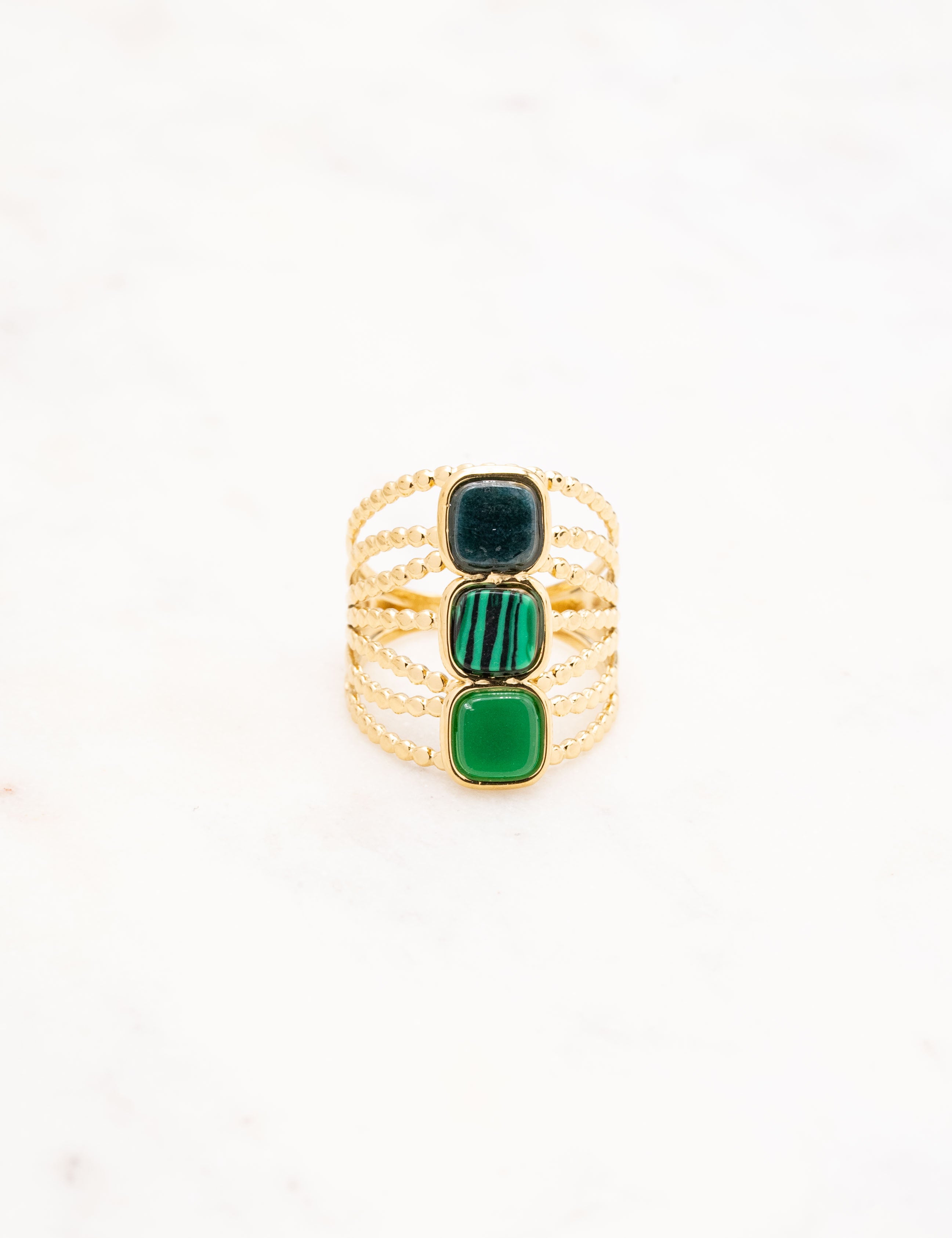 Bague graphique ajustable multi-rangs effet canelé ornée de pierres naturelles.