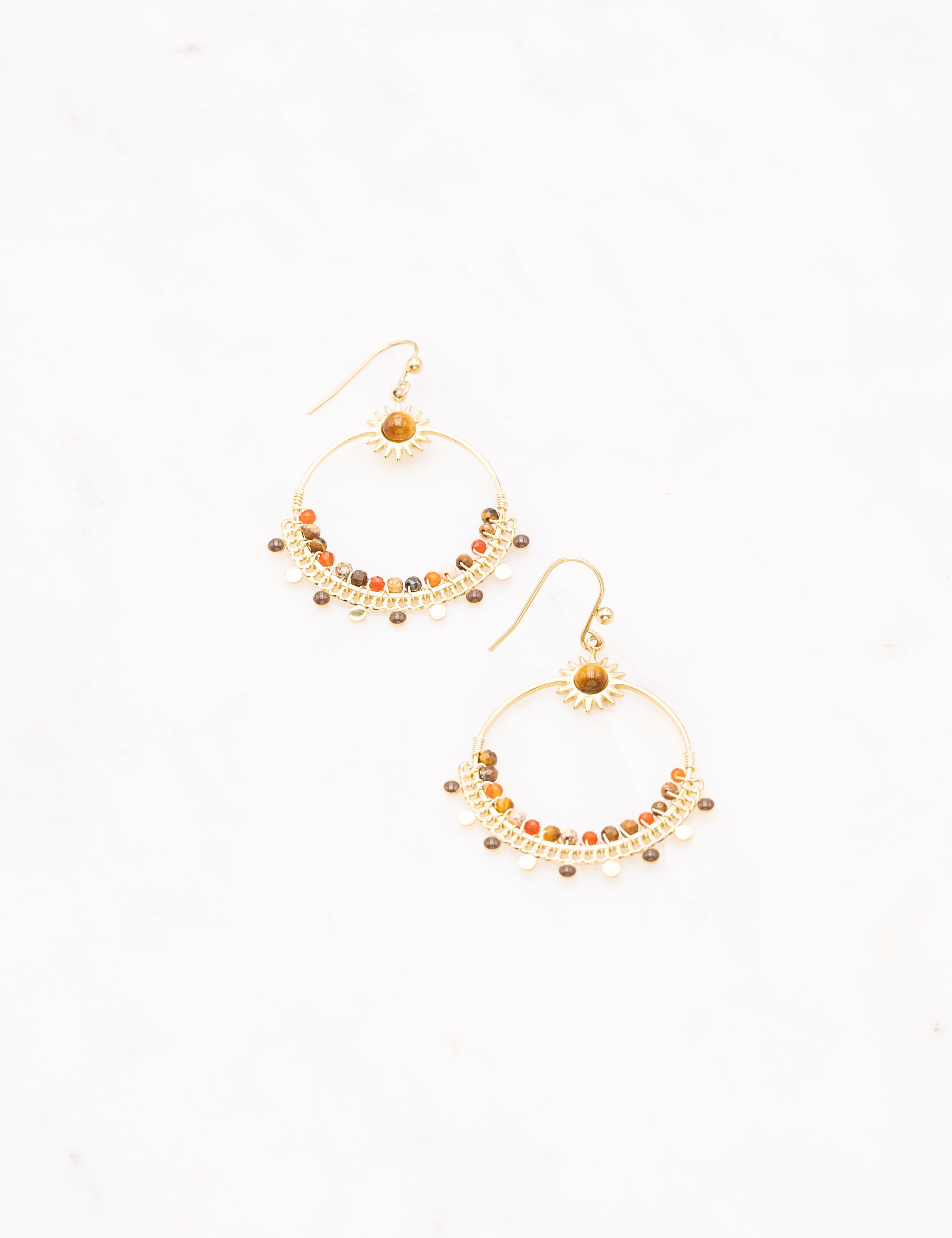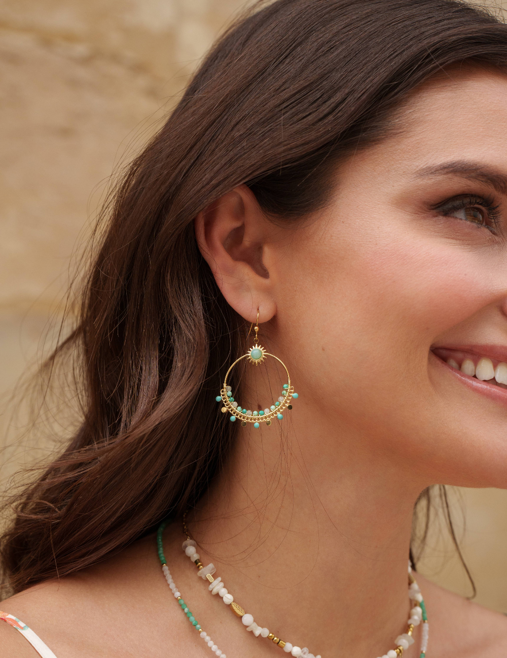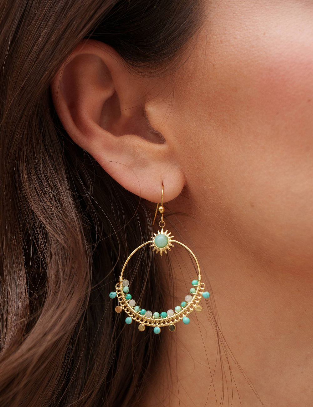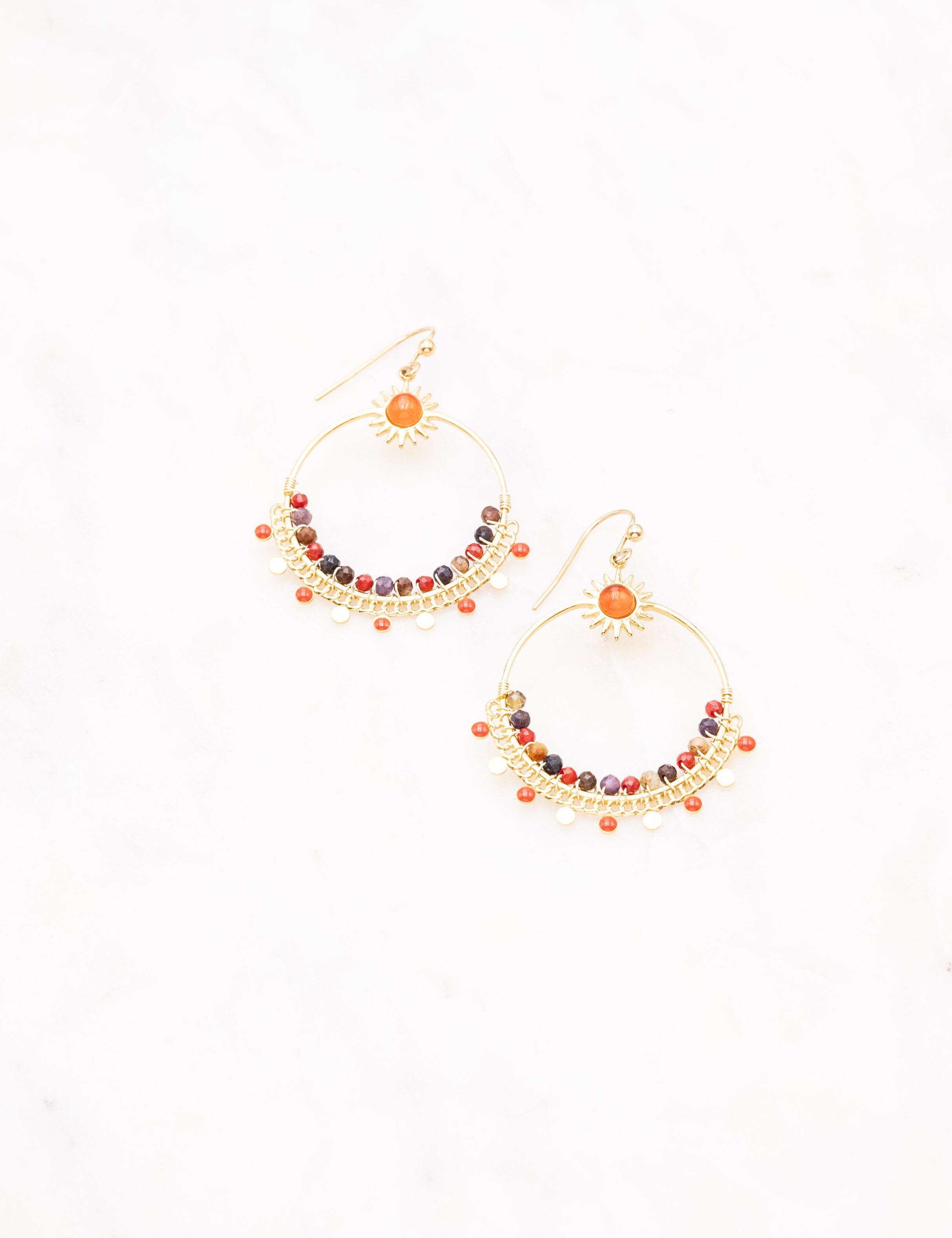 Boucles d'oreilles graphiques à crochet composées d'un anneau orné d'un soleil serti d'une pierre naturelle, de pièces émaillées colorées et d'un mélange subtil de perles en pierre naturelle.