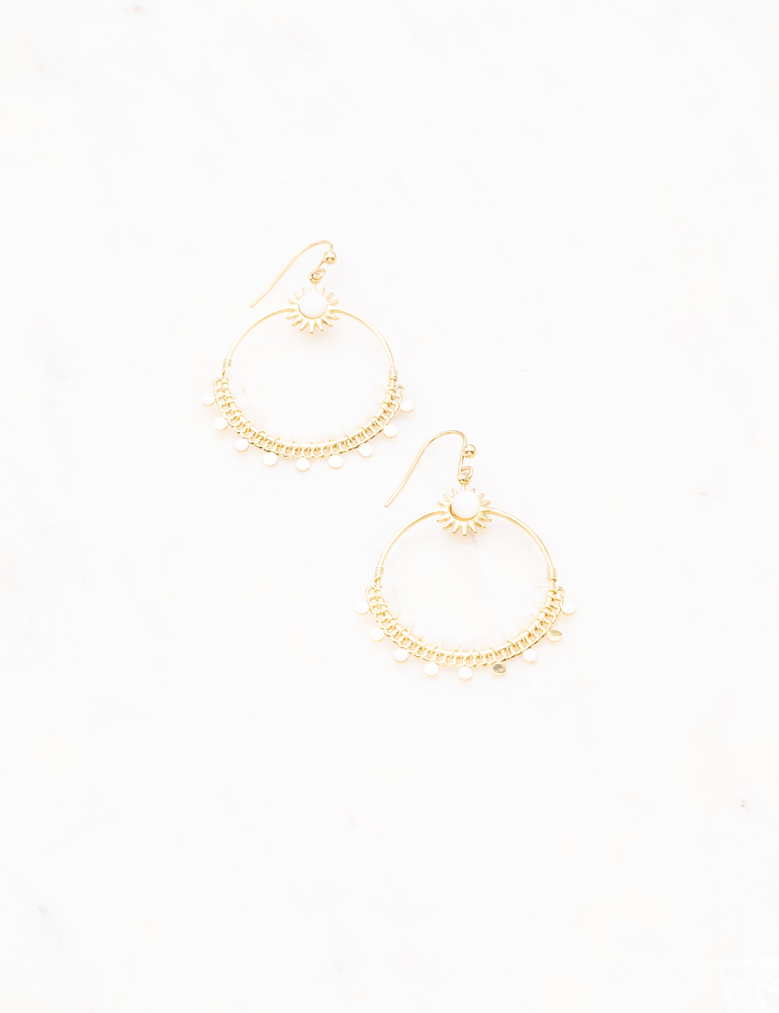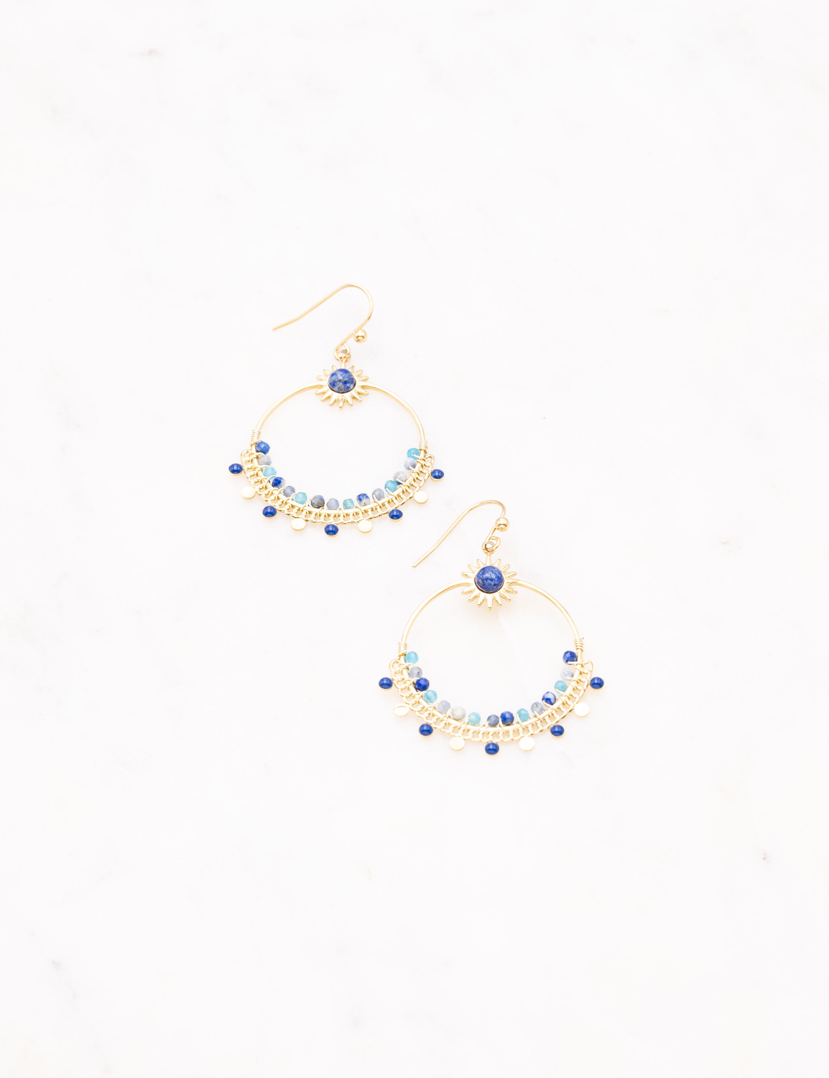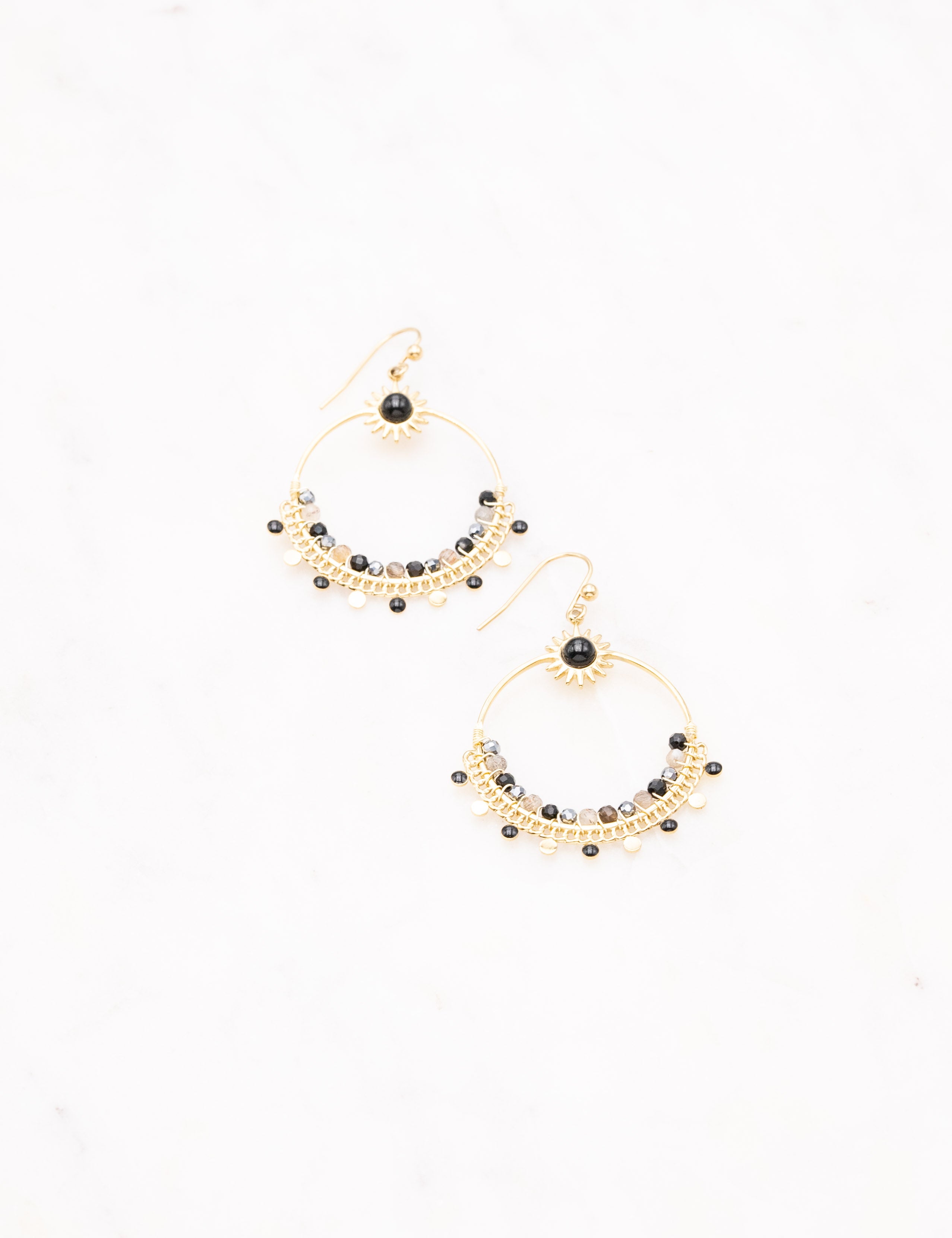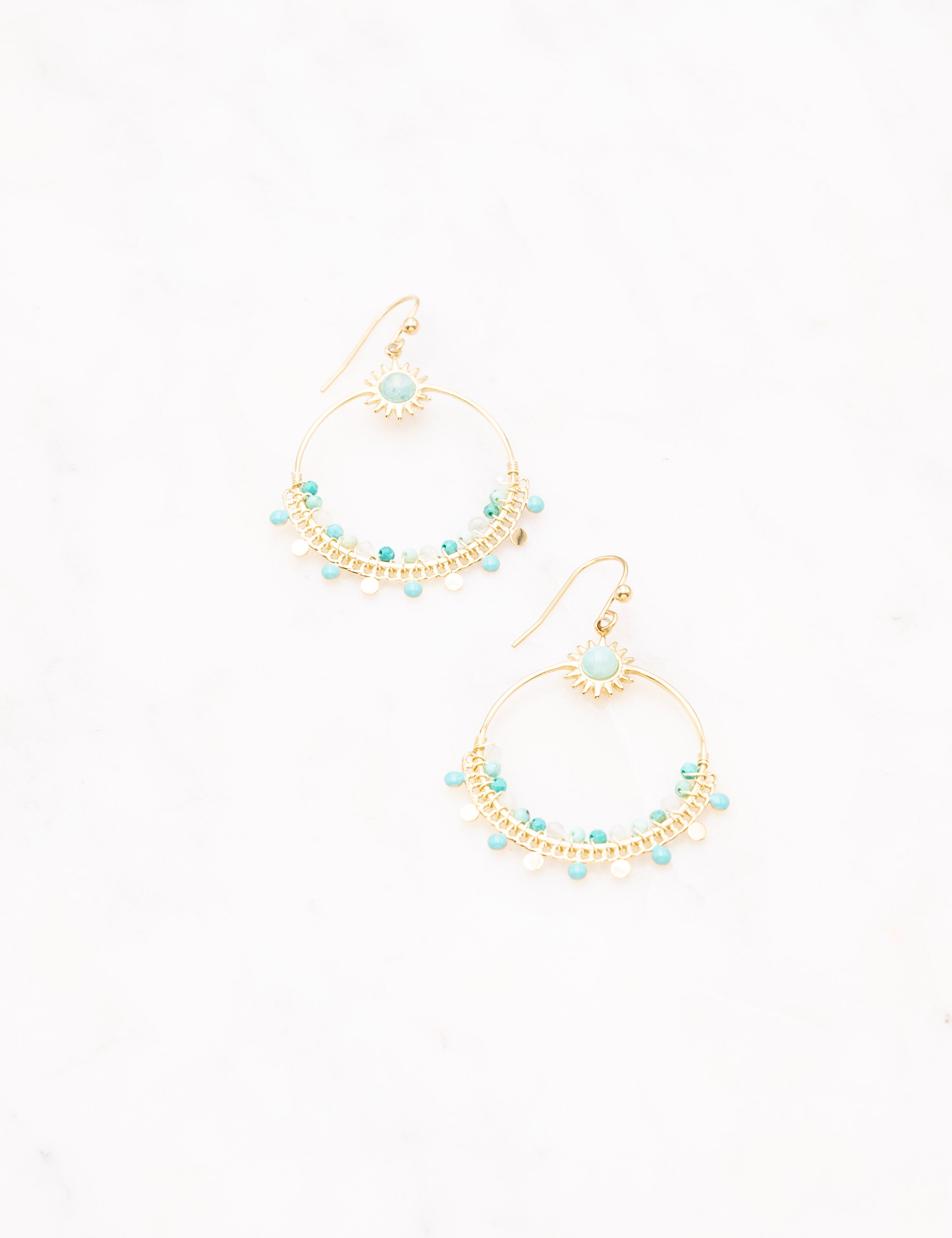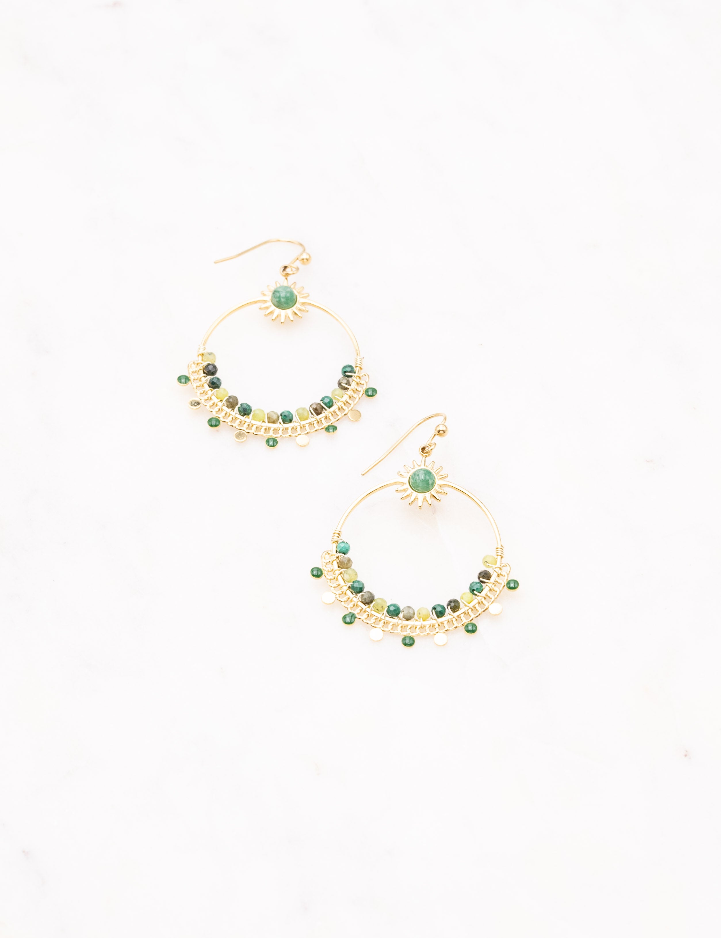 Boucles d'oreilles graphiques à crochet composées d'un anneau orné d'un soleil serti d'une pierre naturelle, de pièces émaillées colorées et d'un mélange subtil de perles en pierre naturelle.
