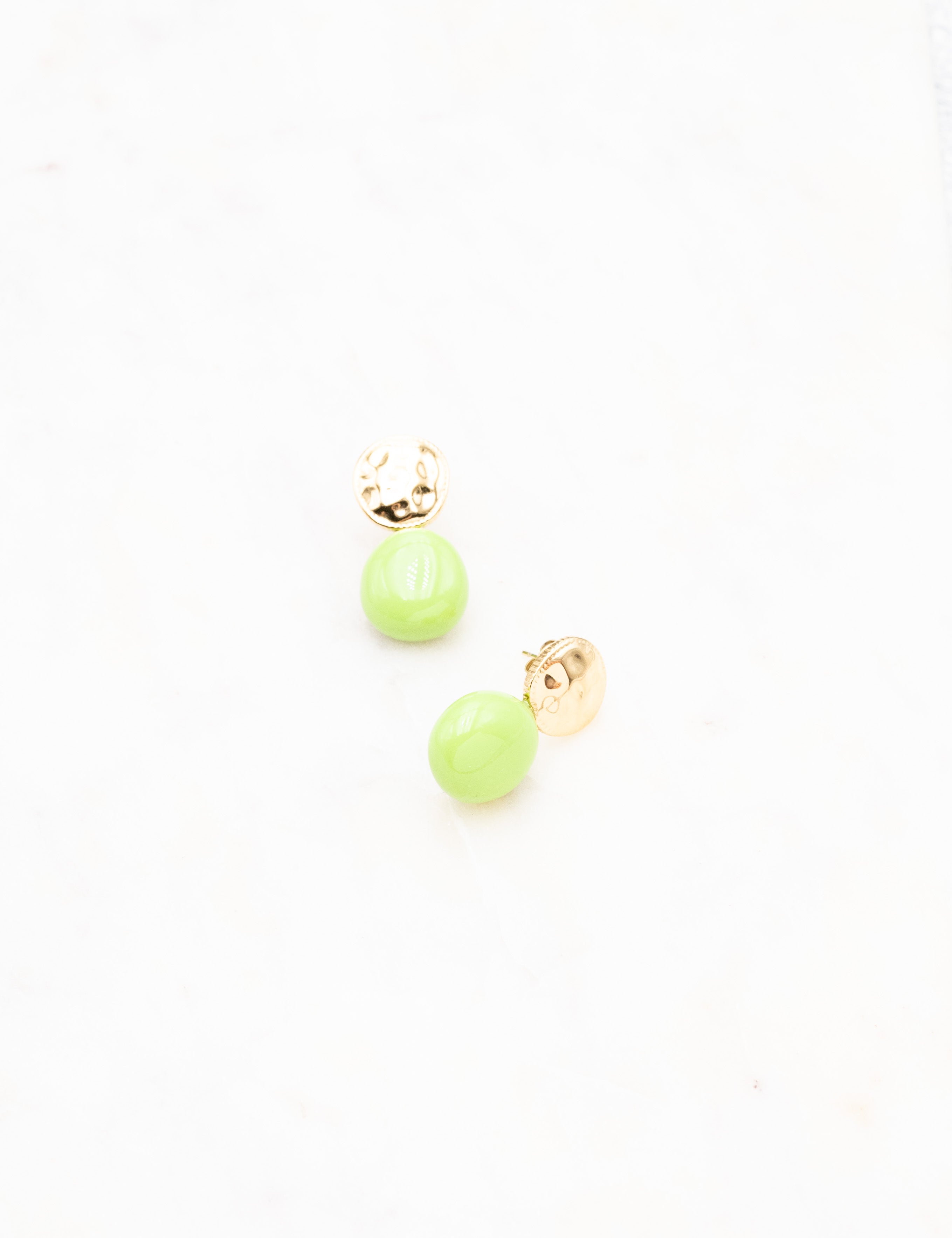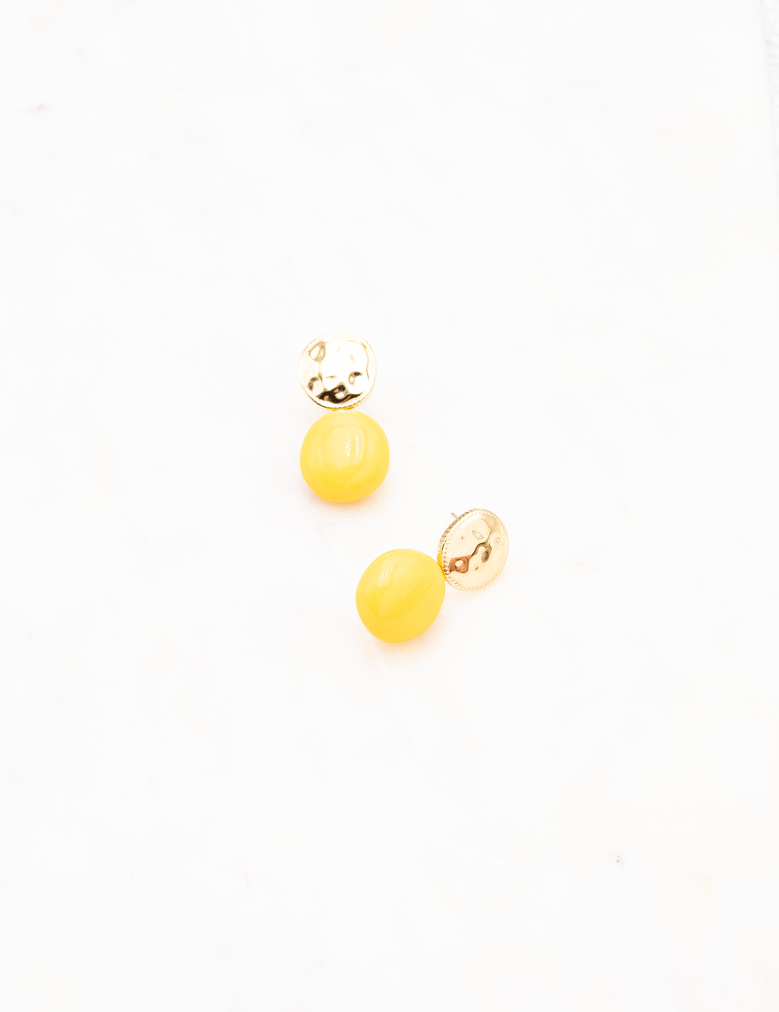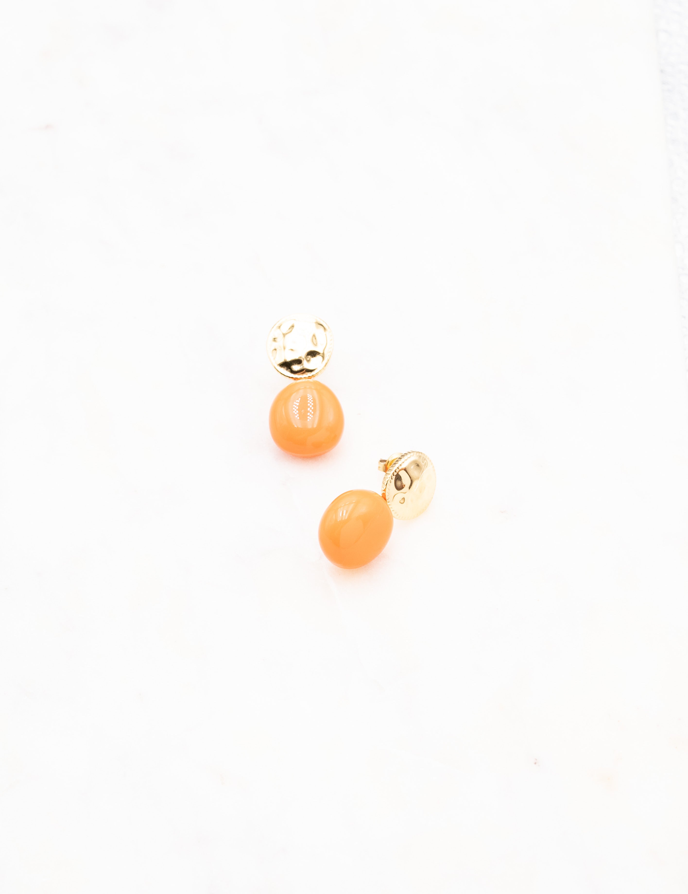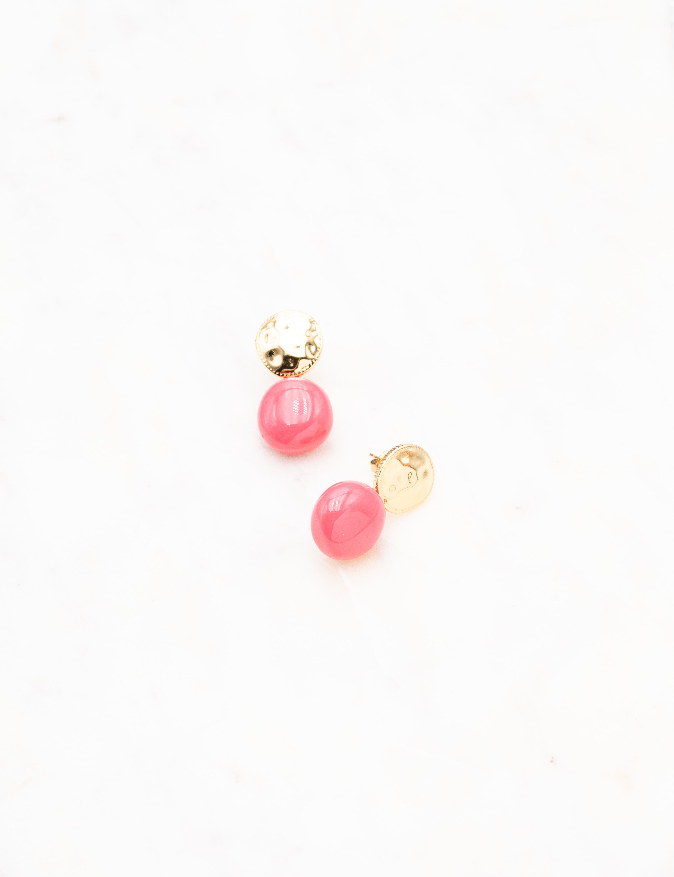 Boucles d'oreilles à puce composées d'une pièce ronde texturée et d'une perle en résine colorée.