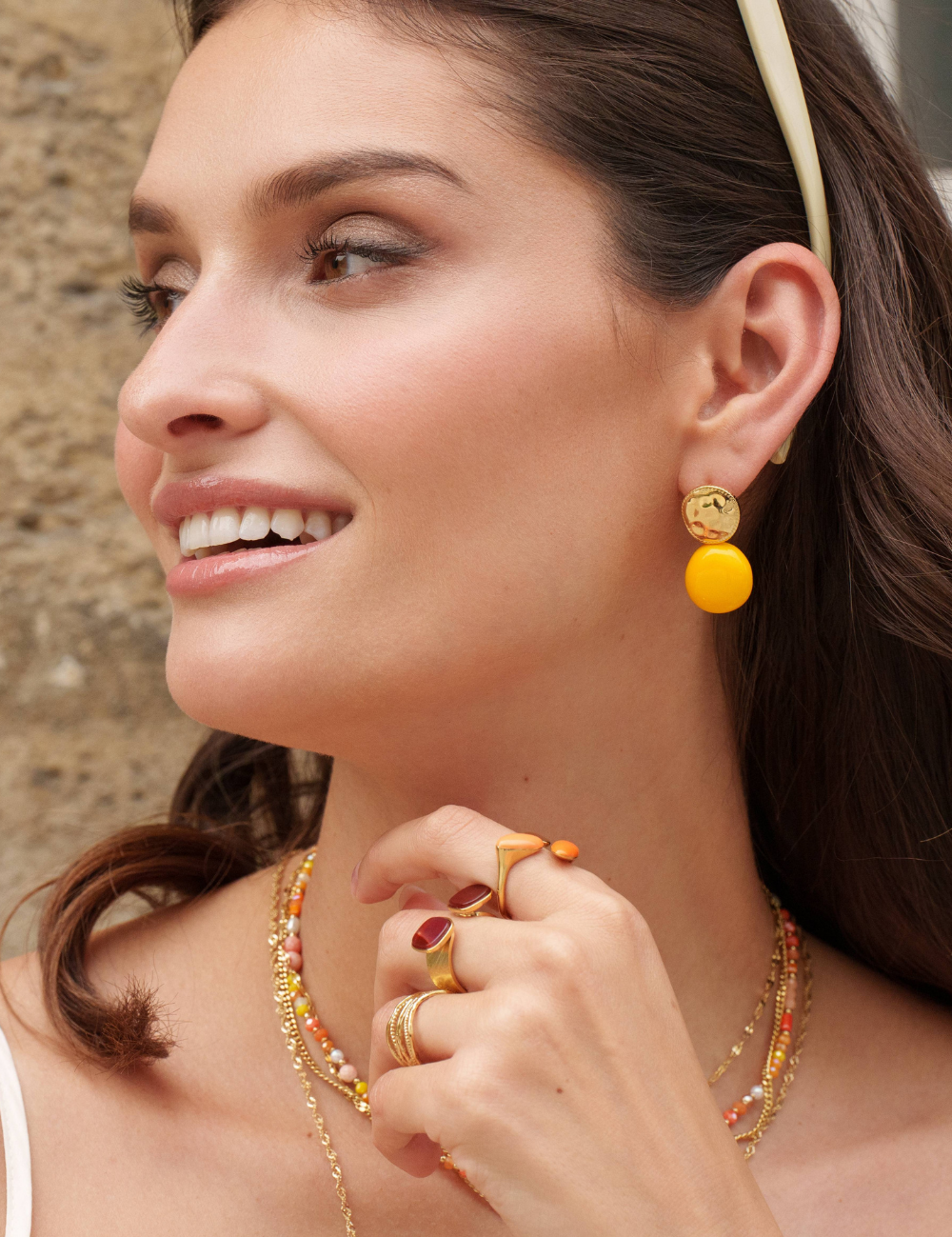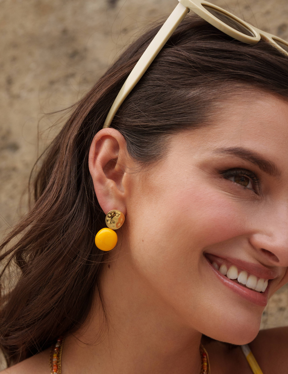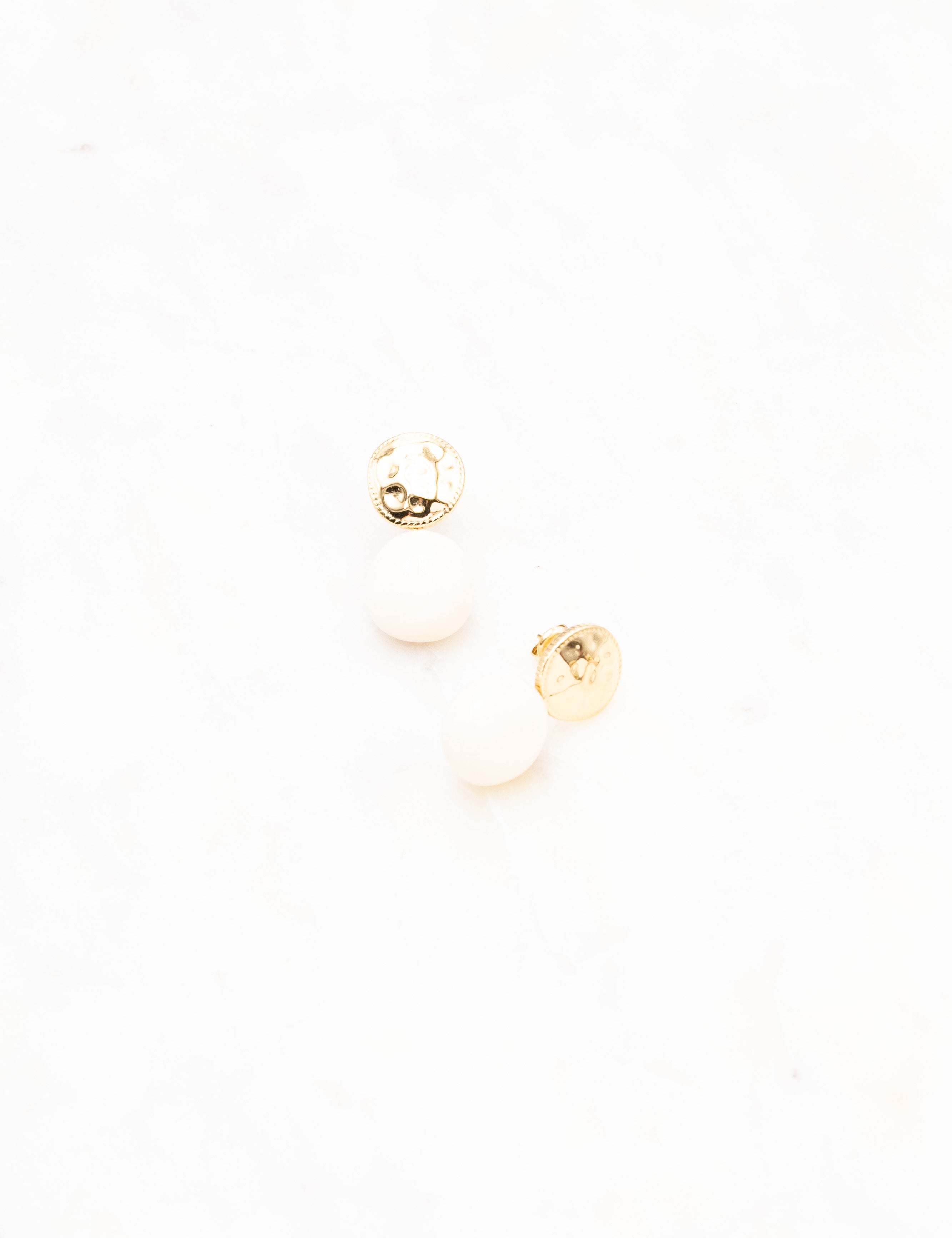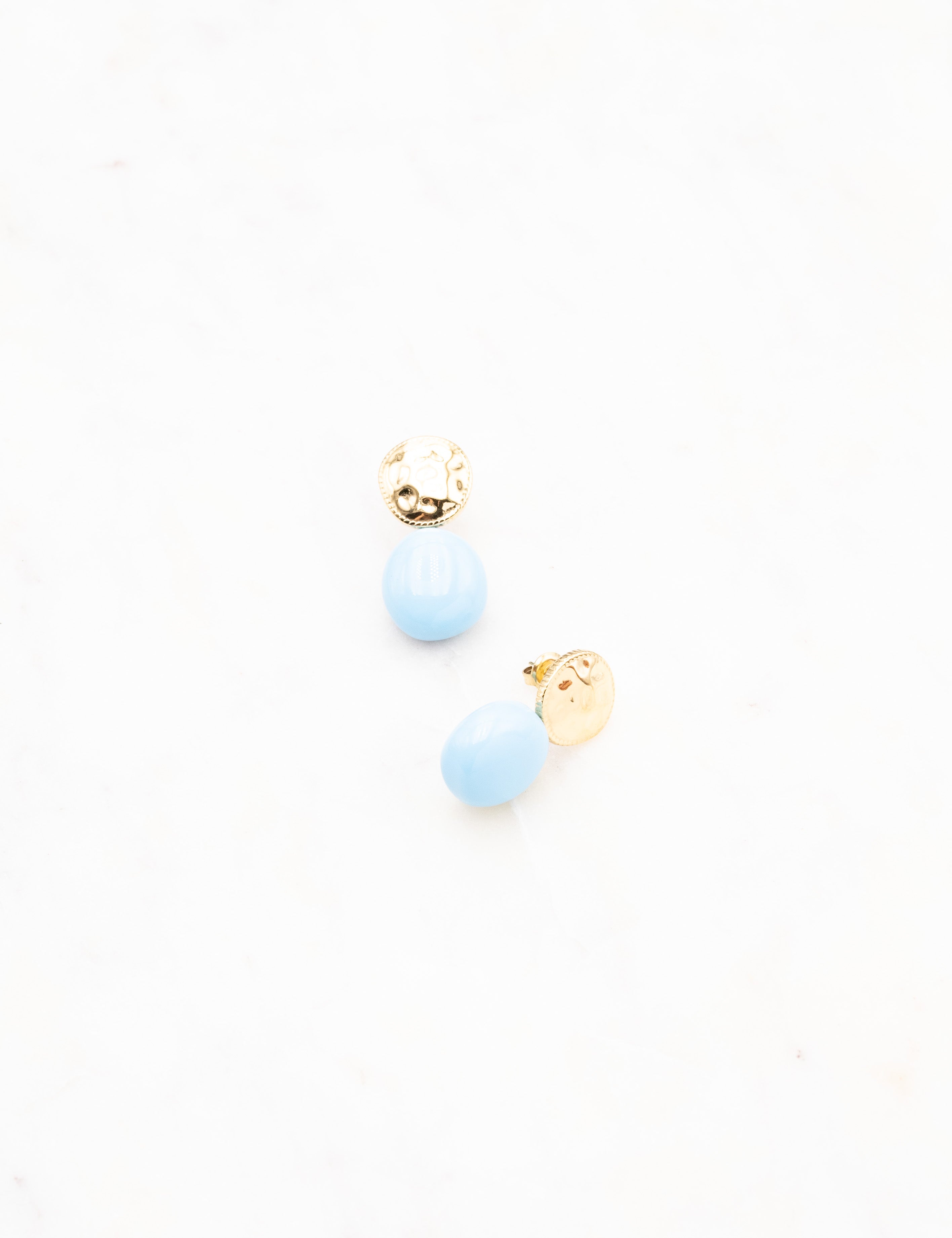 Boucles d'oreilles à puce composées d'une pièce ronde texturée et d'une perle en résine colorée.