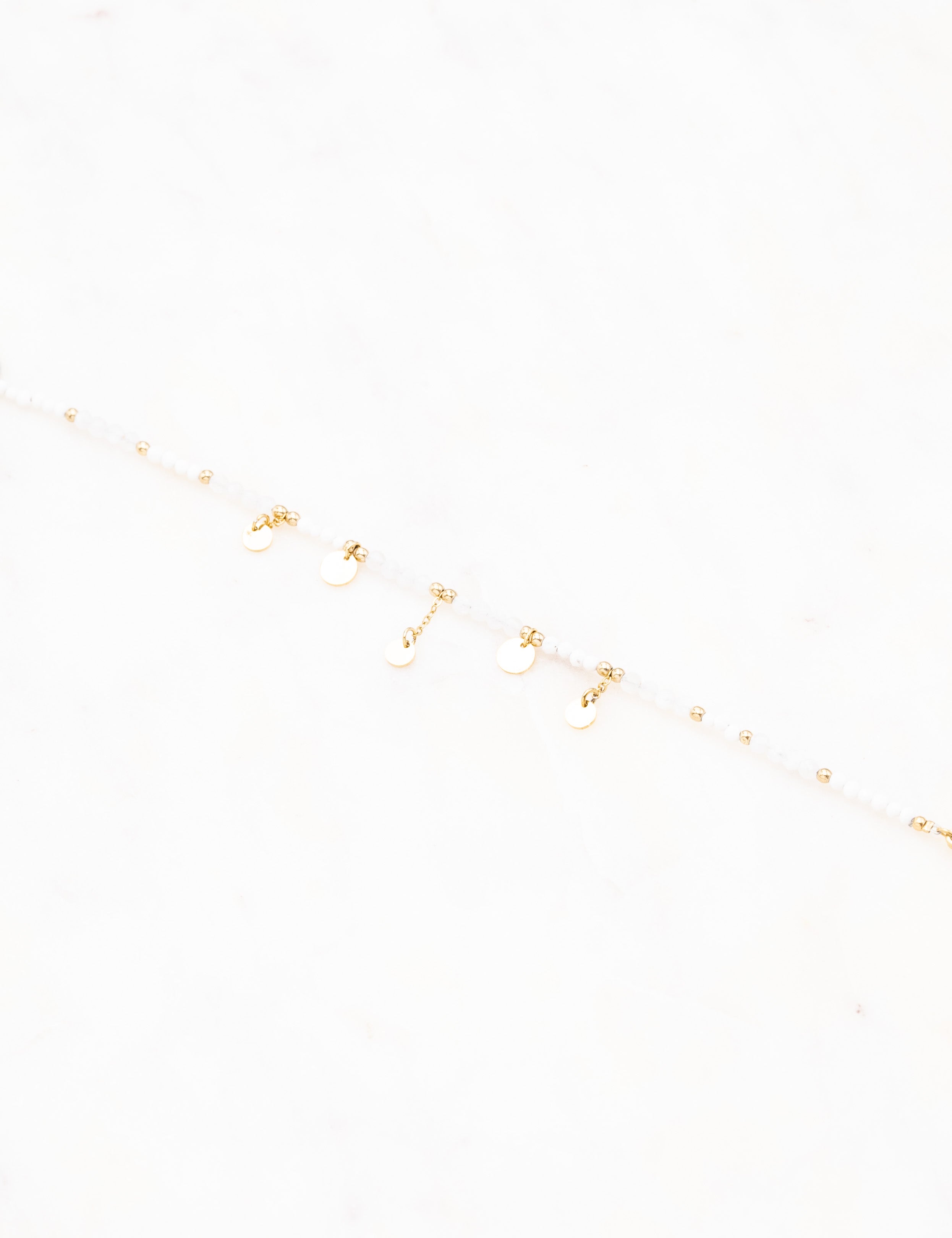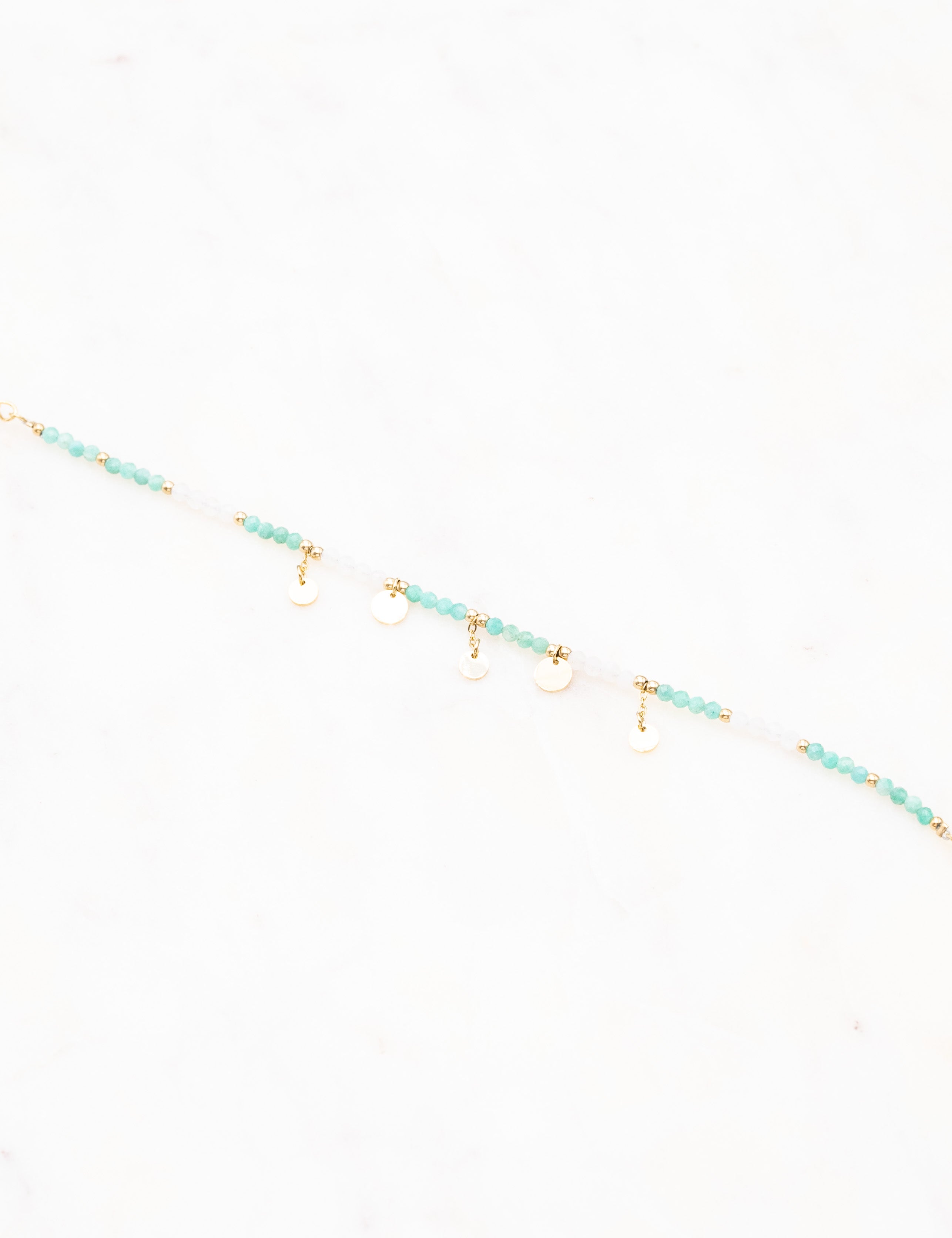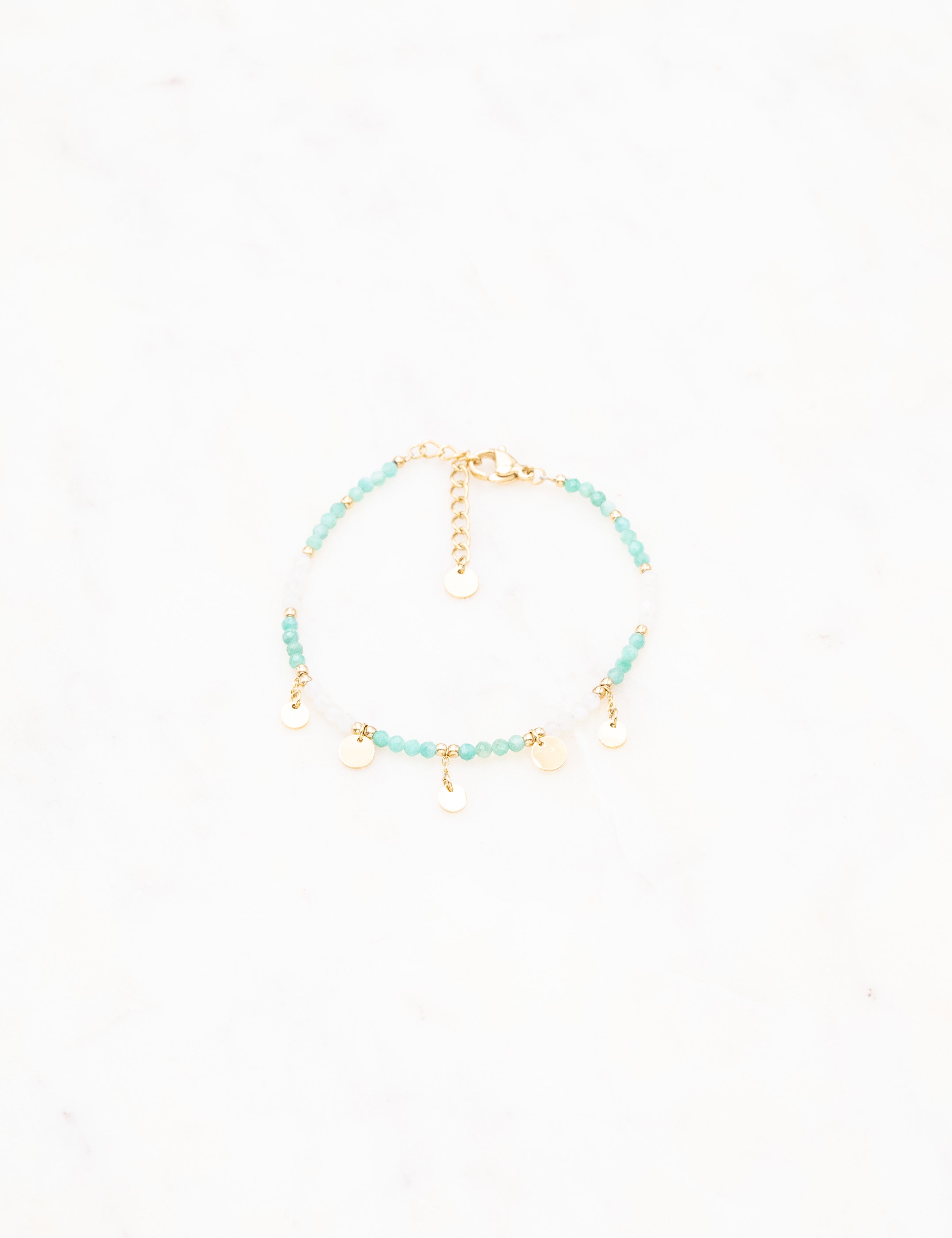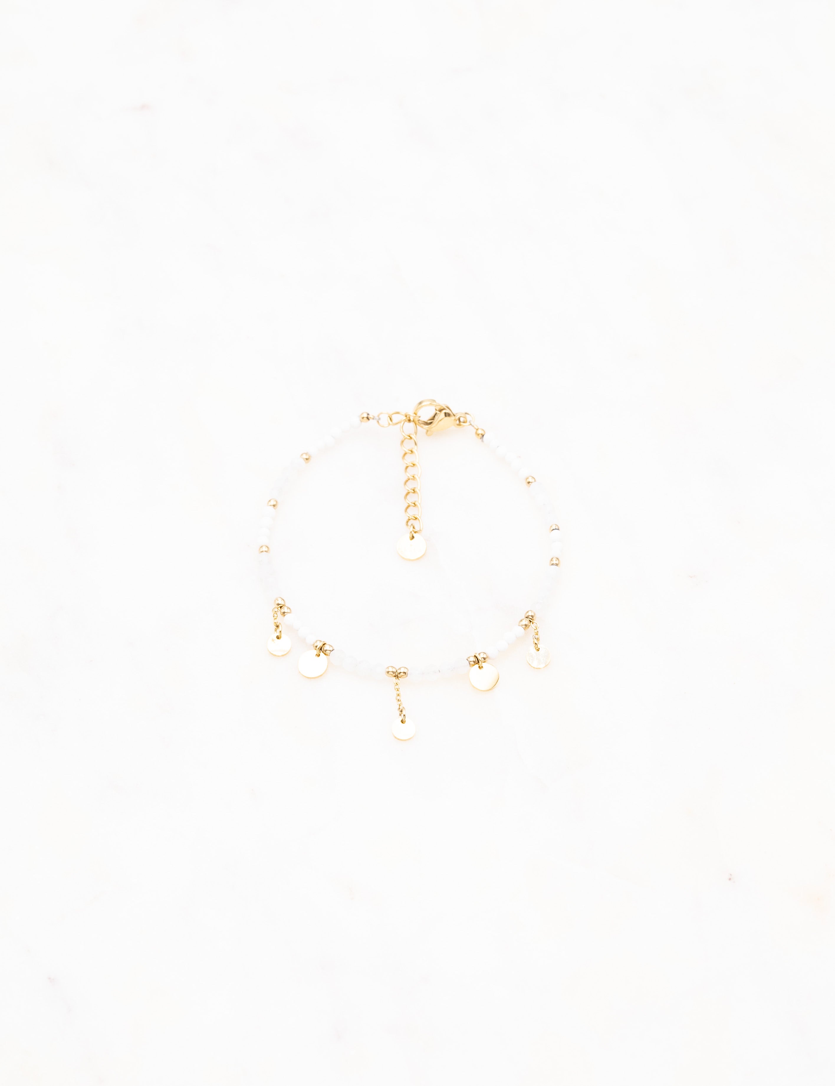 Bracelet réglable composé d'un joli enfilage de perles en pierres naturelles, de chaines ornées de pampilles rondes dorées.