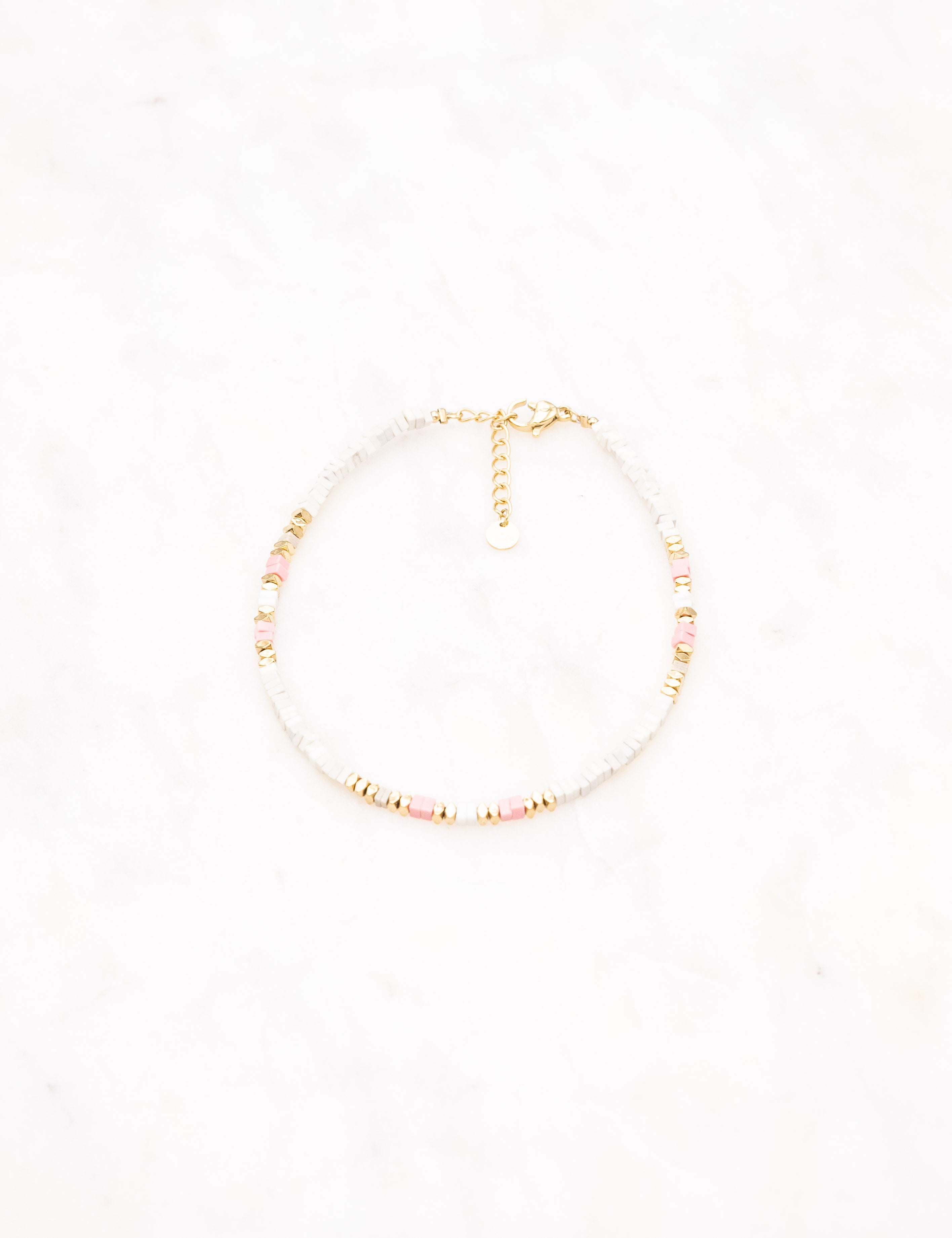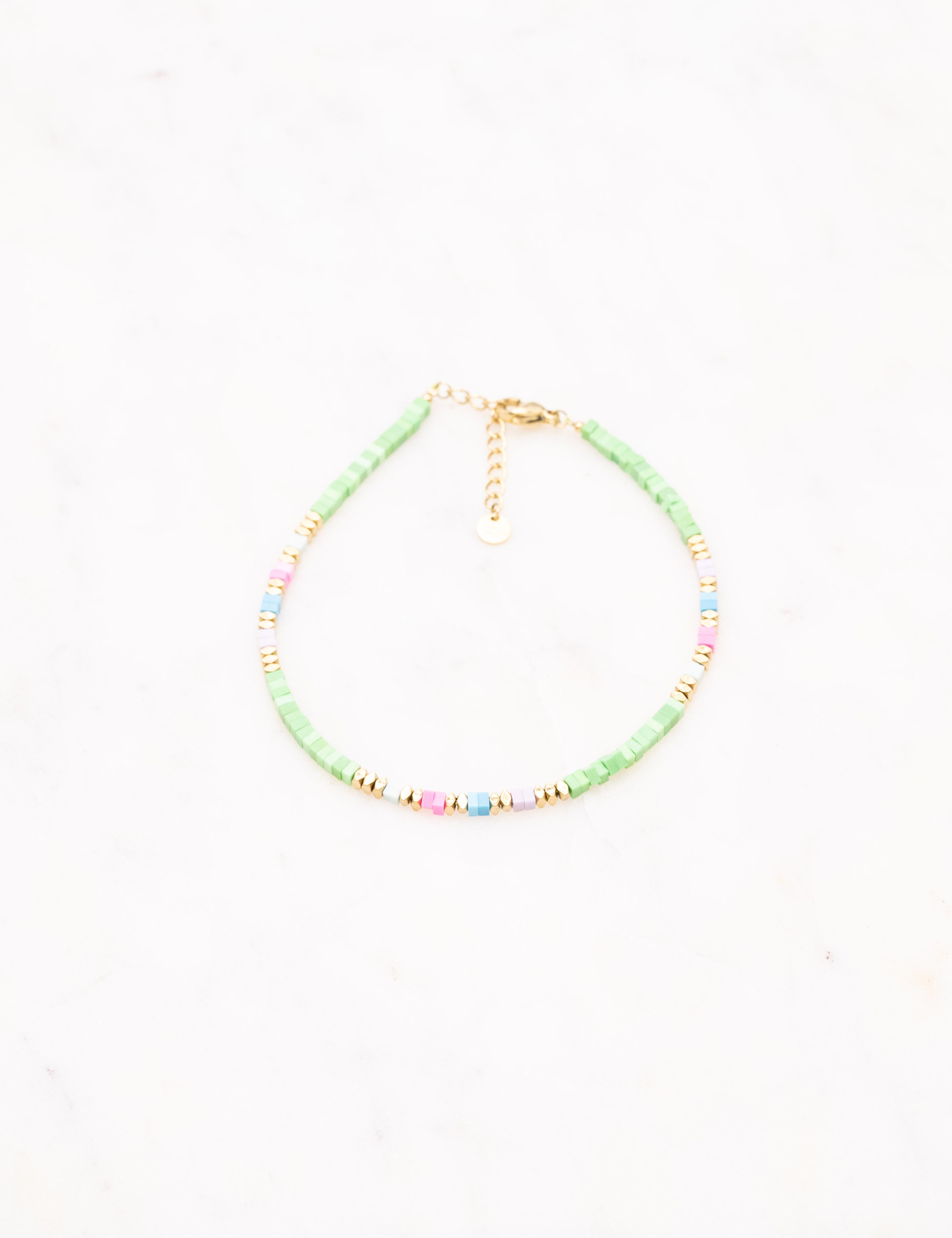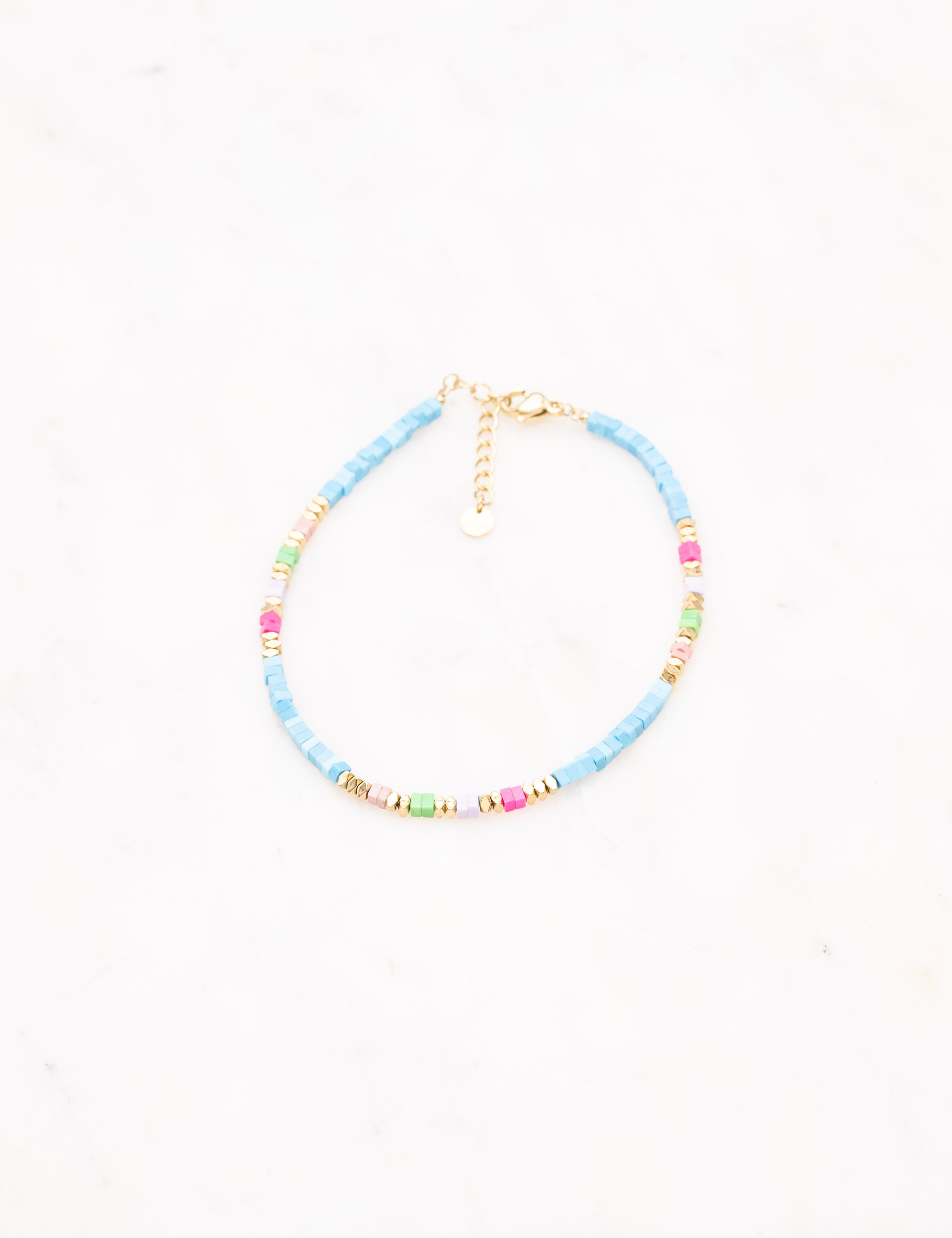 Bracelet type chevillère sur chaîne composé d'un joli enfilage de perles multicolores en pierres naturelles et perles dorées.