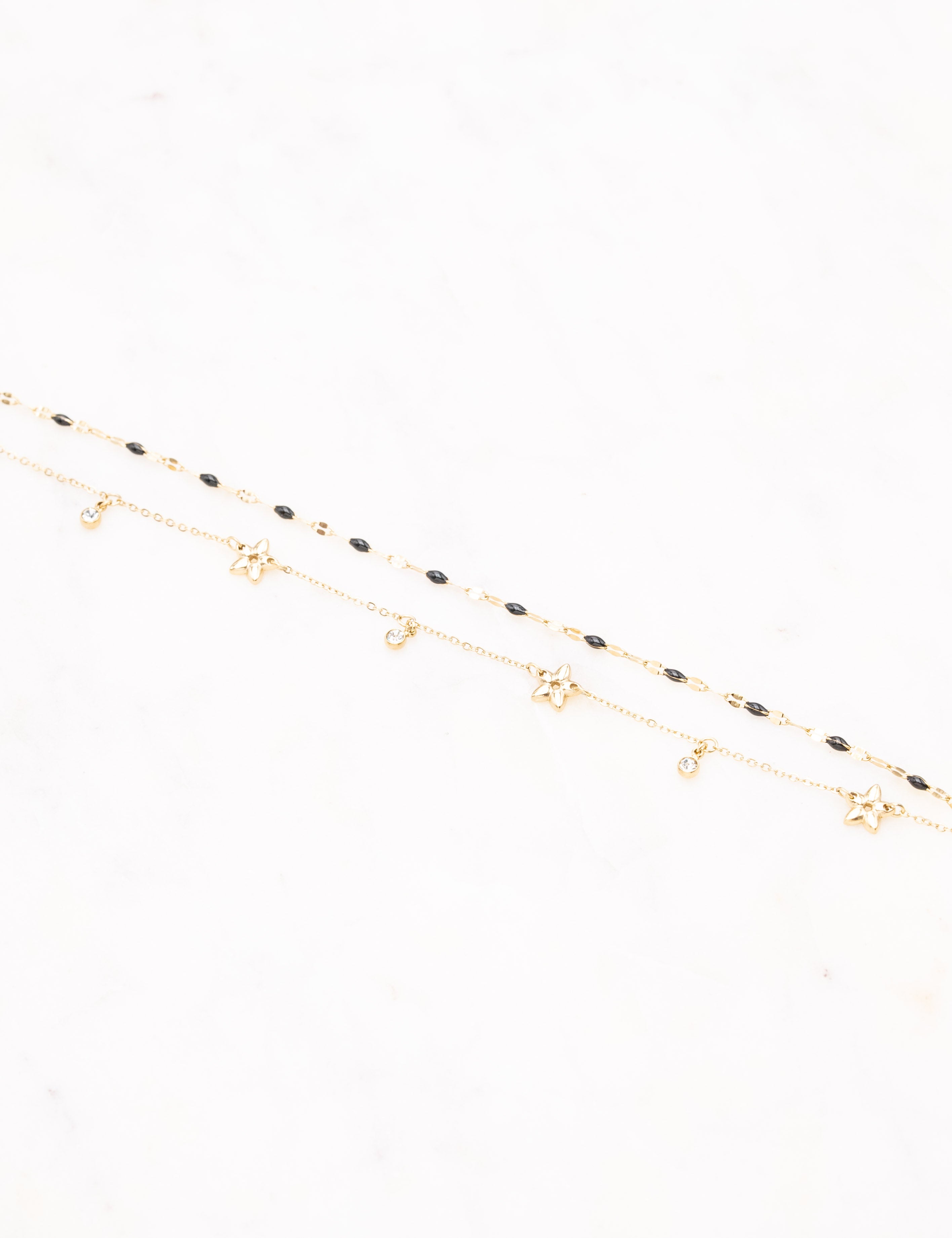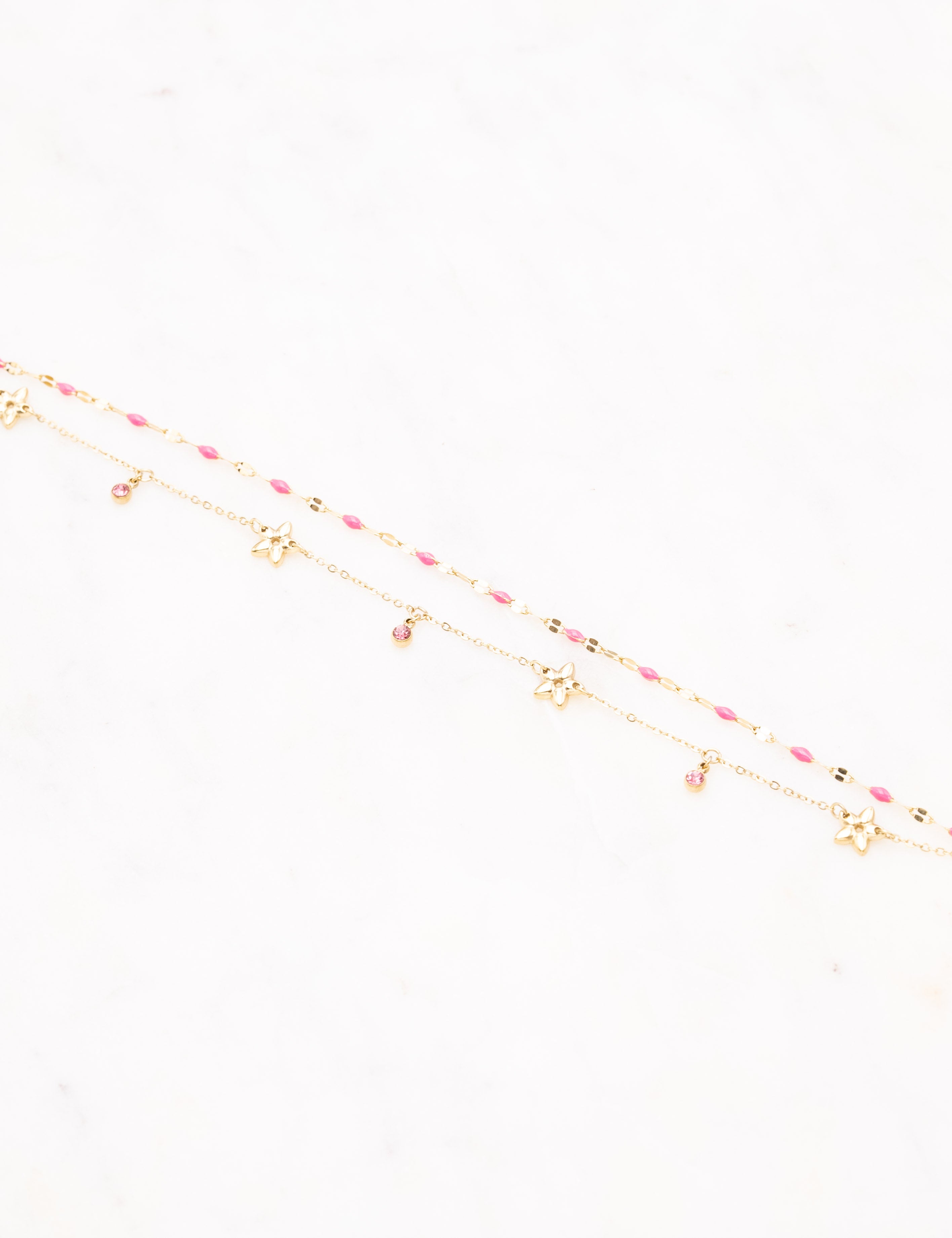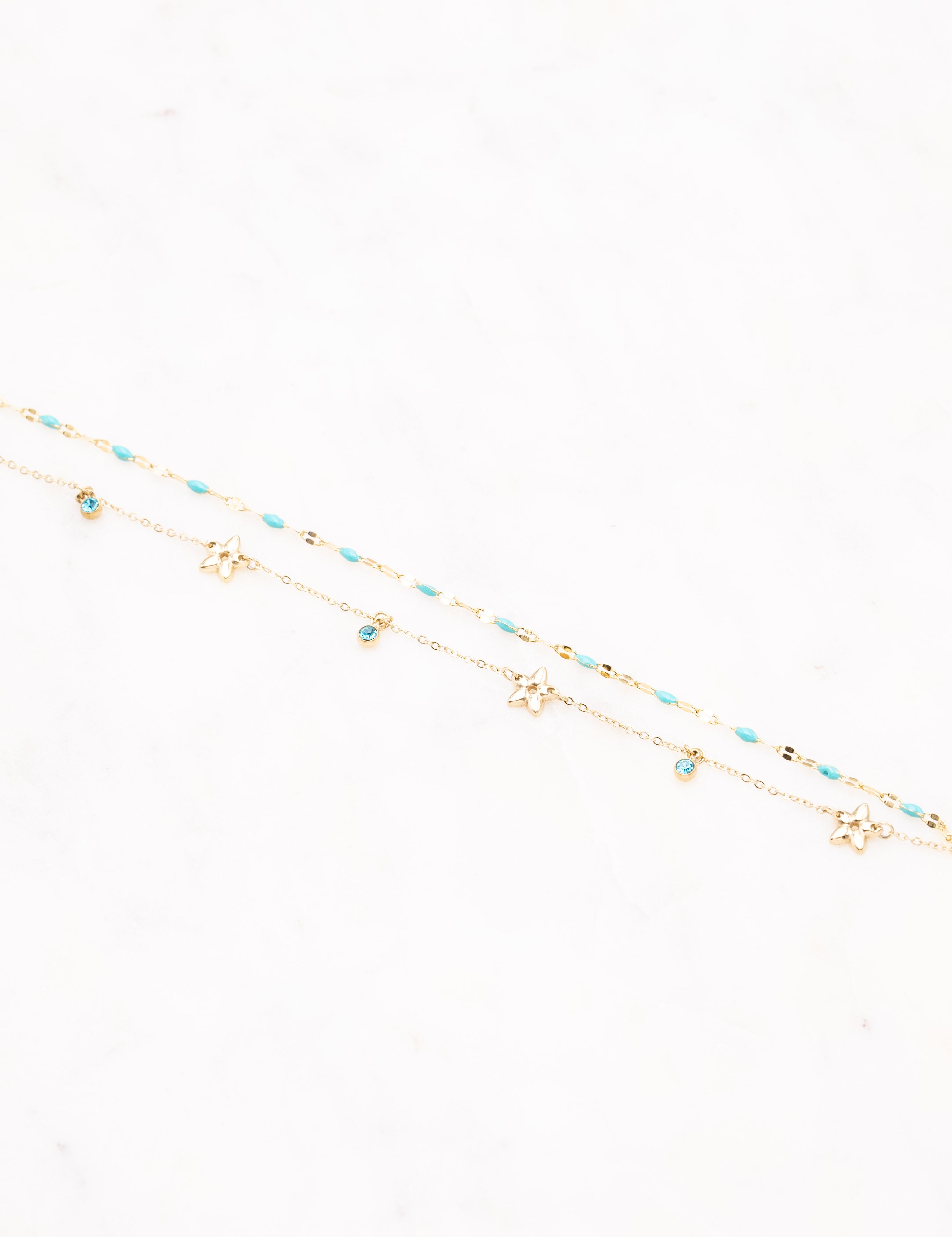 Bracelet type chevillère réglable sur chaine double rangs composé de touches émaillées colorées, de pampilles étoilées et de pampilles rondes serties d'un strass.