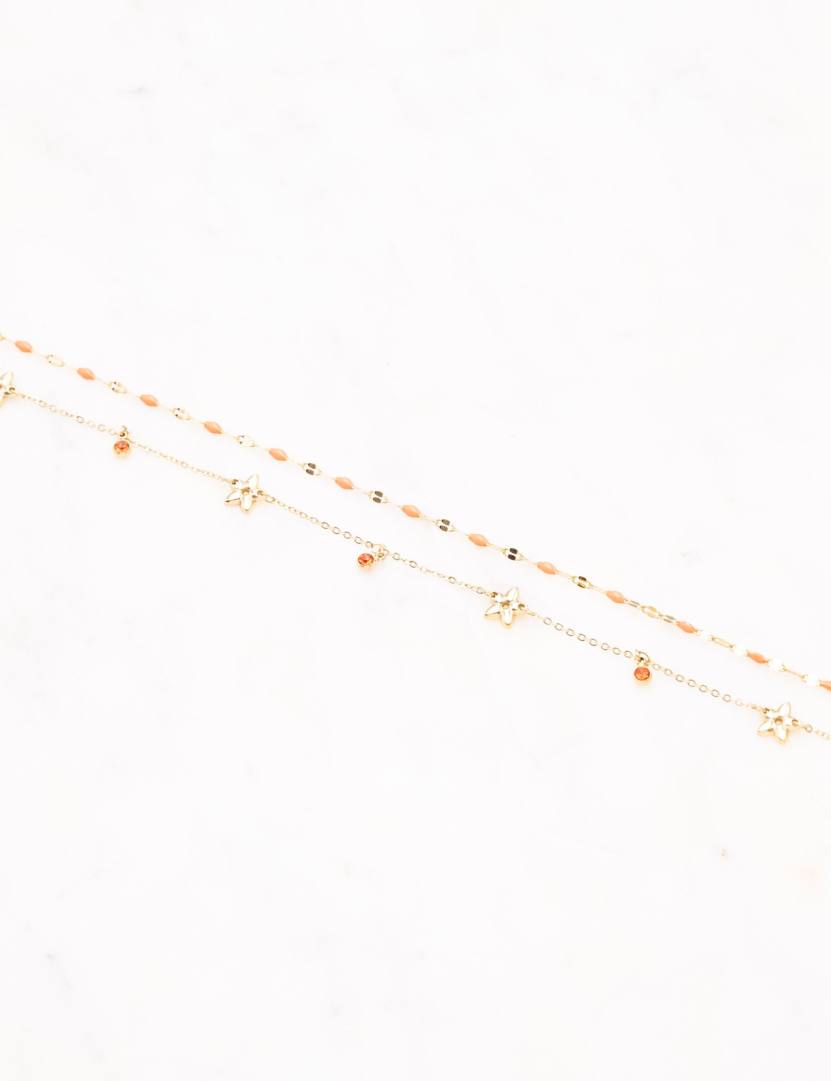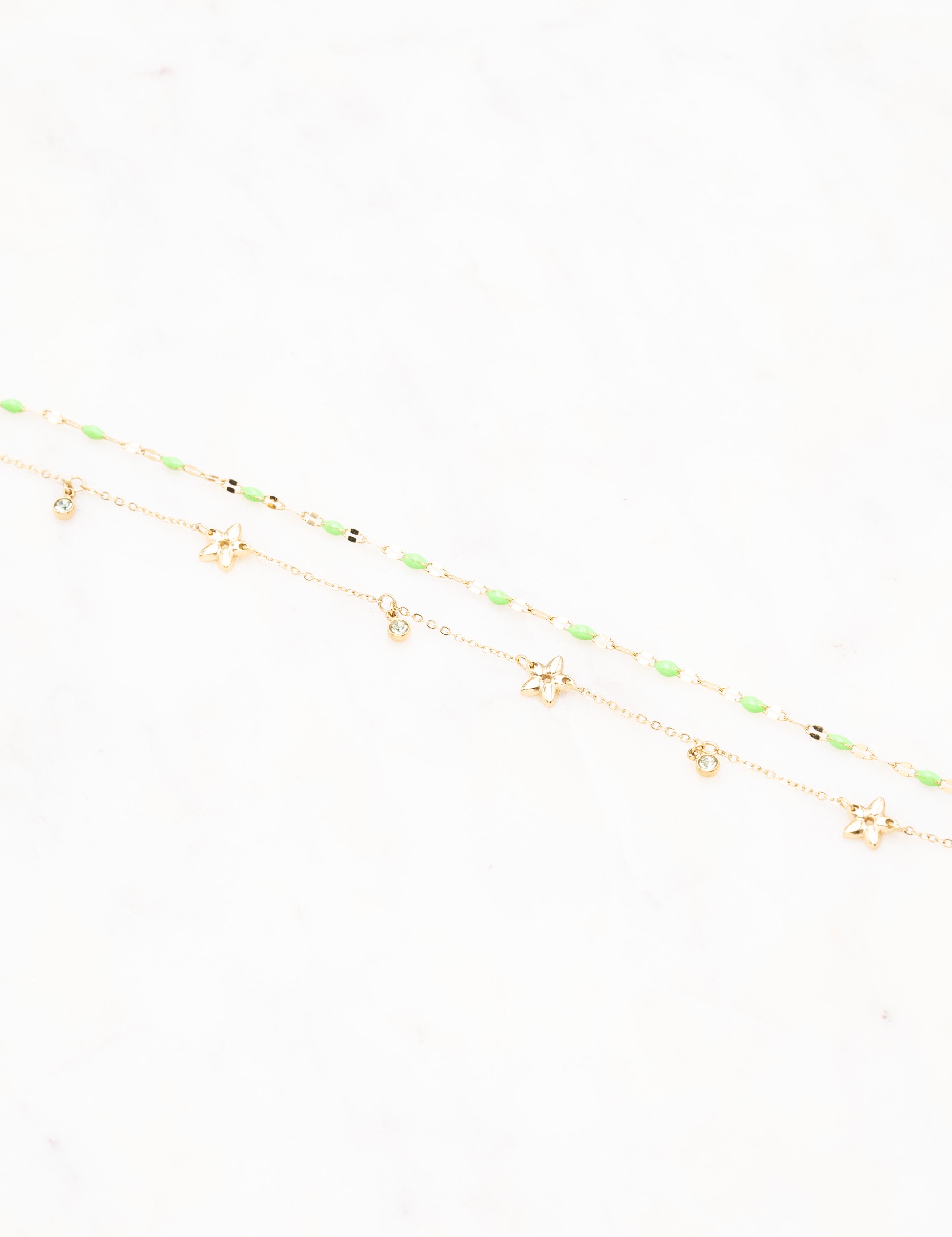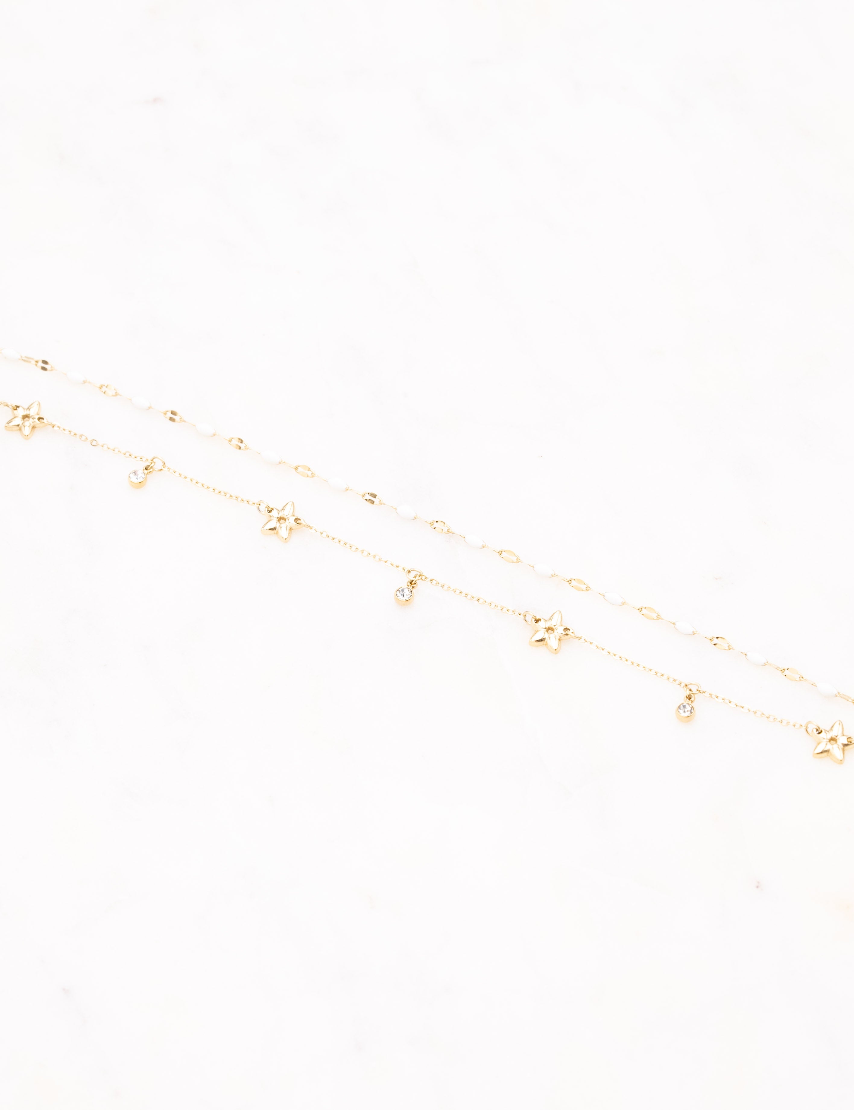 Bracelet type chevillère réglable sur chaine double rangs composé de touches émaillées colorées, de pampilles étoilées et de pampilles rondes serties d'un strass.