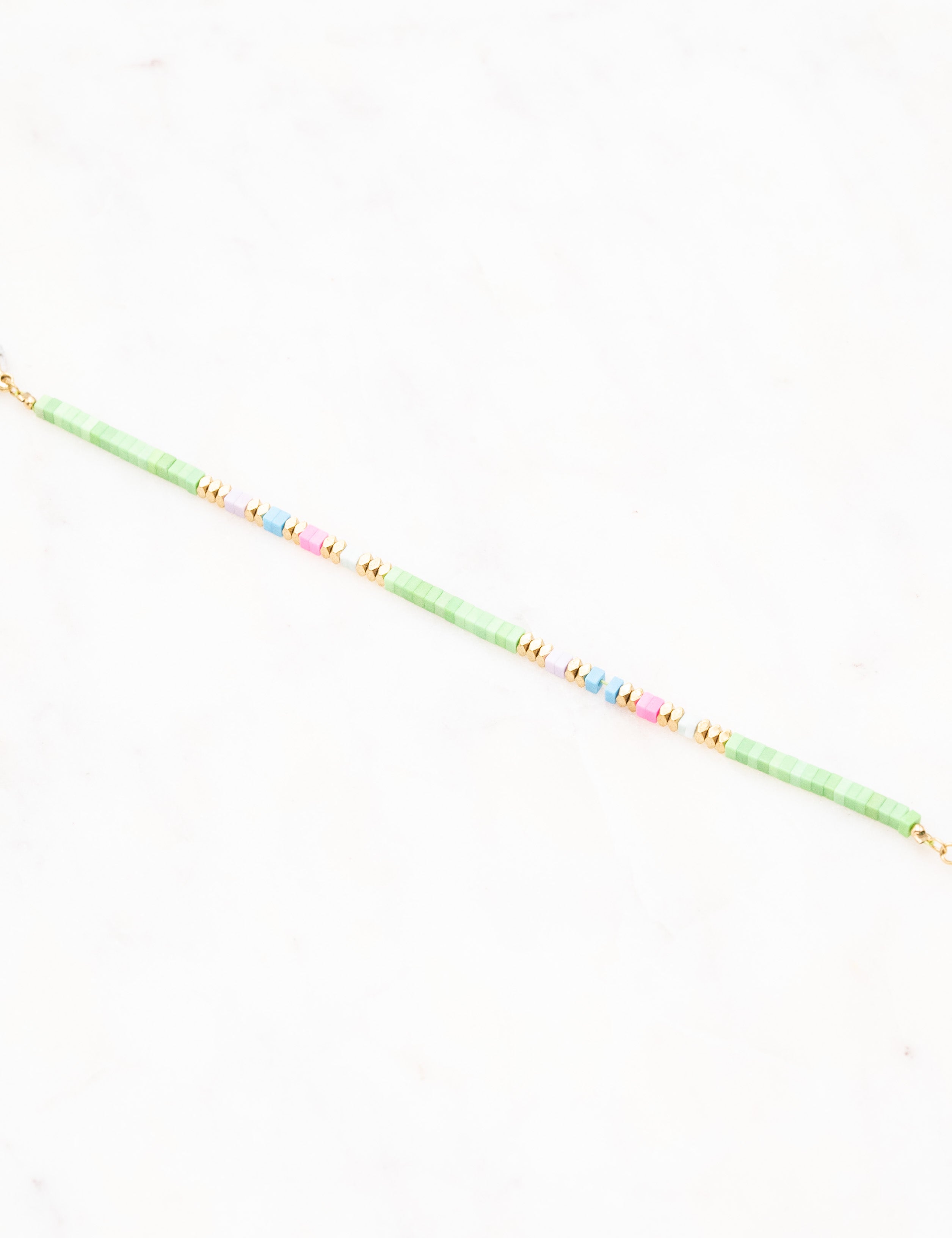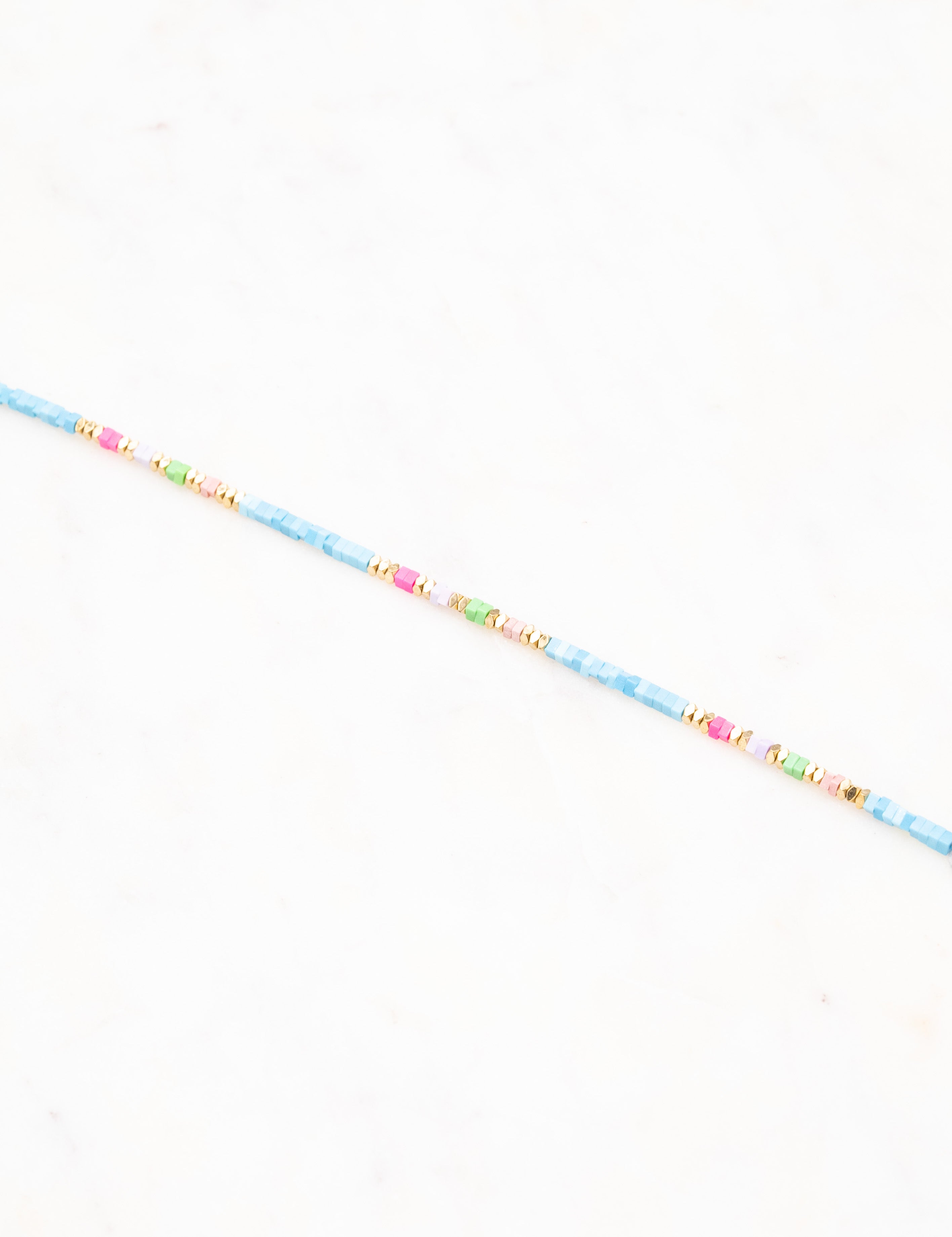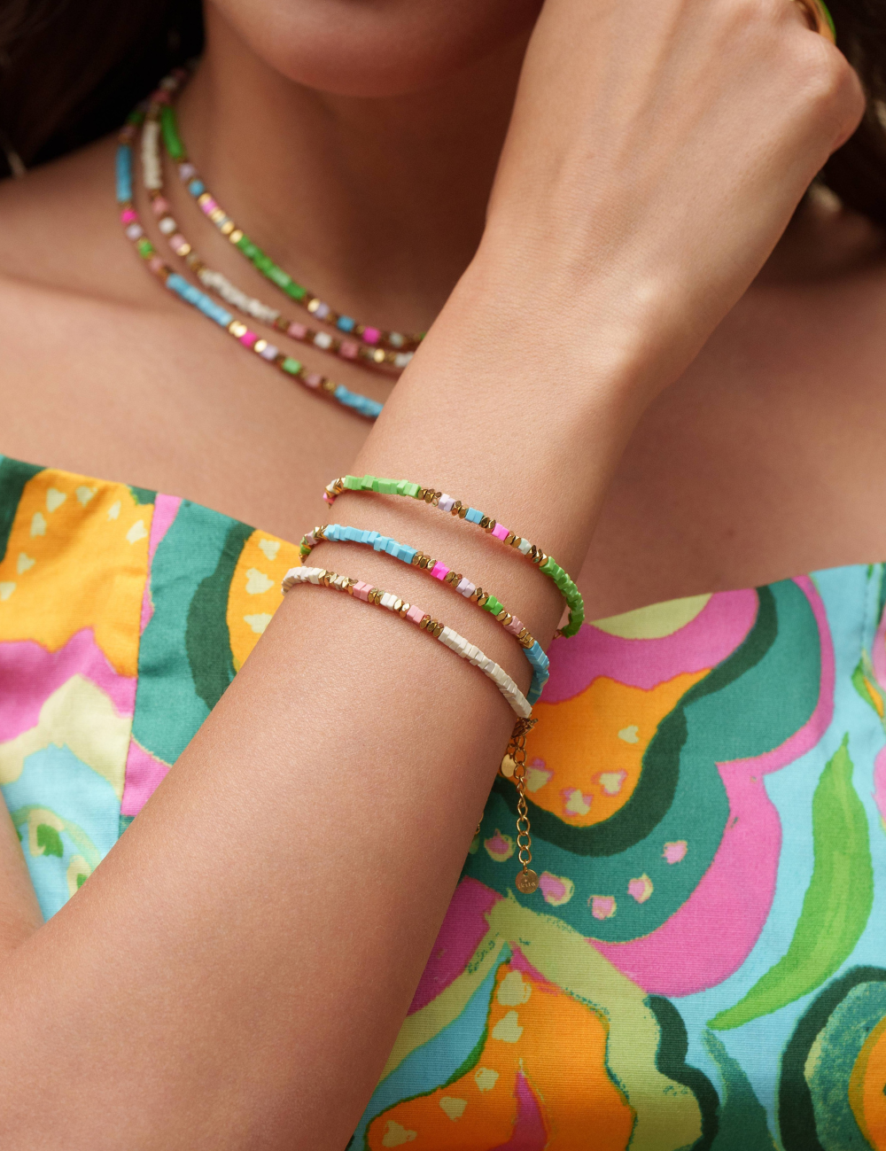 Bracelet sur chaîne composé d'un joli enfilage de perles multicolores en pierres naturelles et perles dorées.