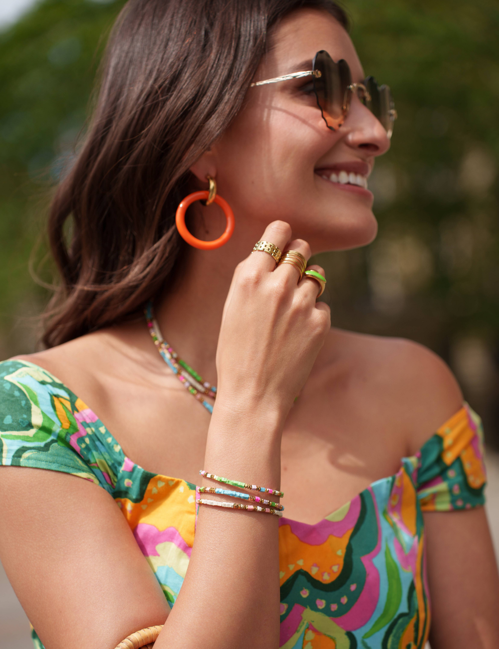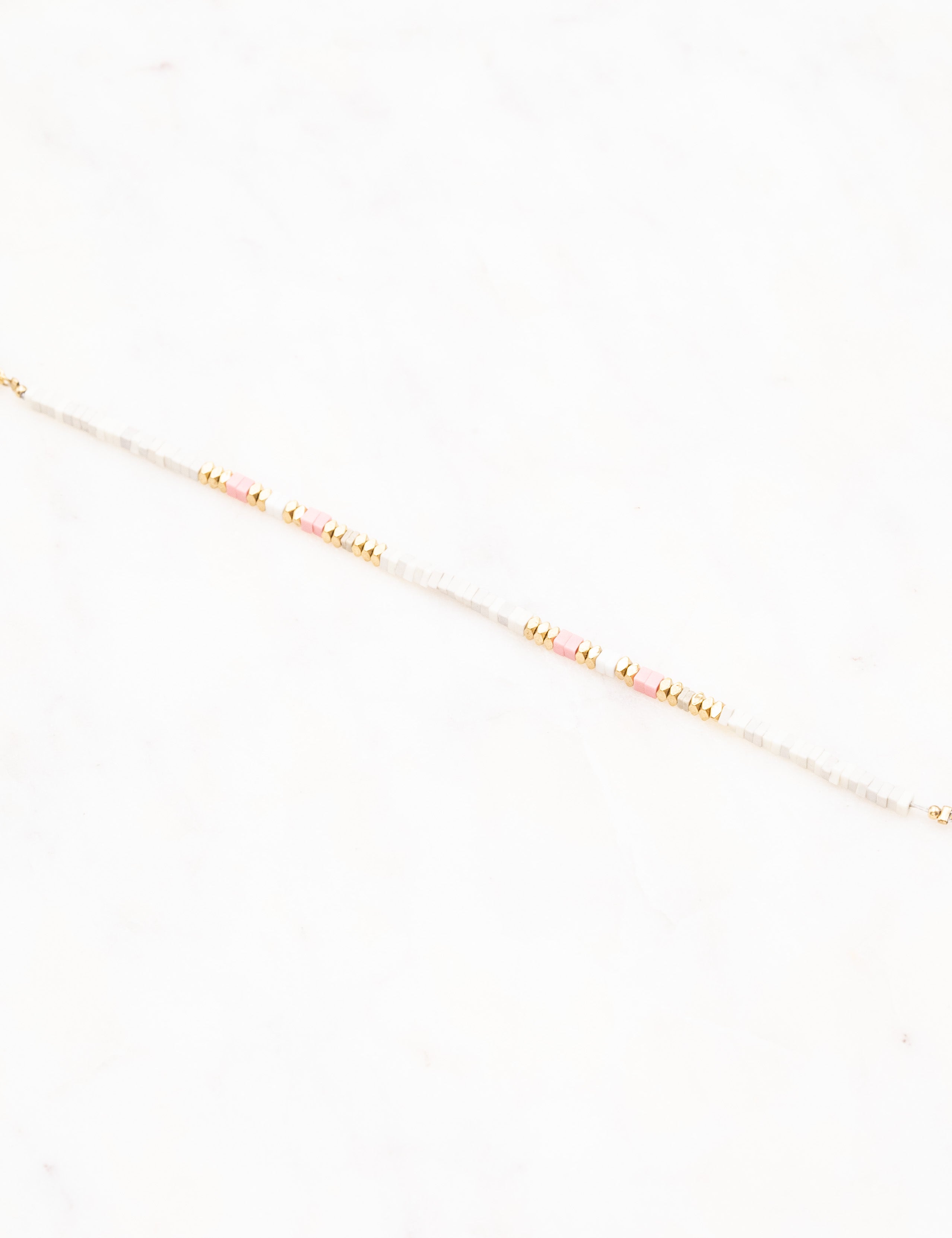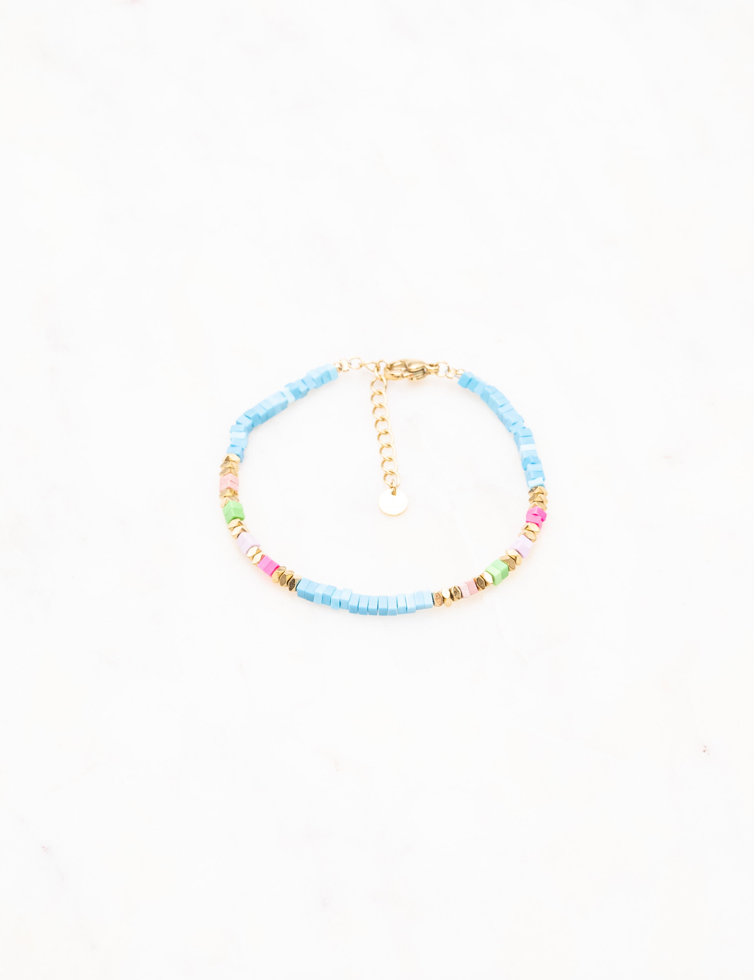 Bracelet sur chaîne composé d'un joli enfilage de perles multicolores en pierres naturelles et perles dorées.