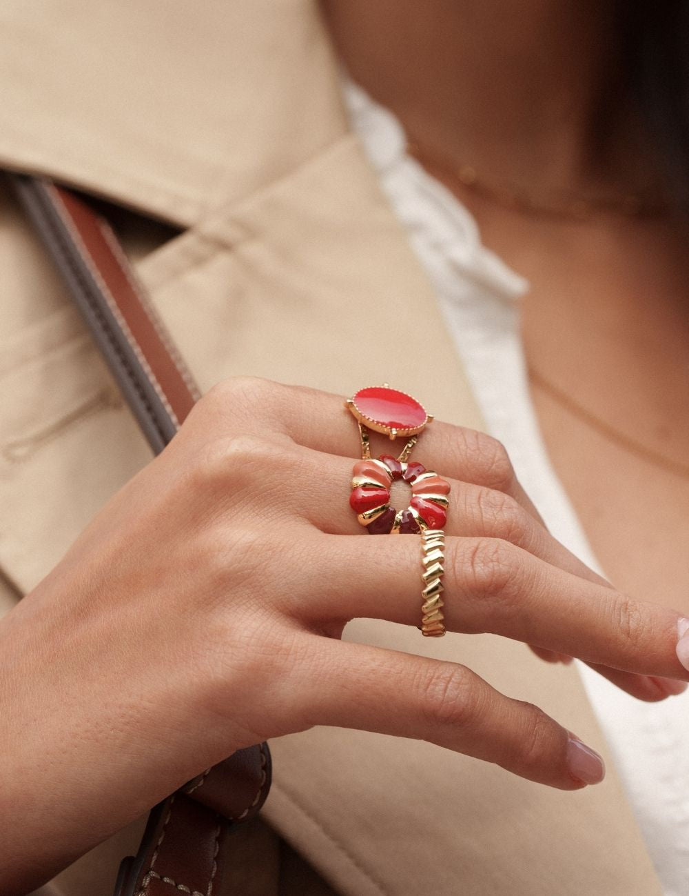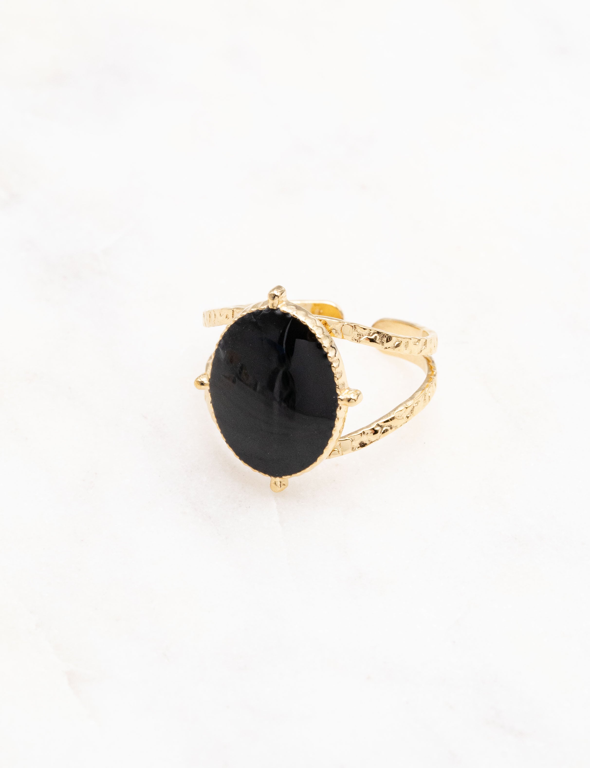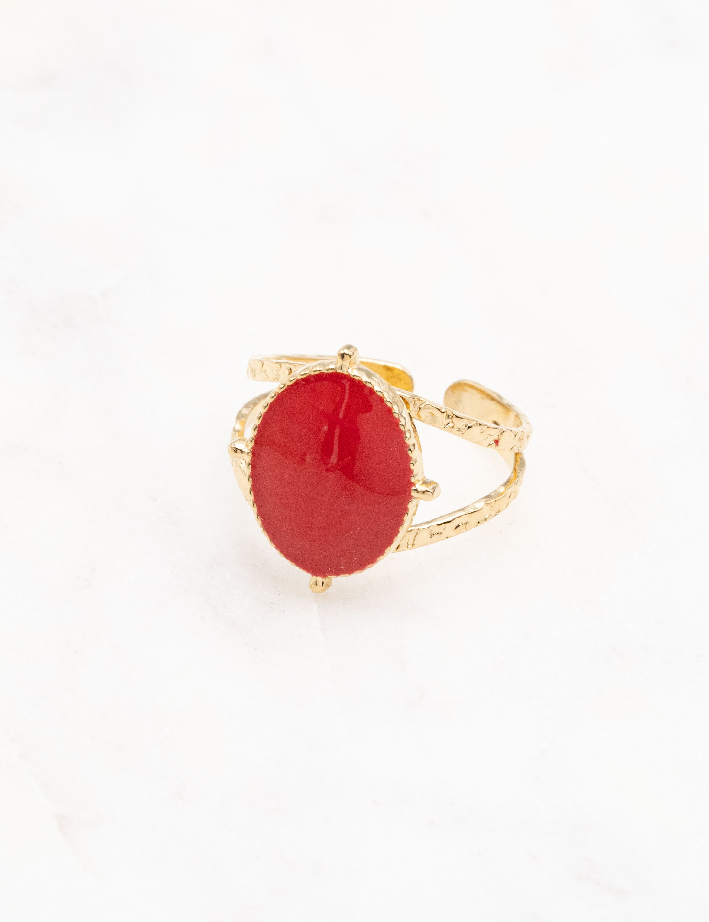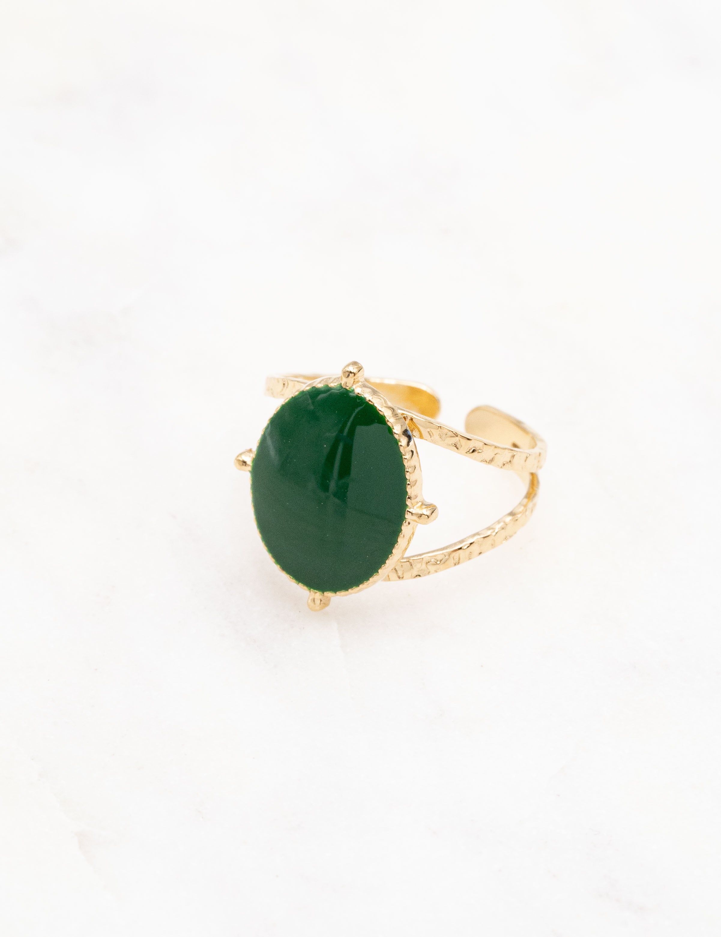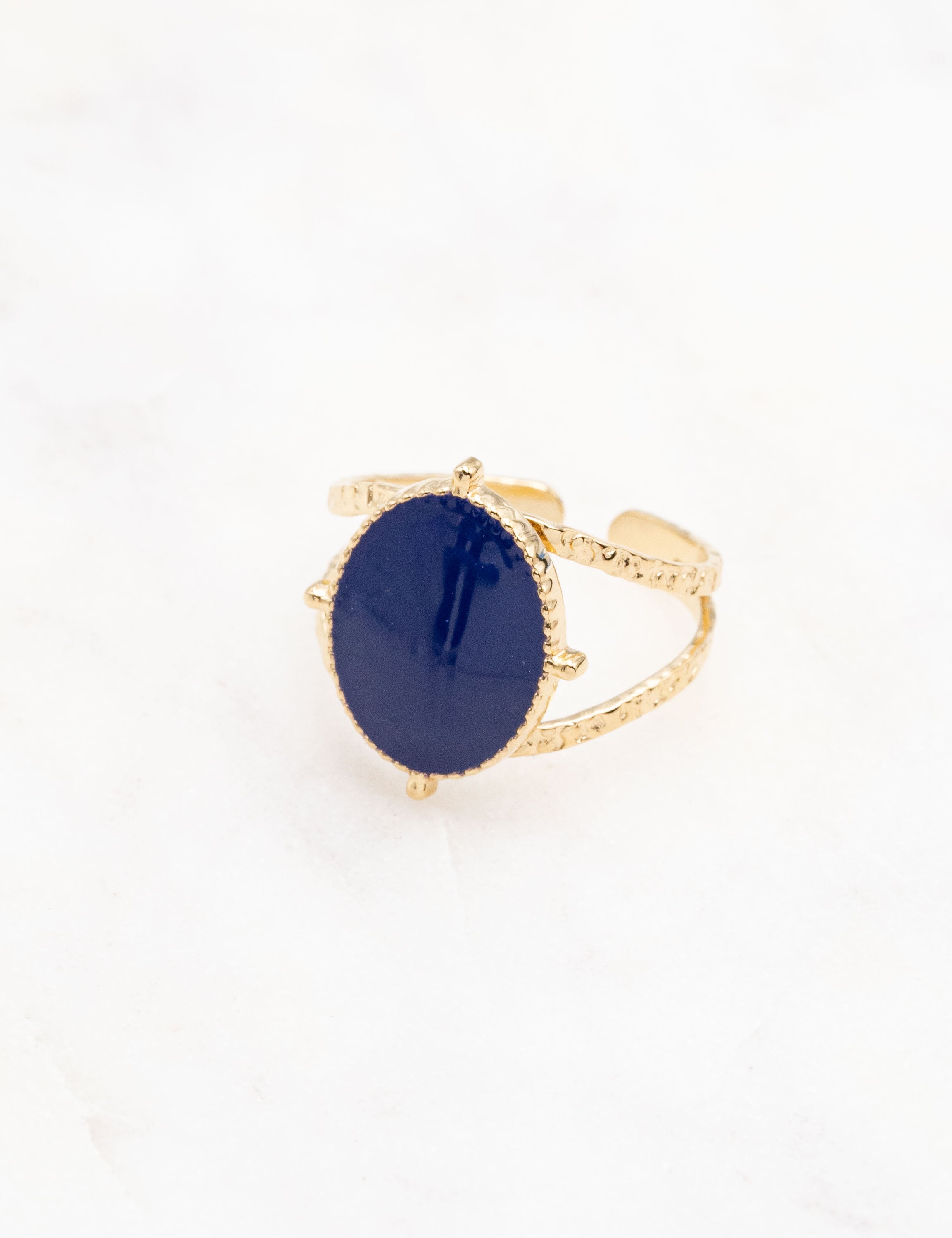 Bague ajustable double rangs martelés composée d'une pièce ovale émaillée colorée.