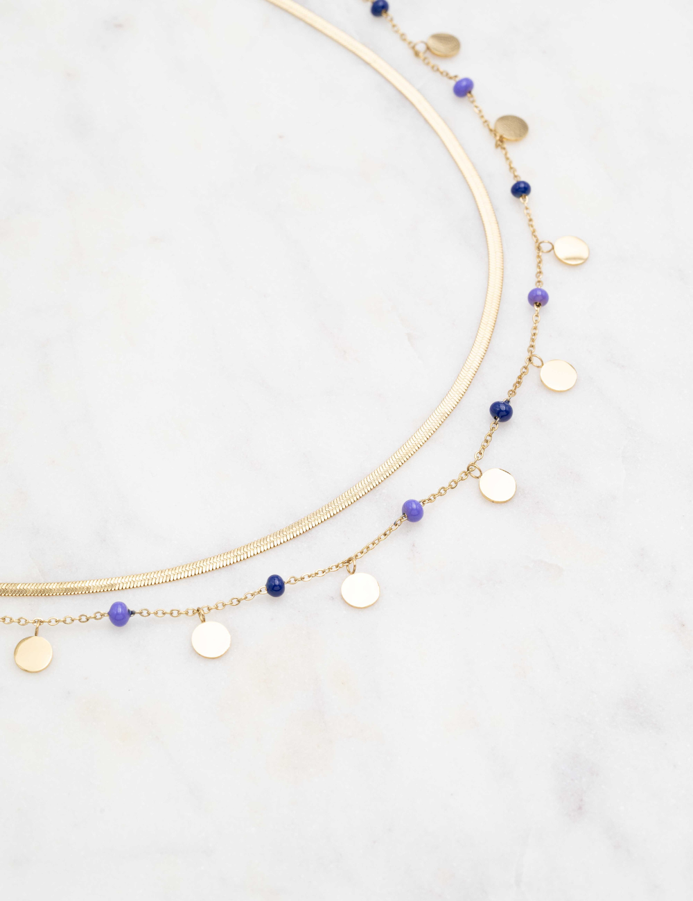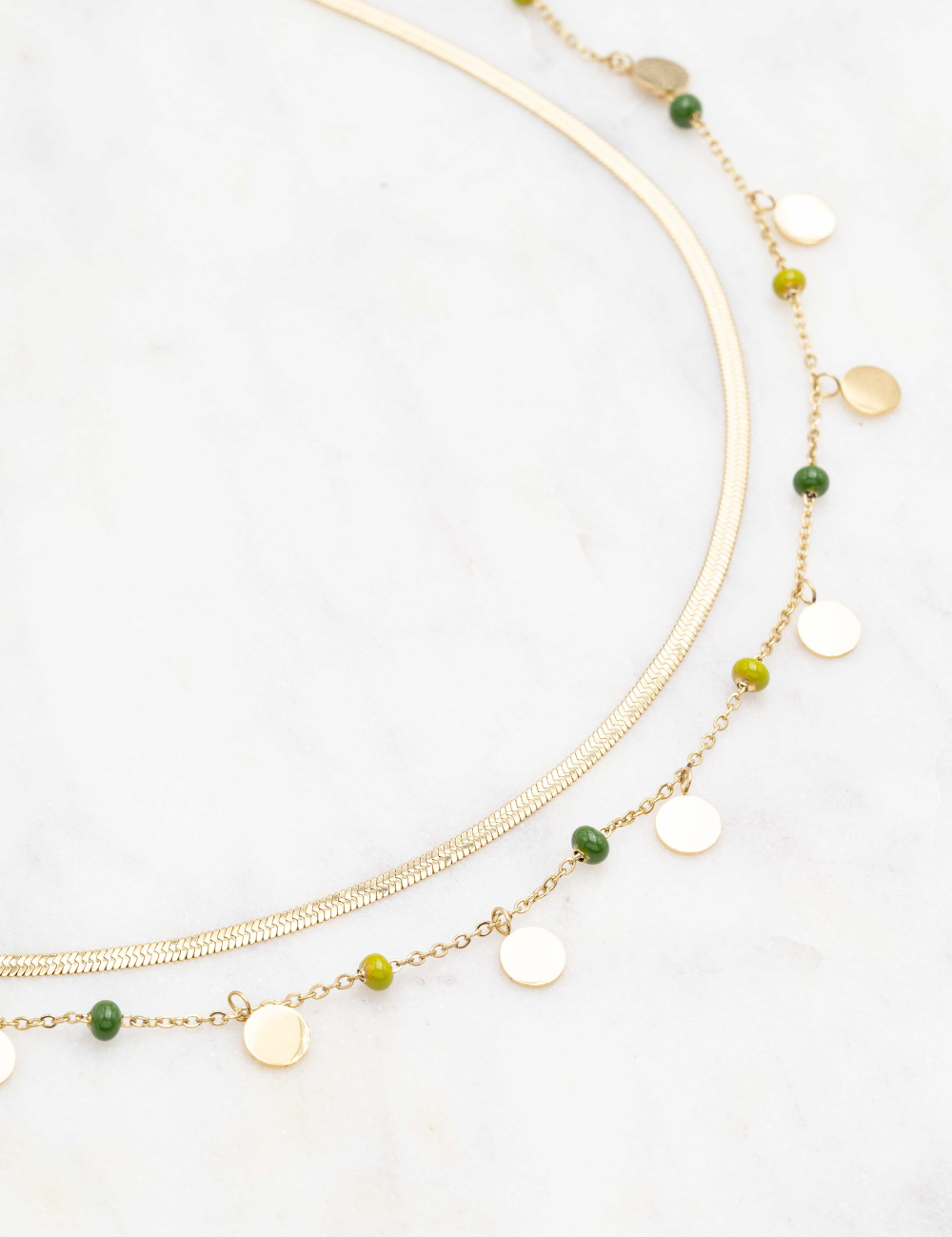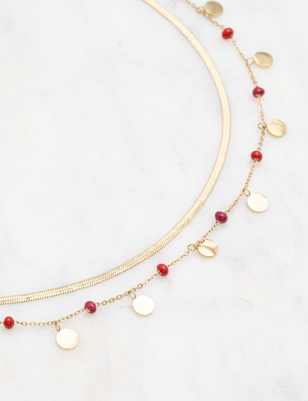 Collier réglable double rangs sur chaîne avec maille miroir composé de pampilles rondes et de petites perles émaillées colorées.